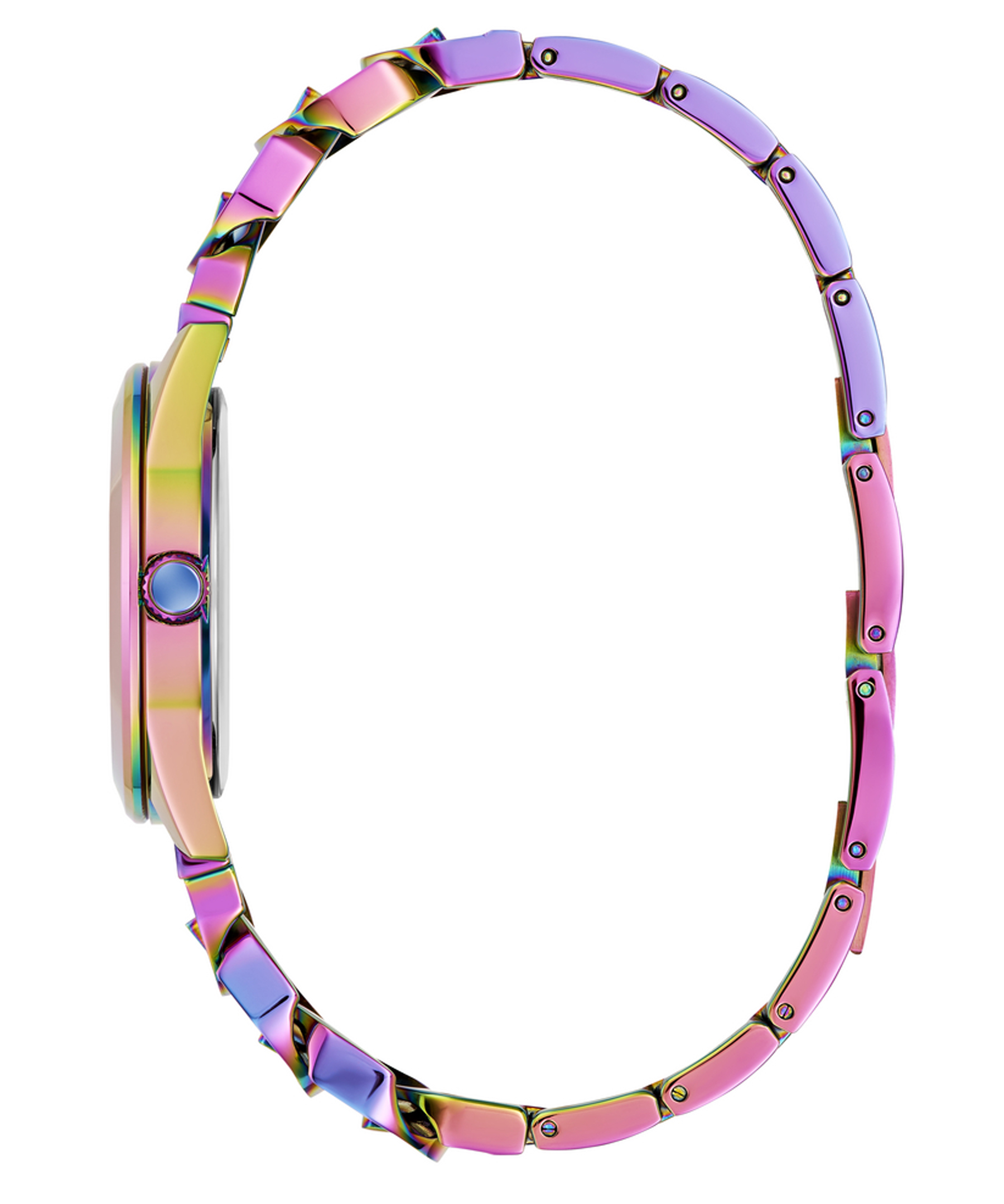 Благодаря надежному кварцевому механизму Miyota, часы обеспечивают безупречную точность. Стальной корпус и браслет с перламутровым покрытием радужного цвета придают часам роскошный вид, а декорированные кристаллами элементы на браслете переливаются, привлекая внимание.