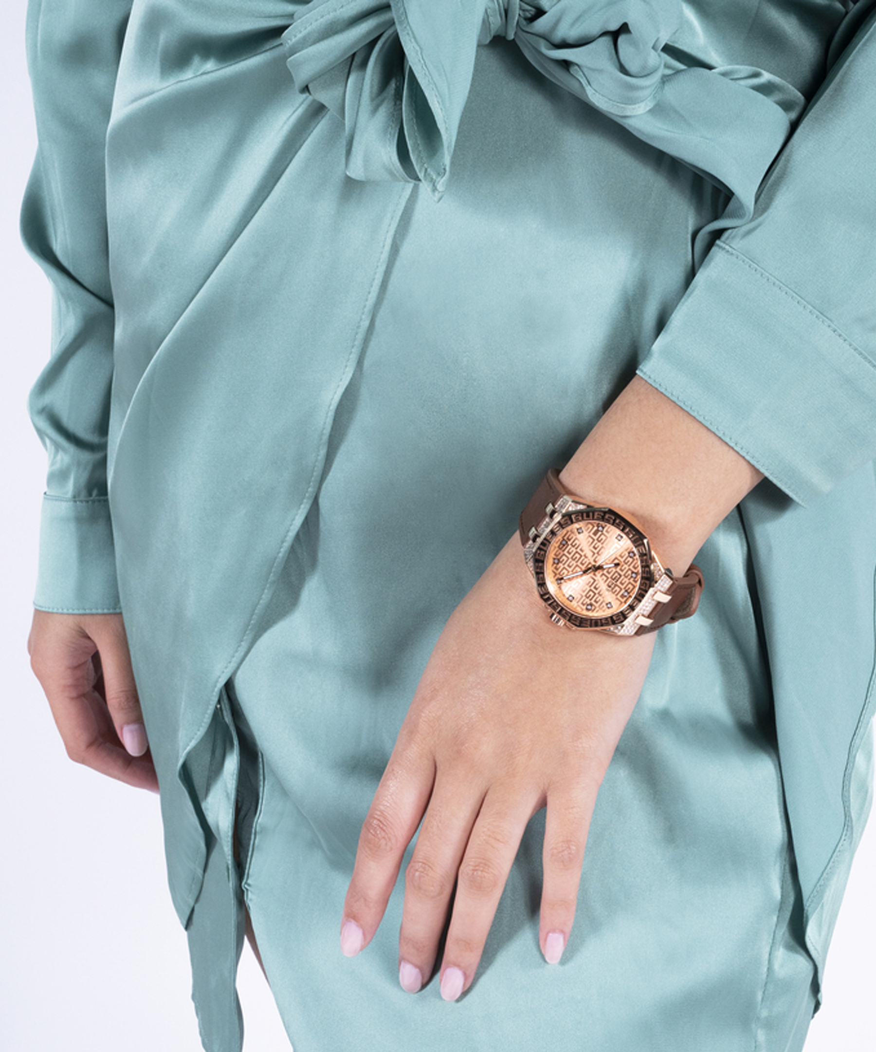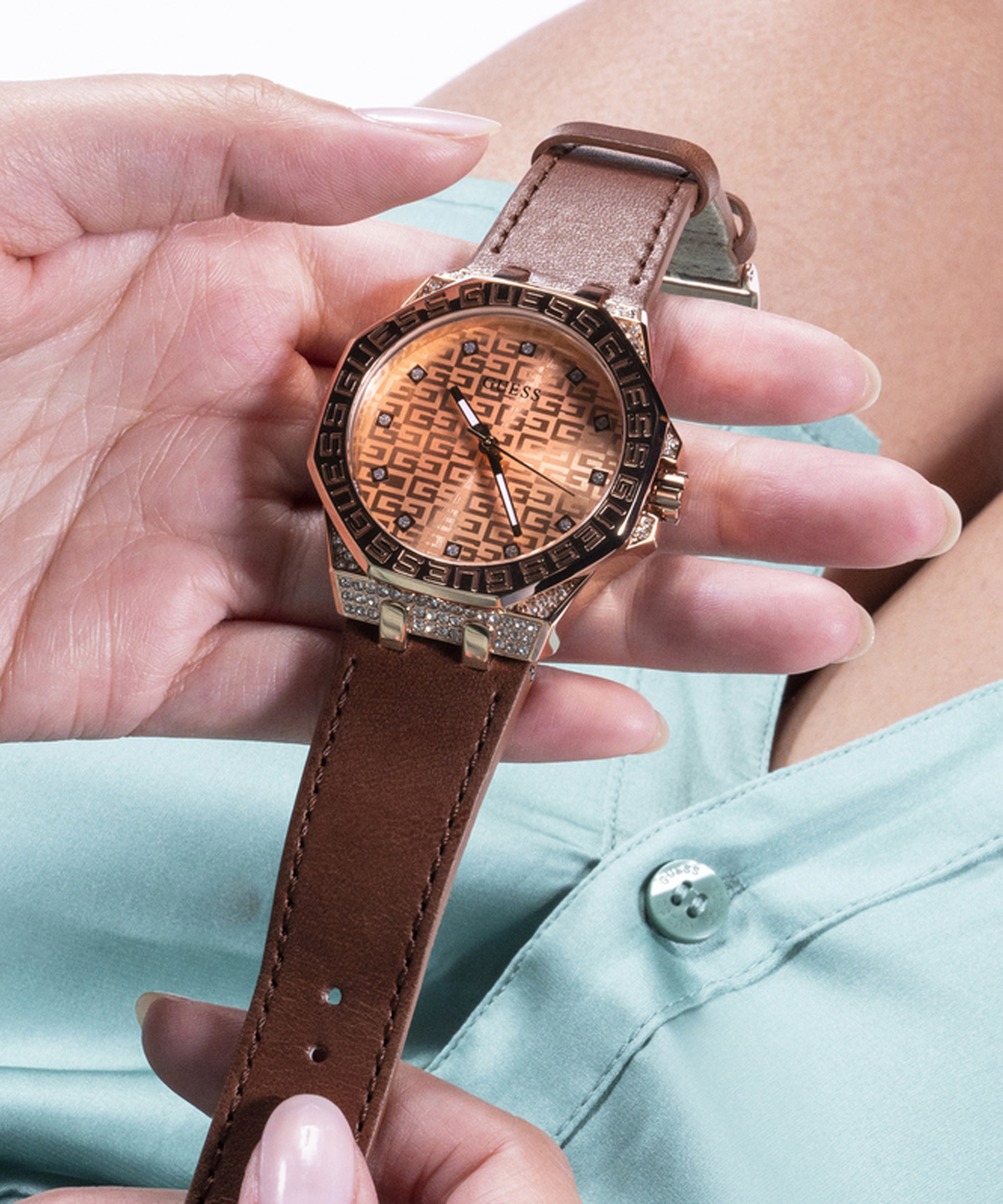 Коричневый кожаный ремешок с классической застежкой пряжкой придает нотки изысканности, а стильный безель, декорированный названием бренда, подчеркивает высокий статус обладательницы этих часов. Золотистый циферблат, украшенный блестящими камнями, выполняемыми роль временных меток, придает часам особый шарм.