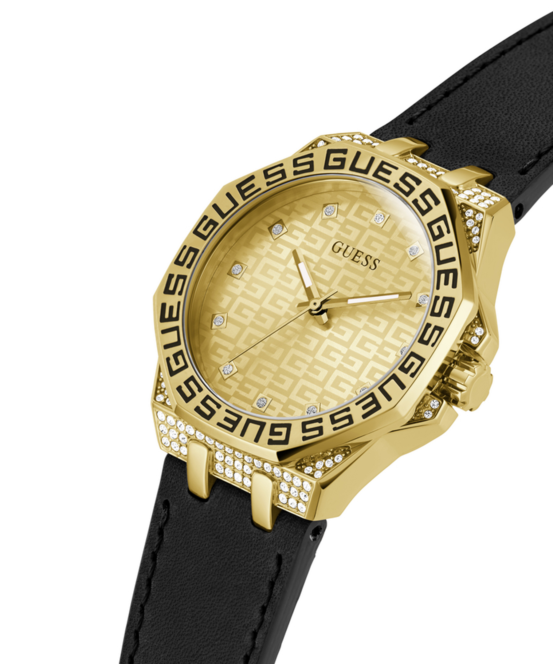 Женские наручные часы GUESS GW0547L3 из коллекции LADIES TREND. В часах установлен надежный кварцевый механизм Miyota. Стальной с покрытием Gold Tone корпус. Диаметр корпуса - 38 мм, толщина - 10 мм. Ширина крепления - 22 мм. Черный кожаный ремешок с классической застежкой пряжкой. Безель декорирован названием бренда. На золотистом циферблате - камни, выполняющие роль временных меток. Водозащита - 5 АТМ.-