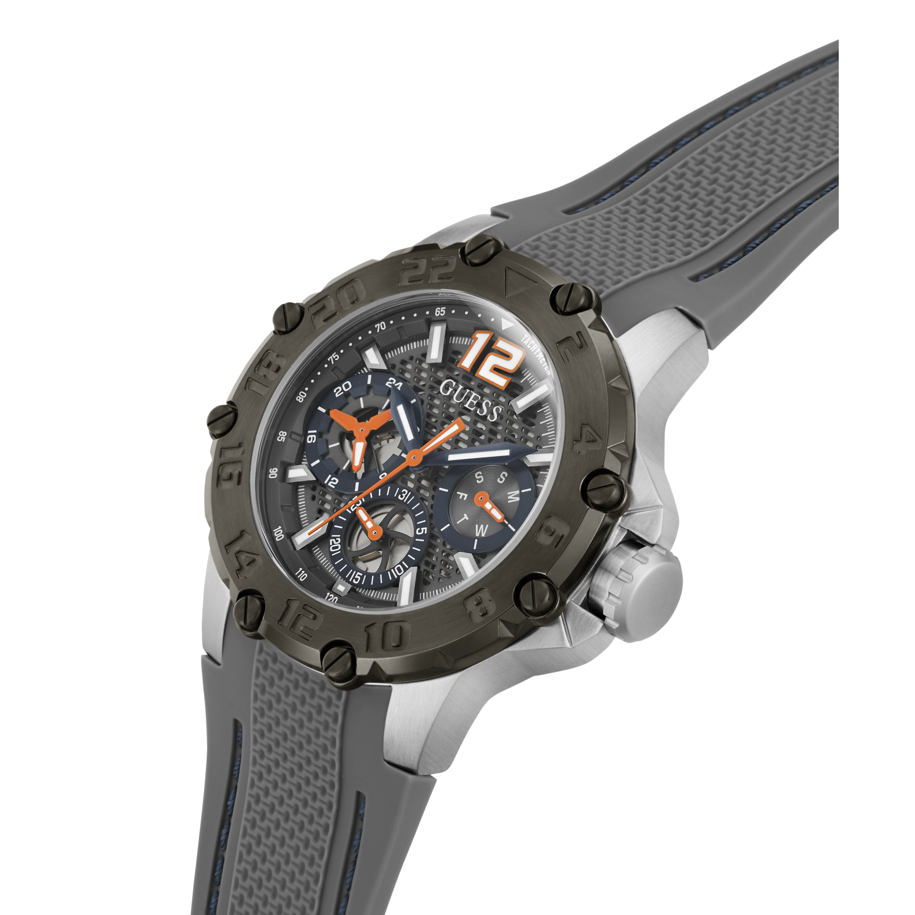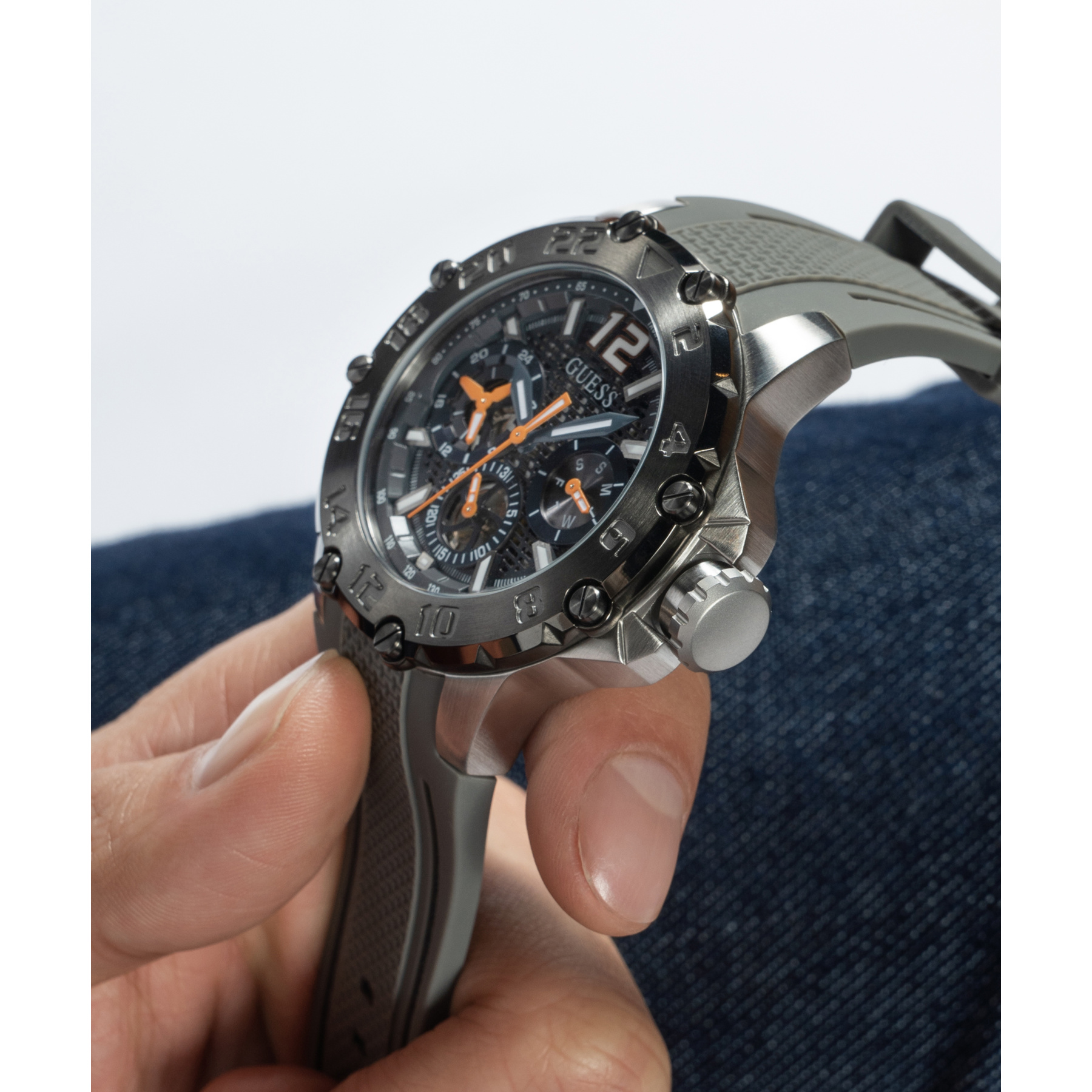 Мужские многофункциональные часы GUESS GW0640G1 из коллекции MENS SPORT. В часах установлен надежный кварцевый механизм Miyota. Серый стальной корпус диаметром 46 мм, толщина корпуса - 12,4 мм. Силиконовый ремешок с классической застежкой - пряжкой. Стрелки и временные метки с люминесцентным покрытием. Водозащита - 5 АТМ.-