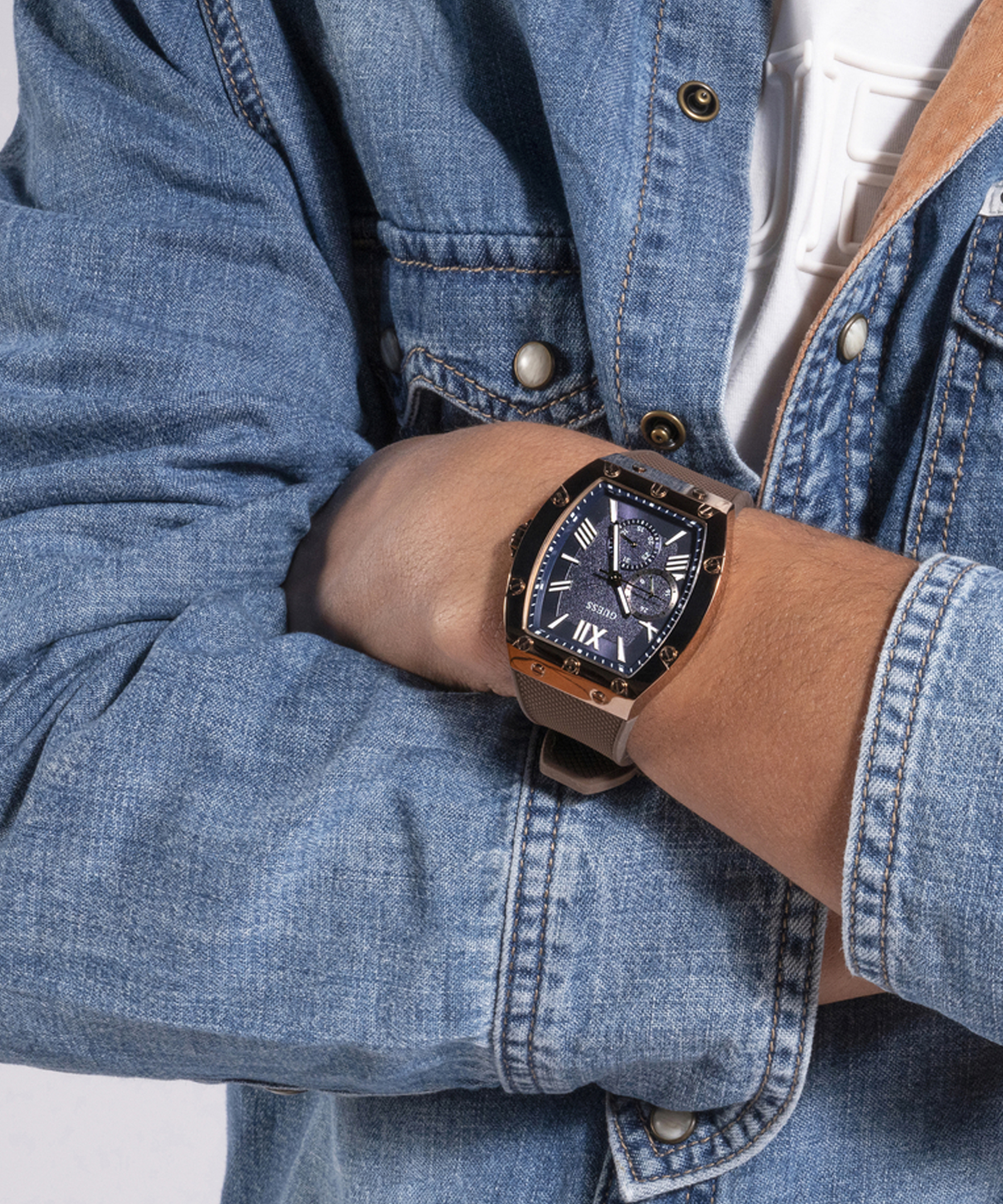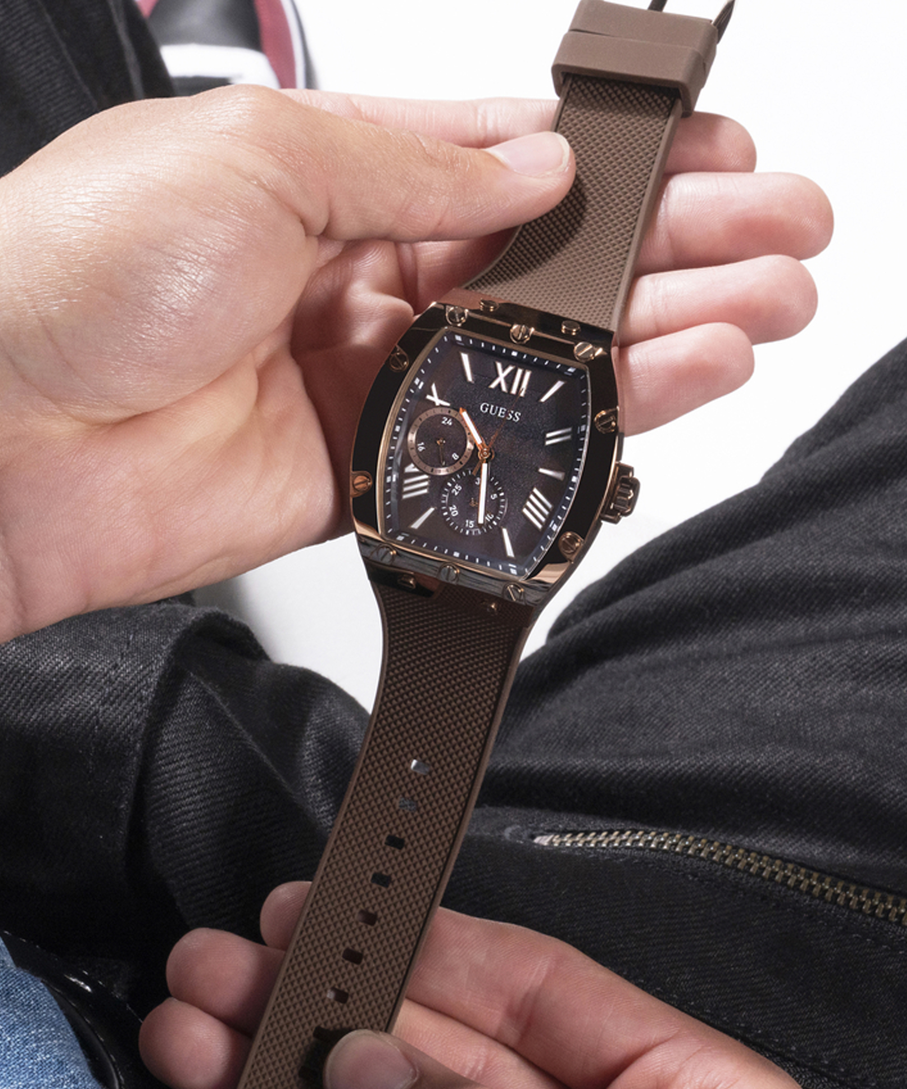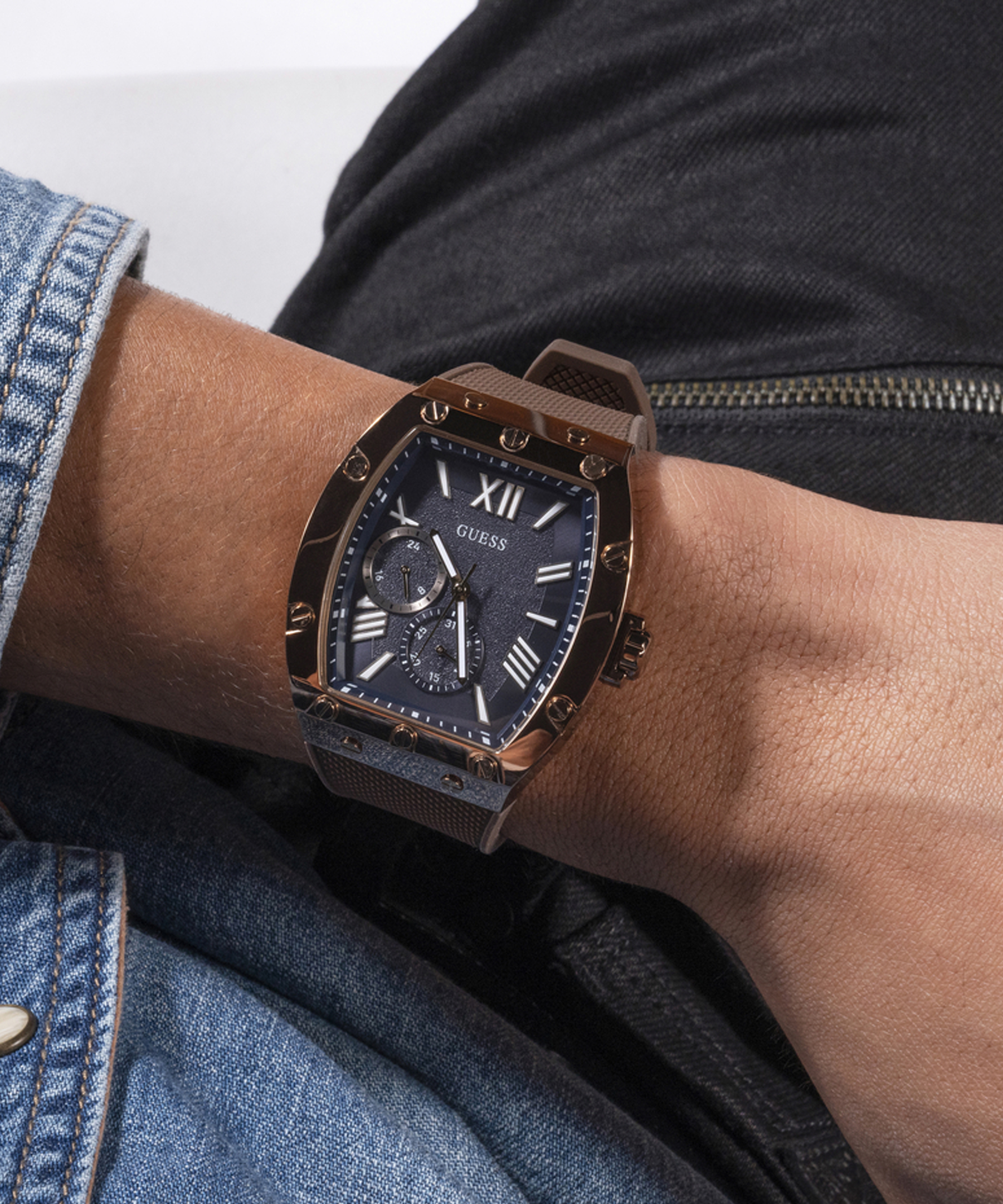 Оригінальний чоловічий годинник GW0568G1 американського бренду GUESS. Колекція MENS TREND. У годиннику встановлено кварцовий механізм Miyota. Сталевий корпус нестандартної форми 43х43,5 мм. Товщина – 10,8 мм. Коричневий силіконовий ремінець із тисненням. Класична застібка – пряжка. На темно-синьому циферблаті - стрілки з люмінесцентним покриттям та відображення дати. Водозахист – 5 АТМ.