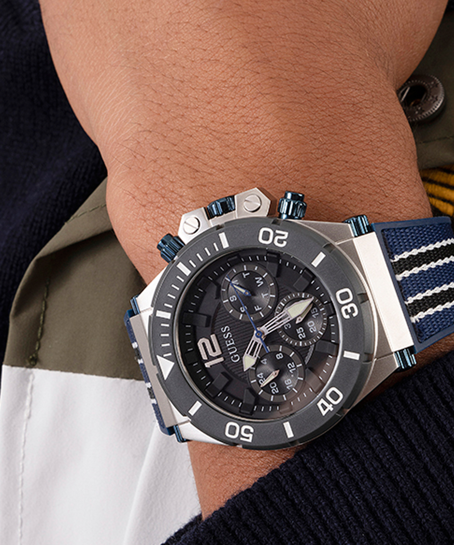 Мужские наручные часы - хронограф американского бренда GUESS. В часах установлен кварцевый механизм Miyota. Стальной корпус с покрытием Silver Tone. Диаметр корпуса - 48 мм, толщина - 12,4 мм. Прочное минеральное стекло. Водозащита 5 АТМ.