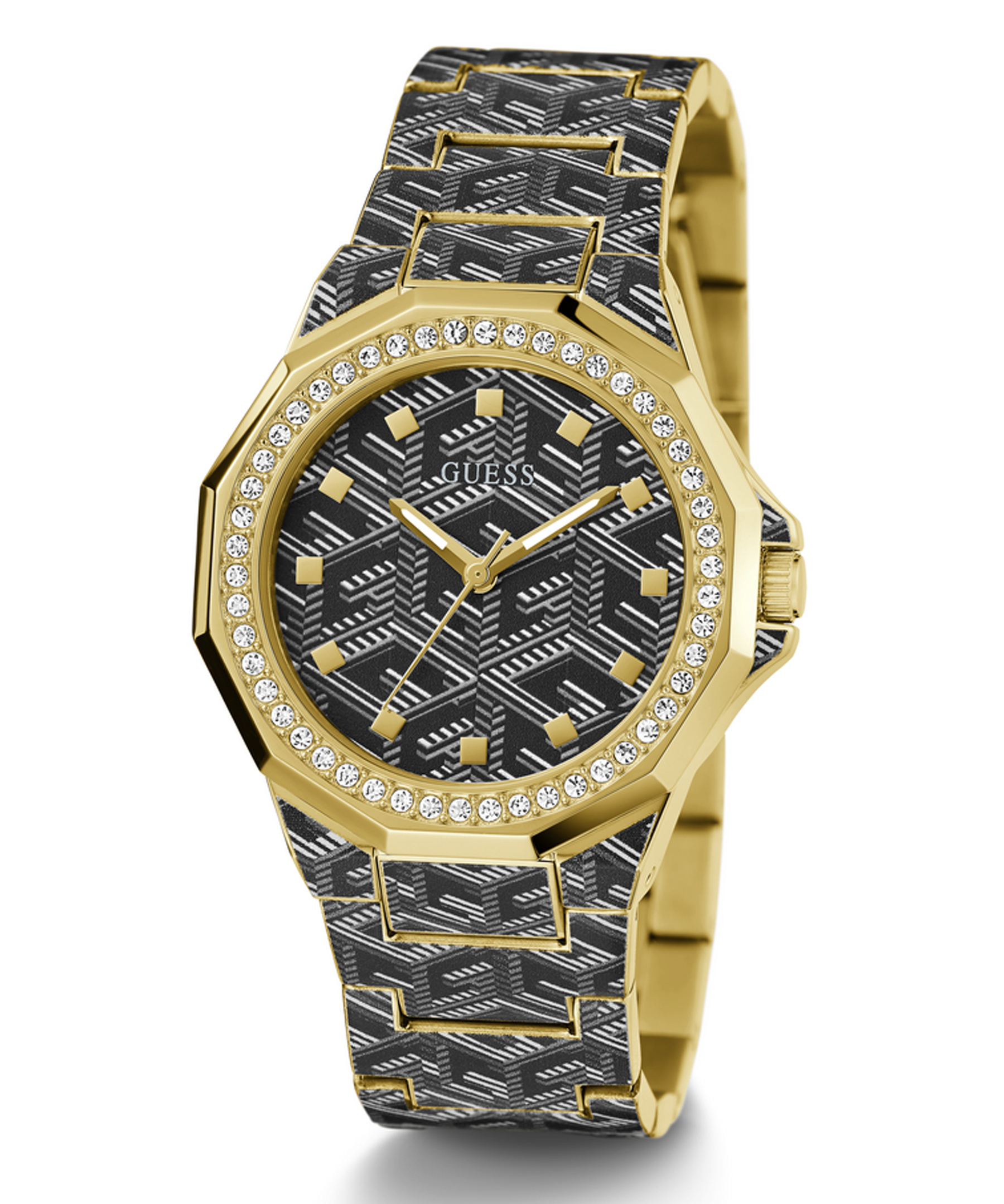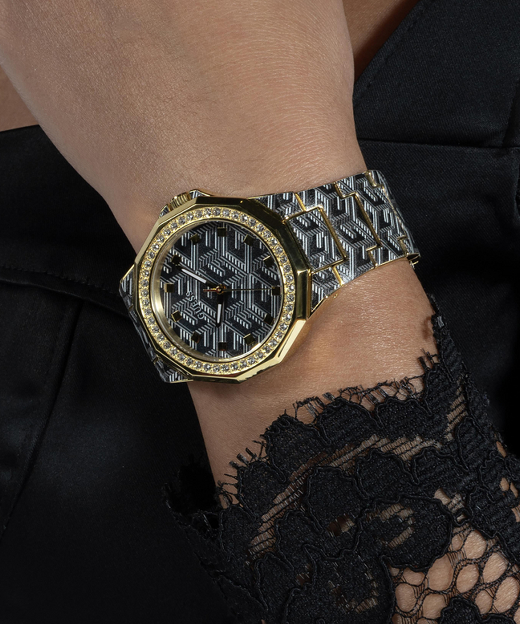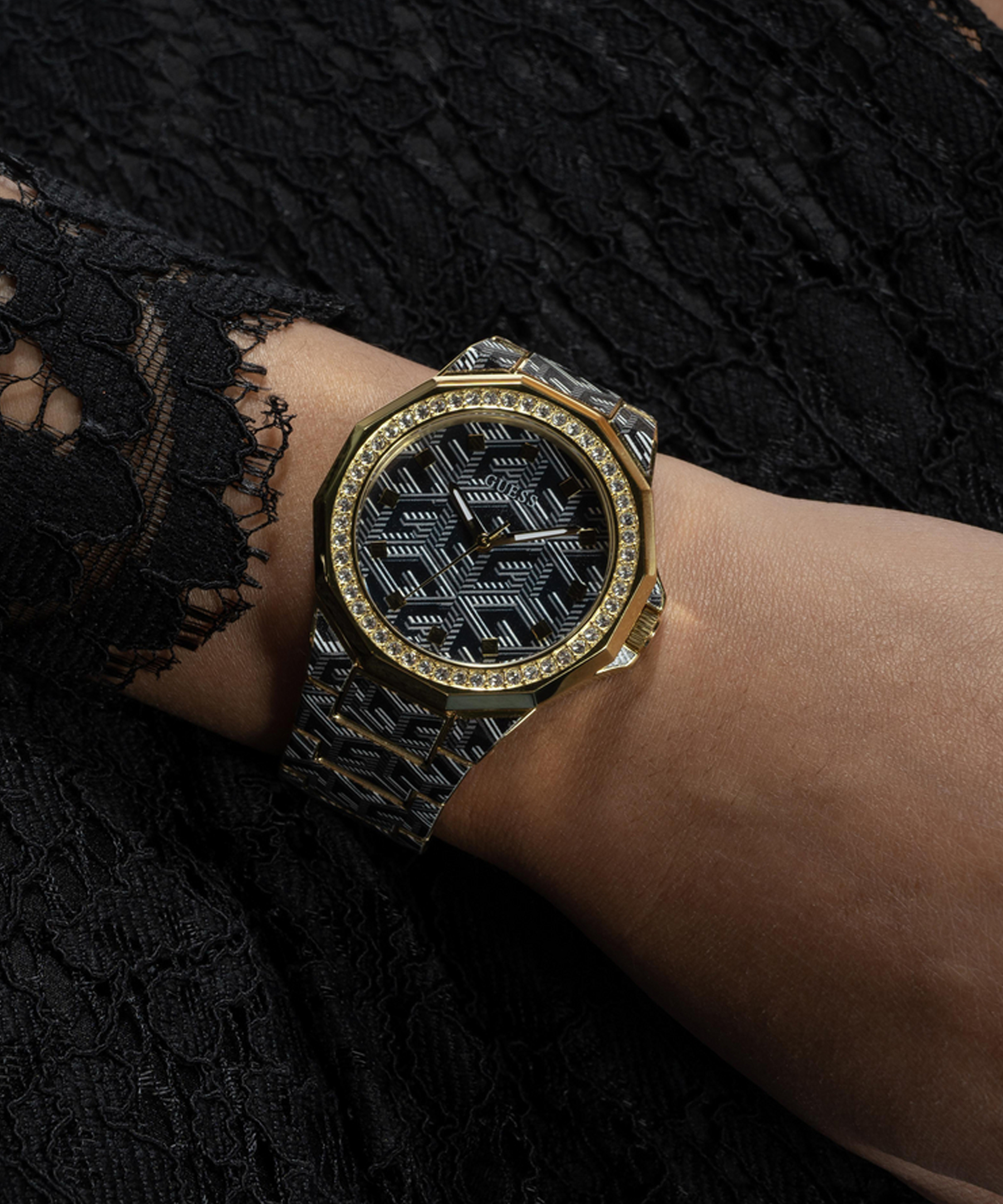 Женские наручные часы GW0597L1 легендарного американского бренда Guess. В часах установлен надежный кварцевый механизм Miyota. Эти потрясающие часы имеют напечатанный цифровым способом узор в форме буквы "G" как на браслете, так и на всему циферблату и декорированы камнями на уникальном безеле. Водозащита – 3 АТМ.