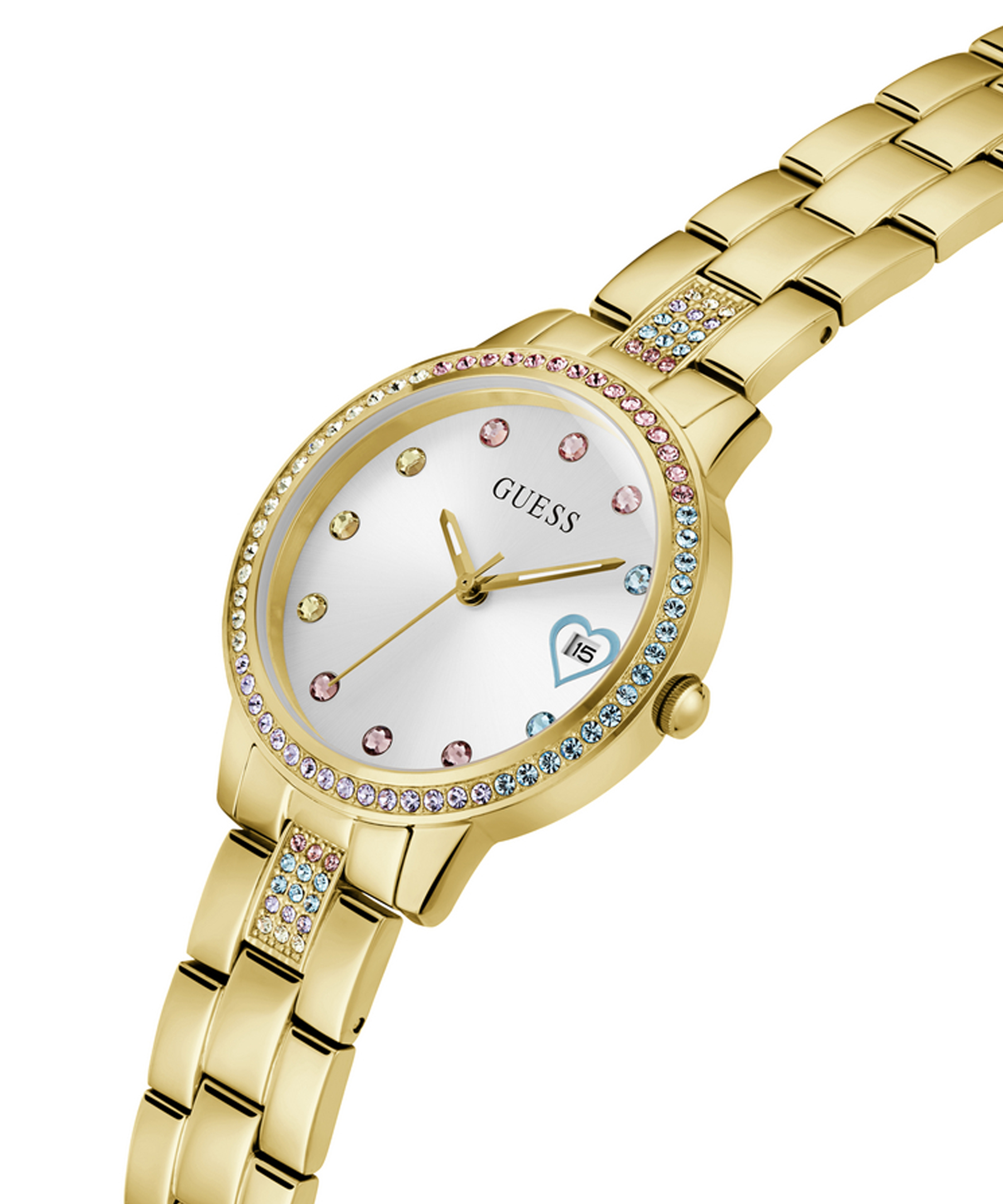 Изысканные Часы женские GUESS GW0657L2 из коллекции LADIES DRESS. Установлен надежный кварцевый механизм Miyota. Корпус и браслет часов выполнены из стали с золотистым покрытием. Диаметр корпуса – 34 мм, толщина – 7,9 мм. Браслет с удобной застежкой – складной клипсой. Аналоговый циферблат Sunray защищен прочным минеральным стеклом. Роль индексов времени выполняют разноцветные кристаллы, переблискивающиеся с камнями на безели. В окошке в виде сердца – отображение даты, придающей аксессуару не только изящный вид, но и максимальной функциональности. Водозащита – 3 АТМ.
