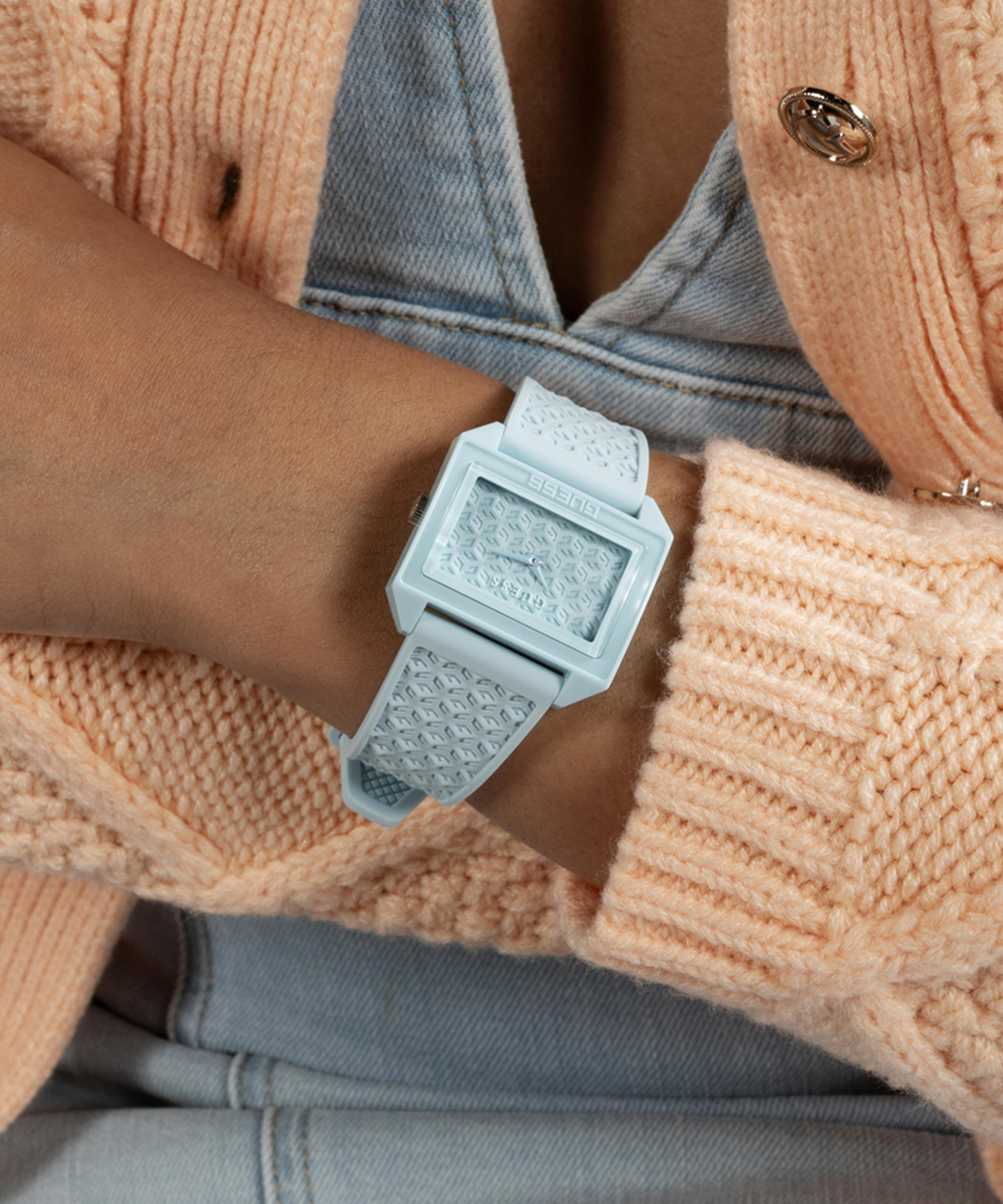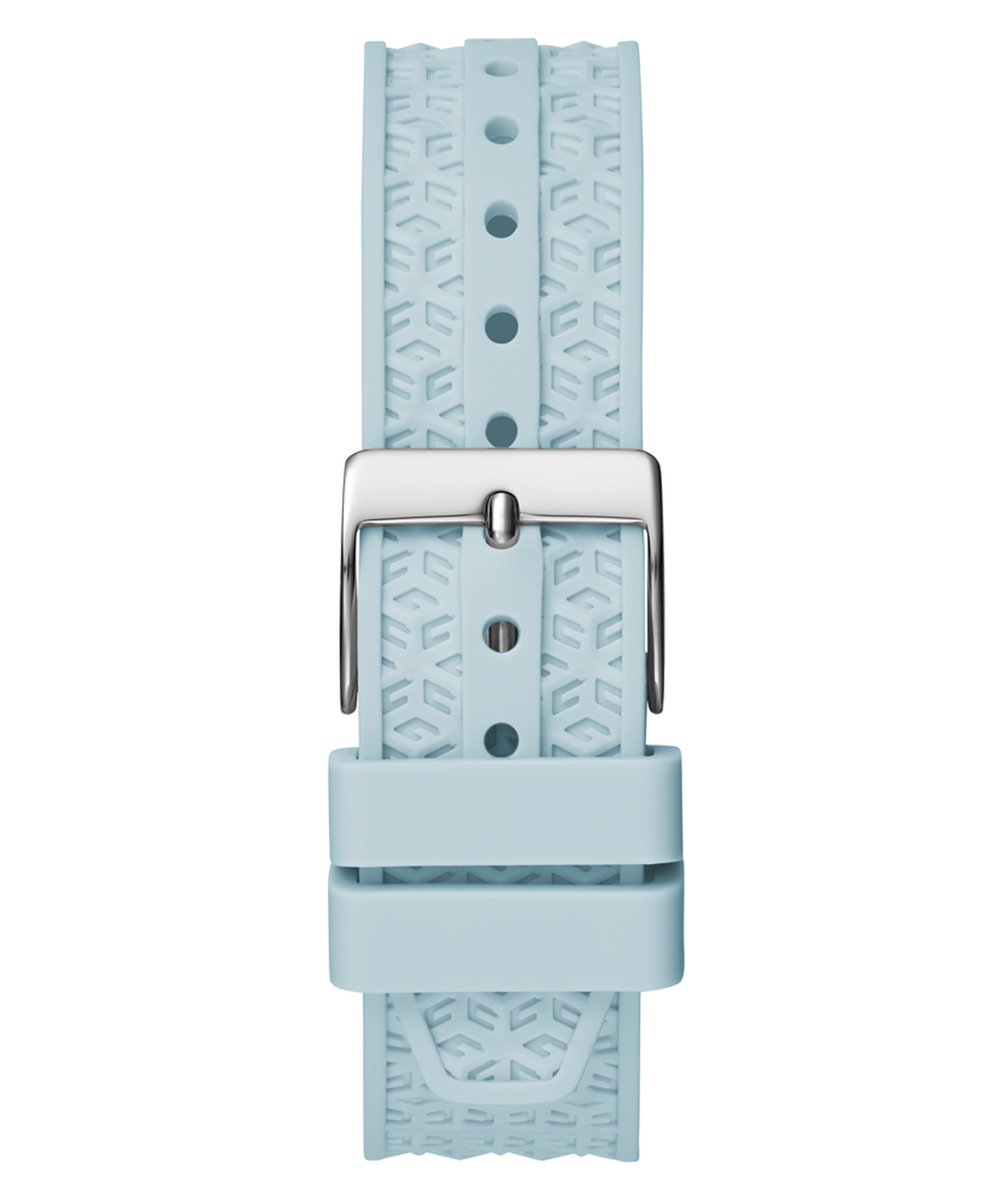Оригинальные женские наручные часы GW0677L3 американского бренда GUESS. В часах установлен надежный японский механизм Miyota. Часы выполнены в голубом цвете. Прямоугольный корпус плавно переходит в силиконовый ремешок, декорированный текстурным орнаментом. Минеральное стекло. Водозащита 1 АТМ.