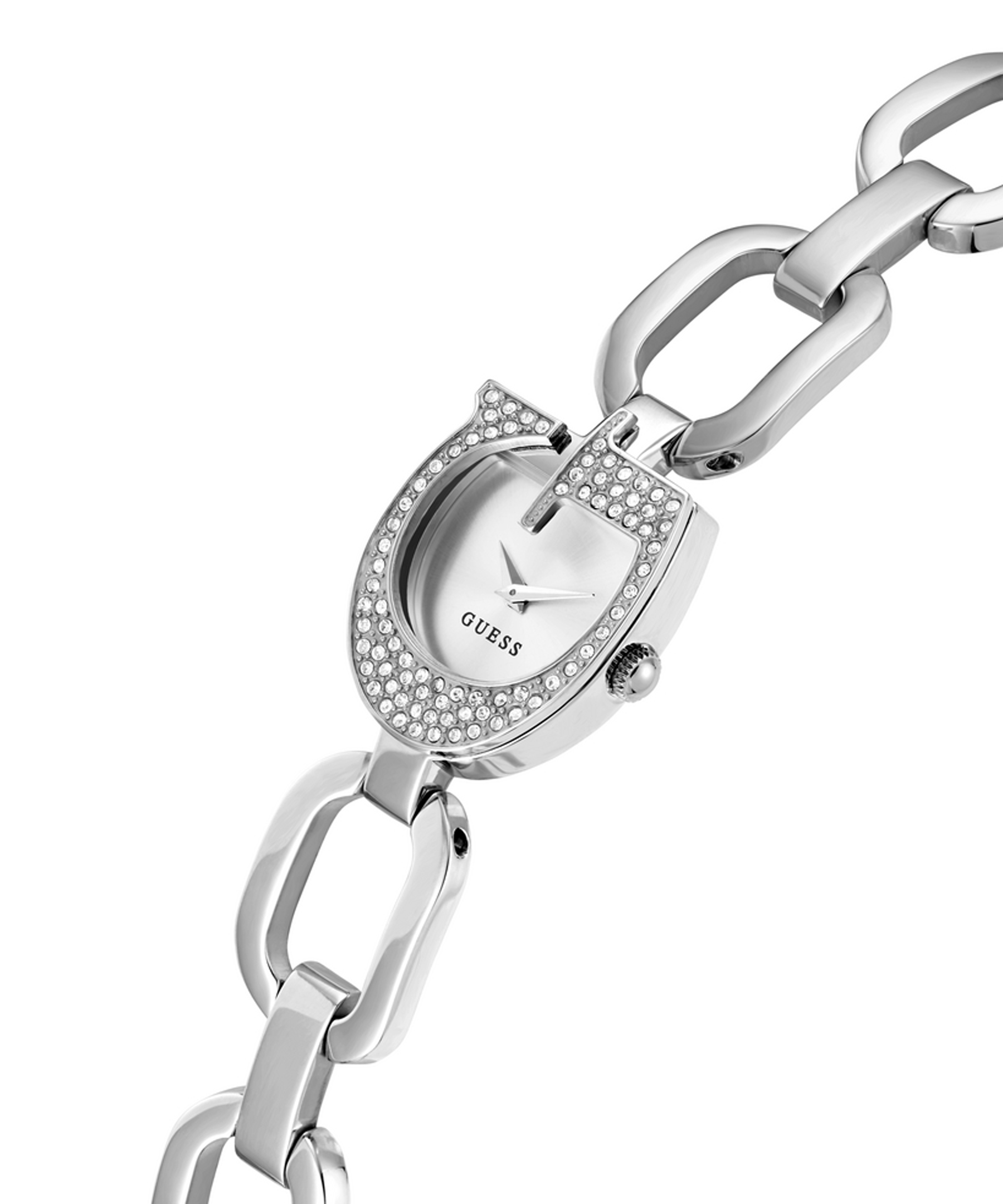 Очень женственный дизайн воплощен в новой модели часов GW0683L1 американского бренда GUESS. В часах установлен надежный японский механизм Miyota. Стальной корпус и браслет. Нестандартный дизайн, надежность кварцевого механизма Miyota и практичность совмещены в одном аксессуаре, который может служить своей владелице как самостоятельное ювелирное украшение. Размер корпуса – 22 мм. Серебристый аналоговый циферблат защищен прочным минеральным стеклом. Водозащита 3 АТМ.