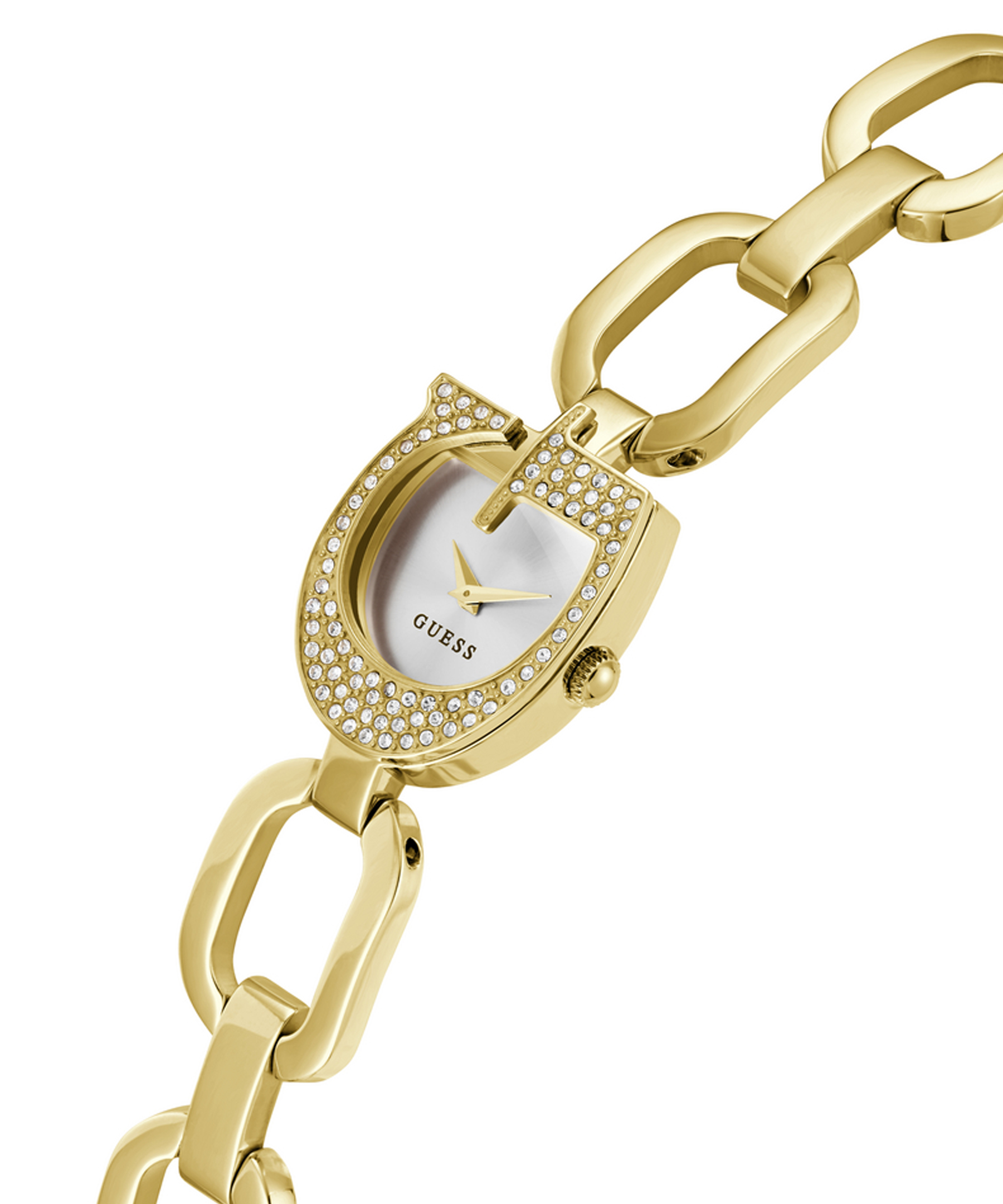 Очень женственный дизайн воплощен в новой модели часов GW0683L2 американского бренда GUESS. В часах установлен надежный японский механизм Miyota. Стальные с золотистым покрытием корпус и браслет. Нестандартный дизайн, надежность кварцевого механизма Miyota и практичность сочетаются в одном аксессуаре, который может служить своей владелице как самостоятельное ювелирное украшение. Размер корпуса – 22 мм. Серебристый аналоговый циферблат защищен прочным минеральным стеклом. Водозащита 3 АТМ.