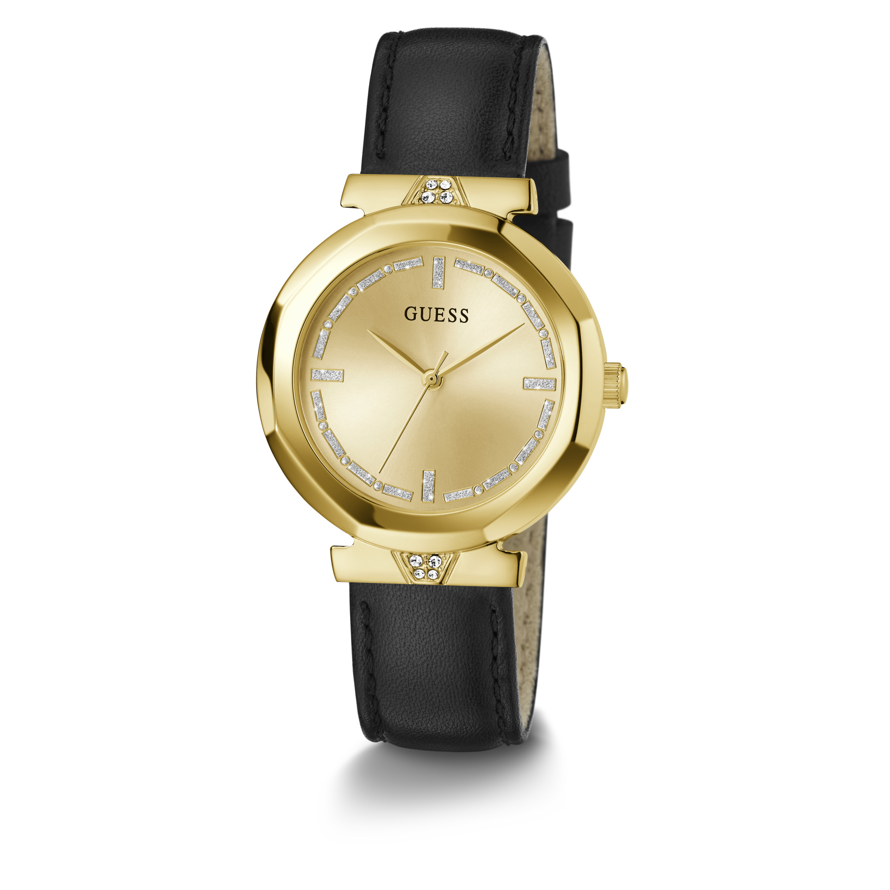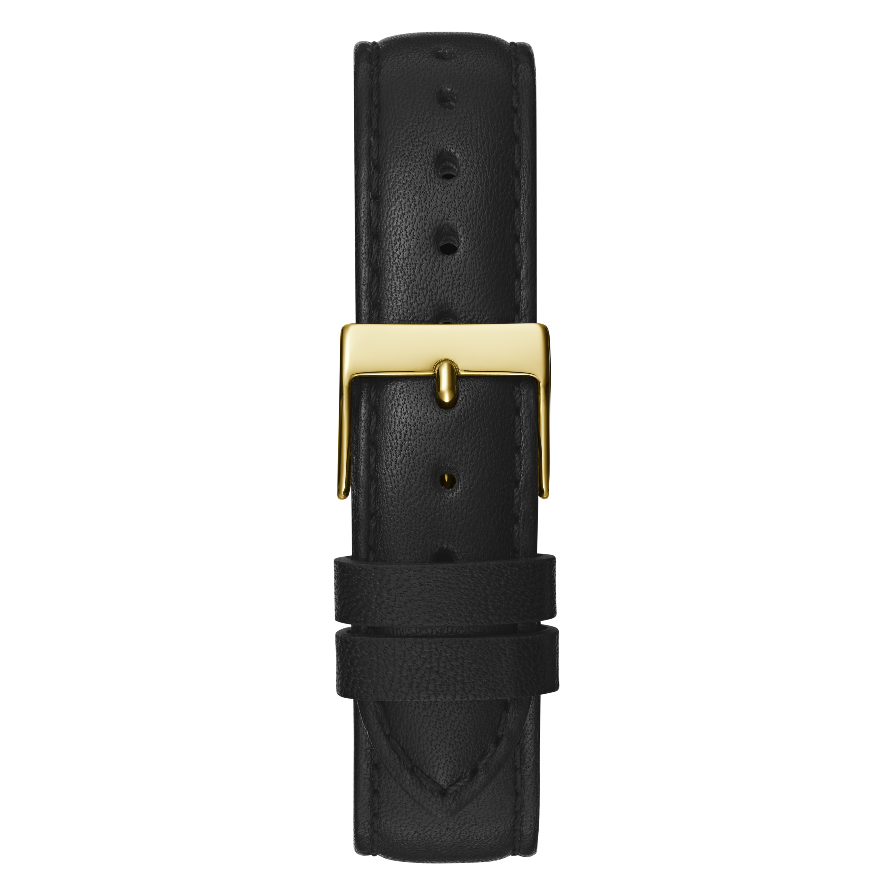 Елегантний сталевий корпус з золотистим покриттям вражає своєю витонченістю, а діаметр 34 мм підкреслює жіночність і вишуканість дизайну. Чорний шкіряний ремінець з класичною застібкою-пряжкою додає годиннику витонченості. Поєднання чорного кольору з золотими акцентами створює гармонійну і стильну композицію.