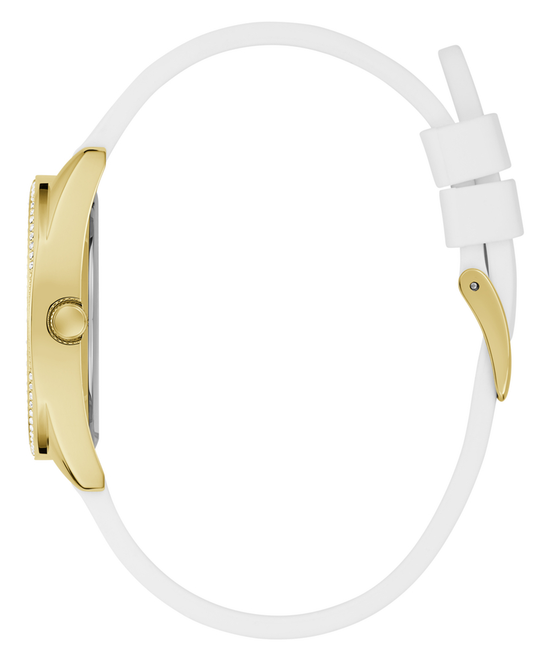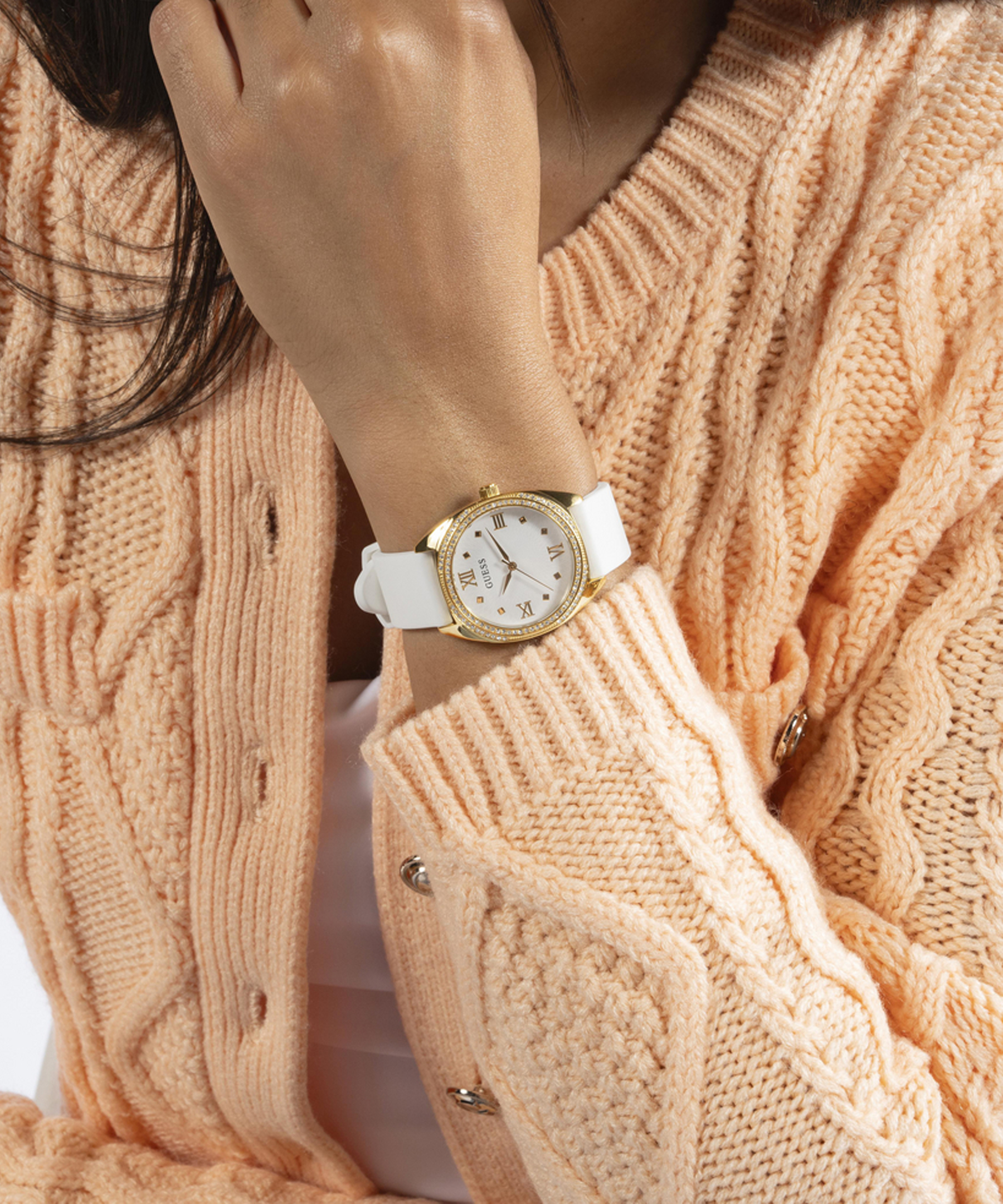 Стильный стальной корпус диаметром 34 мм с покрытием Gold Tone подчеркивает изящную эстетику аксессуара, а его универсальный дизайн позволяет совмещать часы с любым стилем. В комплекте идут два ремешка: белый силиконовый и голубой из натуральной кожи, что позволяет изменять вид часов в соответствии с настроением или обстоятельствами.