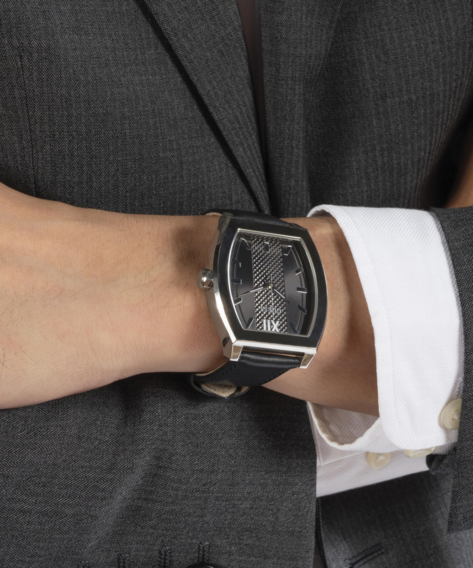 Модель оснащена высокоточным кварцевым механизмом, гарантирующим безупречную работу в ежедневном ритме. Корпус из нержавеющей стали не только выглядит стильно, но и отличается отличными антикоррозионными свойствами. Диаметр корпуса – 42 мм, что придает изделию гармонических пропорций. Глубокий черный аналоговый циферблат с четкими индексами защищен стойким минеральным стеклом, сохраняющим безупречный вид часов надолго. Завершает образ ремешок из натуральной кожи черного цвета – сдержанный, практичный и изысканный.