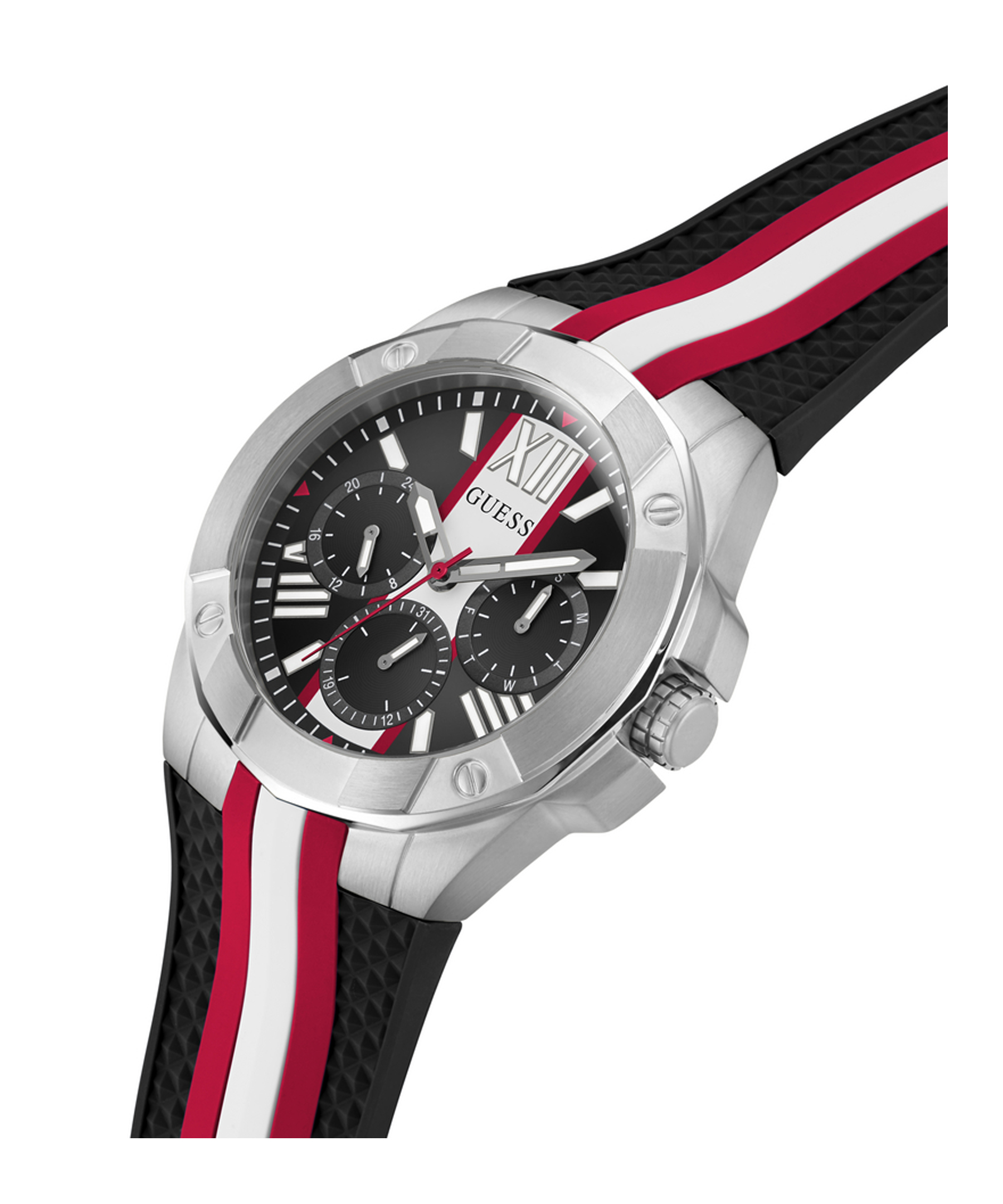 Мужские спортивные часы известного американского бренда GUESS из коллекции MENS SPORT с многофункциональным японским механизмом Miyota. Корпус из высококачественной стали. Наличие индикаторов даты, дня недели и часов в 24 часовом формате – дополнительные преимущества. Сочетание цвета корпуса и силиконового ремешка, стильный дизайн безеля, цифры и стрелки с люминесцентным покрытием – производит впечатление дорогого аксессуара. Прочное минеральное стекло надежно защищает механизм от внешних повреждений. Модель рекомендуется стильным, спортивным мужчинам, которые никогда не забывают о красоте и комфорте.