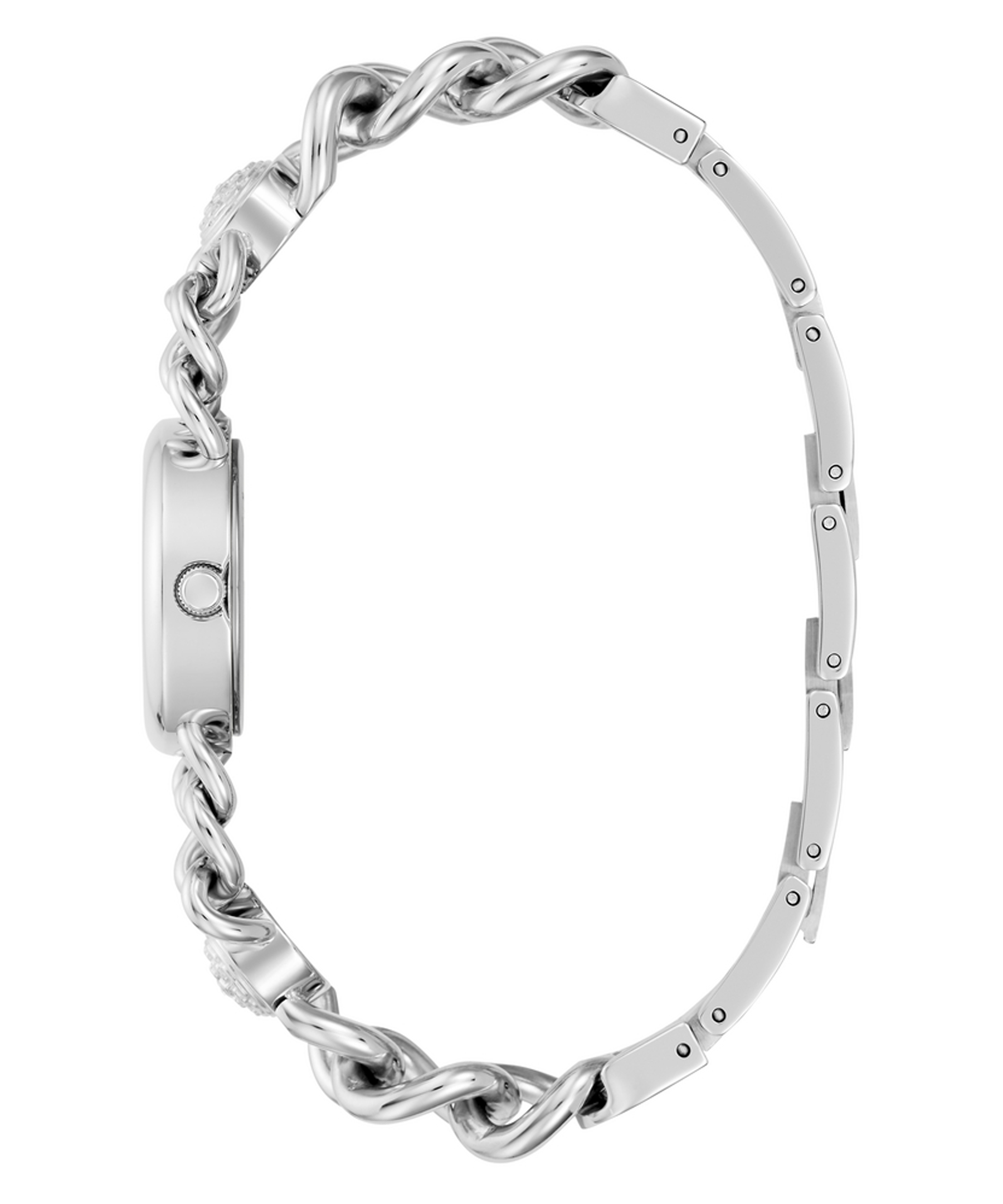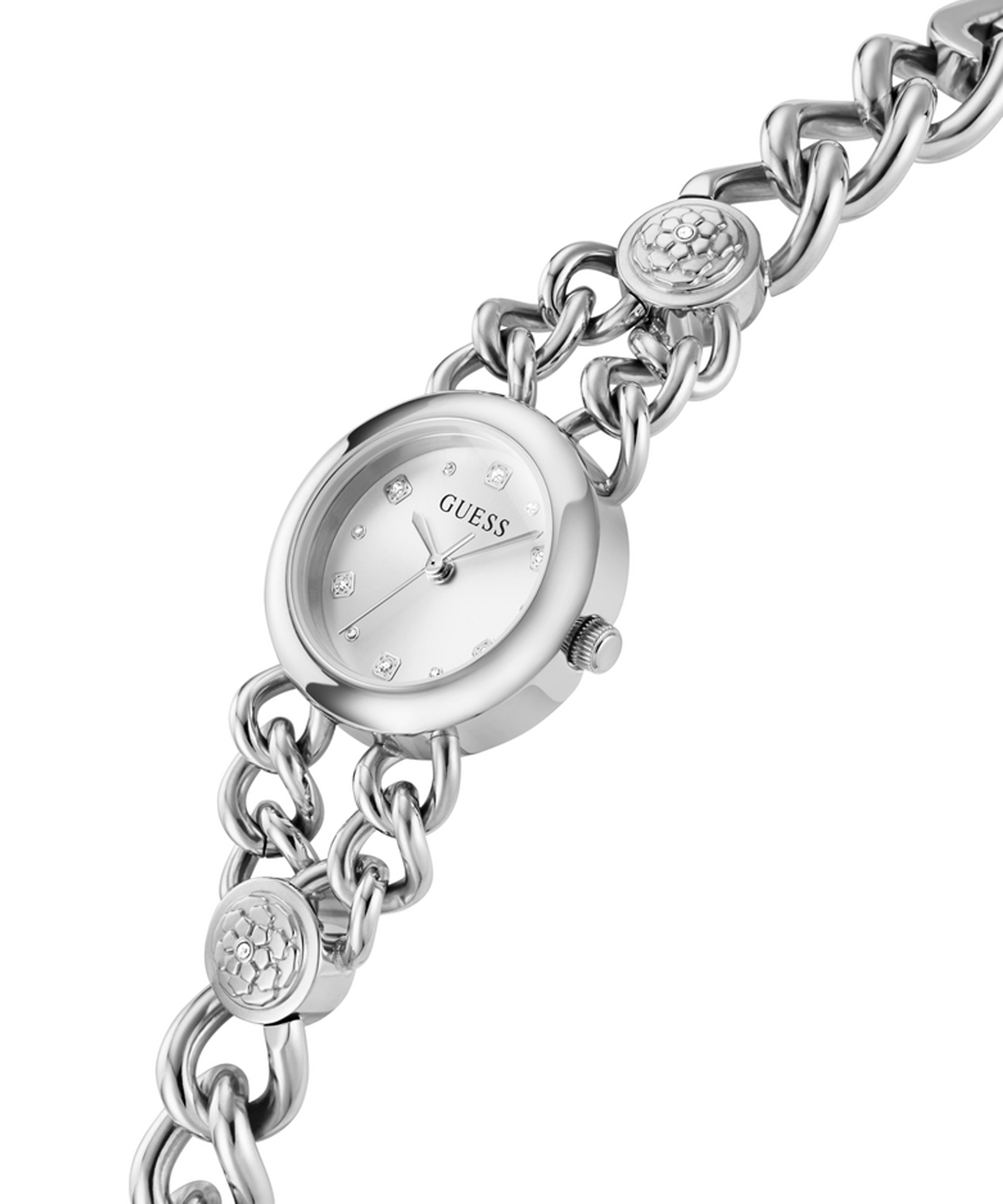 Необычайно женственный дизайн воплощен в новой модели часов американского бренда GUESS. В часах установлен надежный японский механизм Miyota. Стальной корпус и браслет. Изысканный дизайн, надежность кварцевого механизма Miyota и практичность совмещены в одном аксессуаре, который может служить своей владелице как самостоятельное ювелирное украшение. Диаметр корпуса: 25 мм. Аналоговый циферблат надежно защищен прочным минеральным стеклом. Водозащита 3 АТМ.