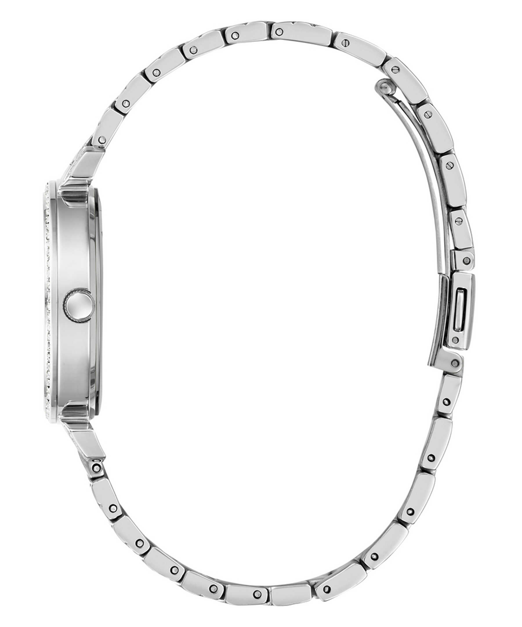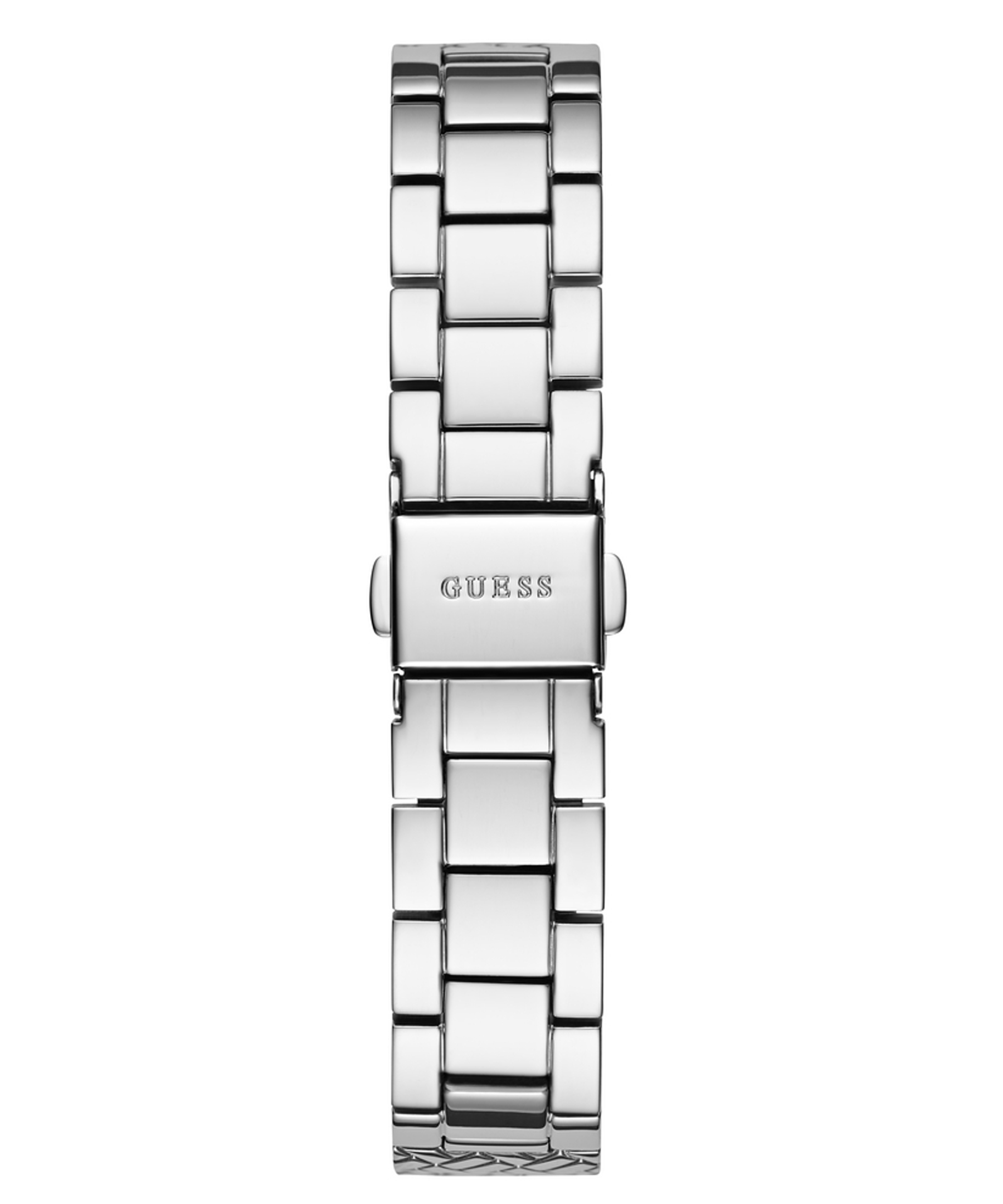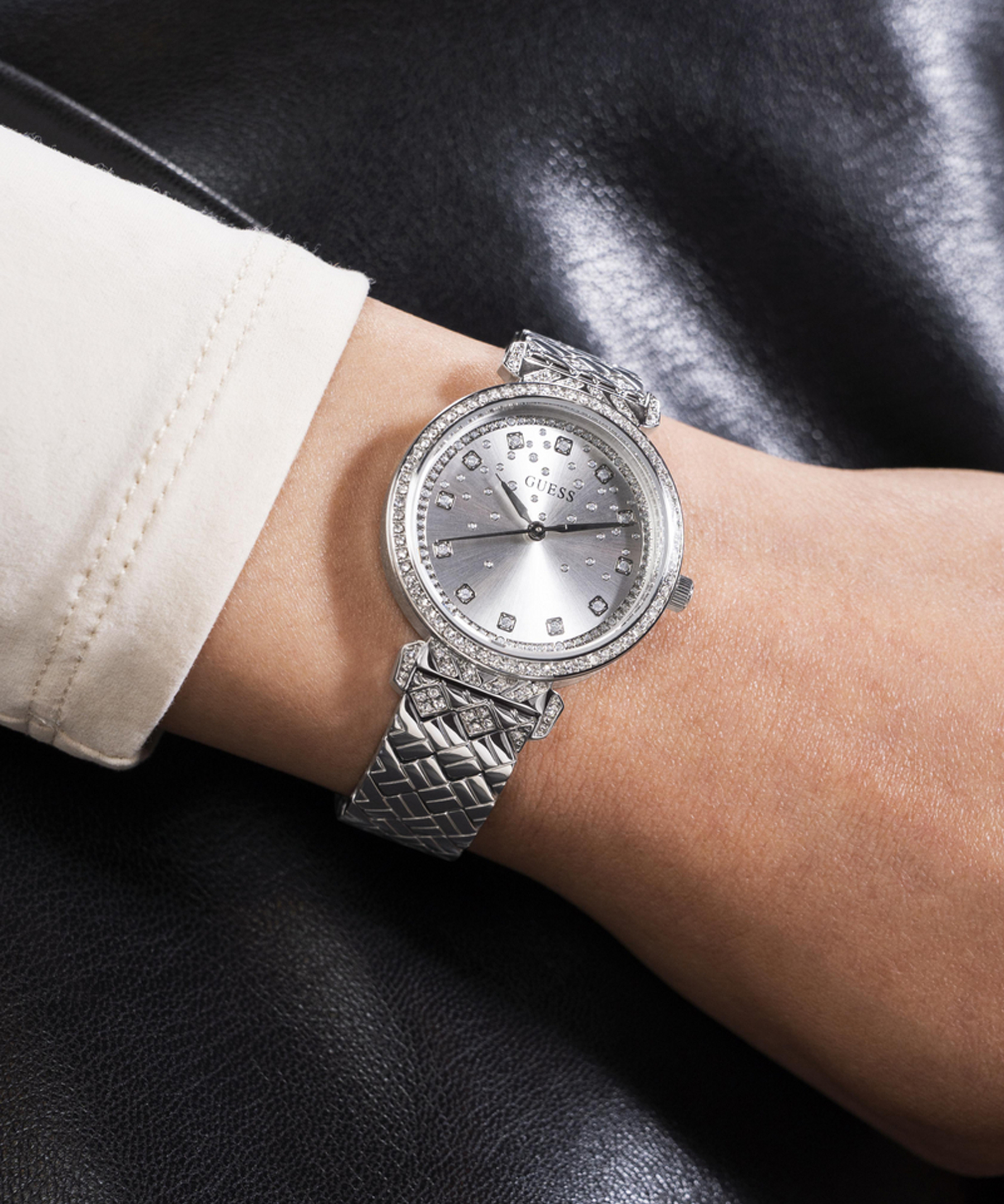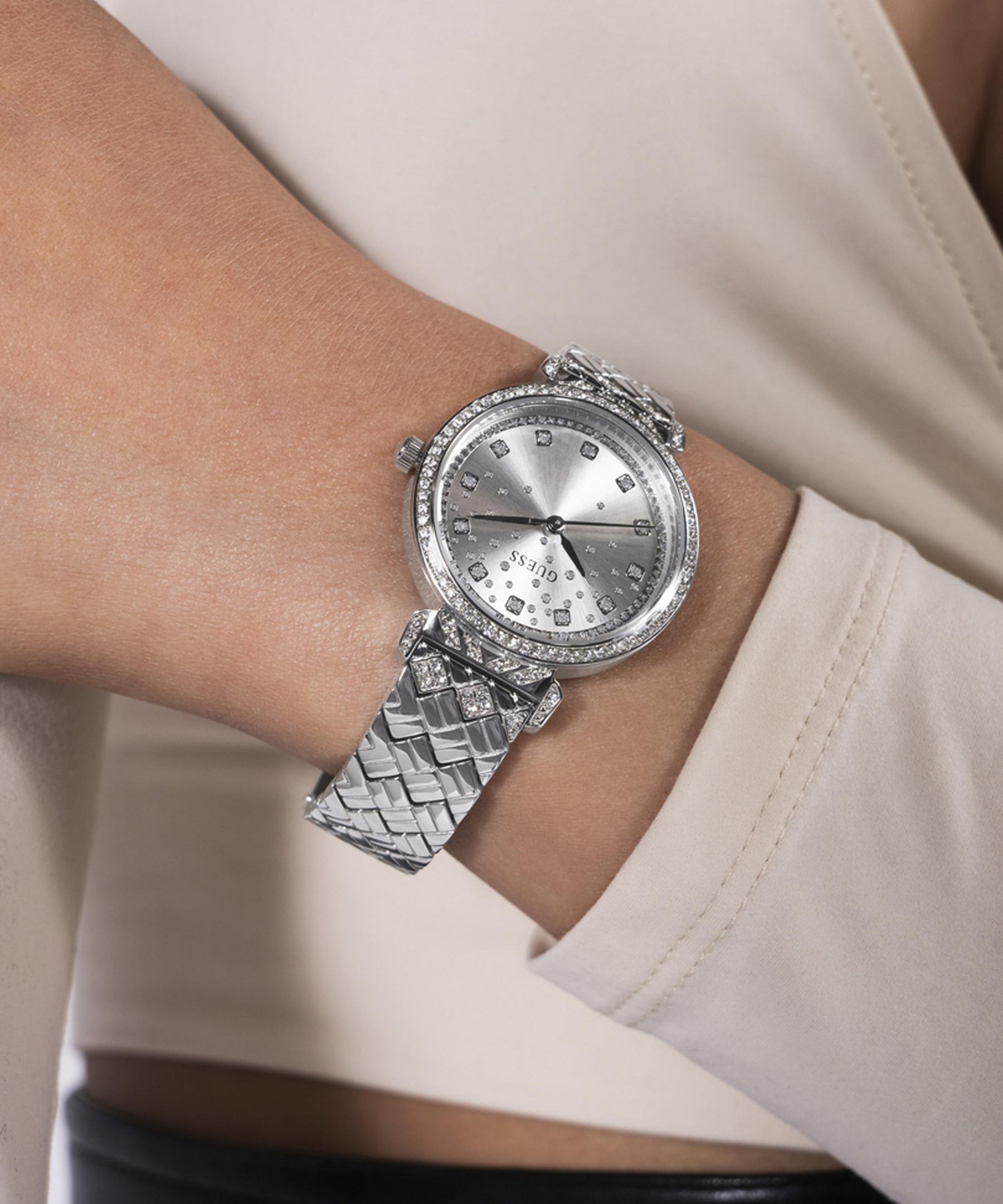 Очень женственный дизайн воплощен в новой модели часов американского бренда GUESS. В часах установлен надежный японский механизм Miyota. Стальной корпус и браслет. Изысканный дизайн, надежность кварцевого механизма Miyota и практичность совмещены в одном аксессуаре, который может служить своей владелице как самостоятельное ювелирное украшение. Диаметр корпуса – 32 мм. Серебристый аналоговый циферблат защищен прочным минеральным стеклом. Водозащита: 3 АТМ.
