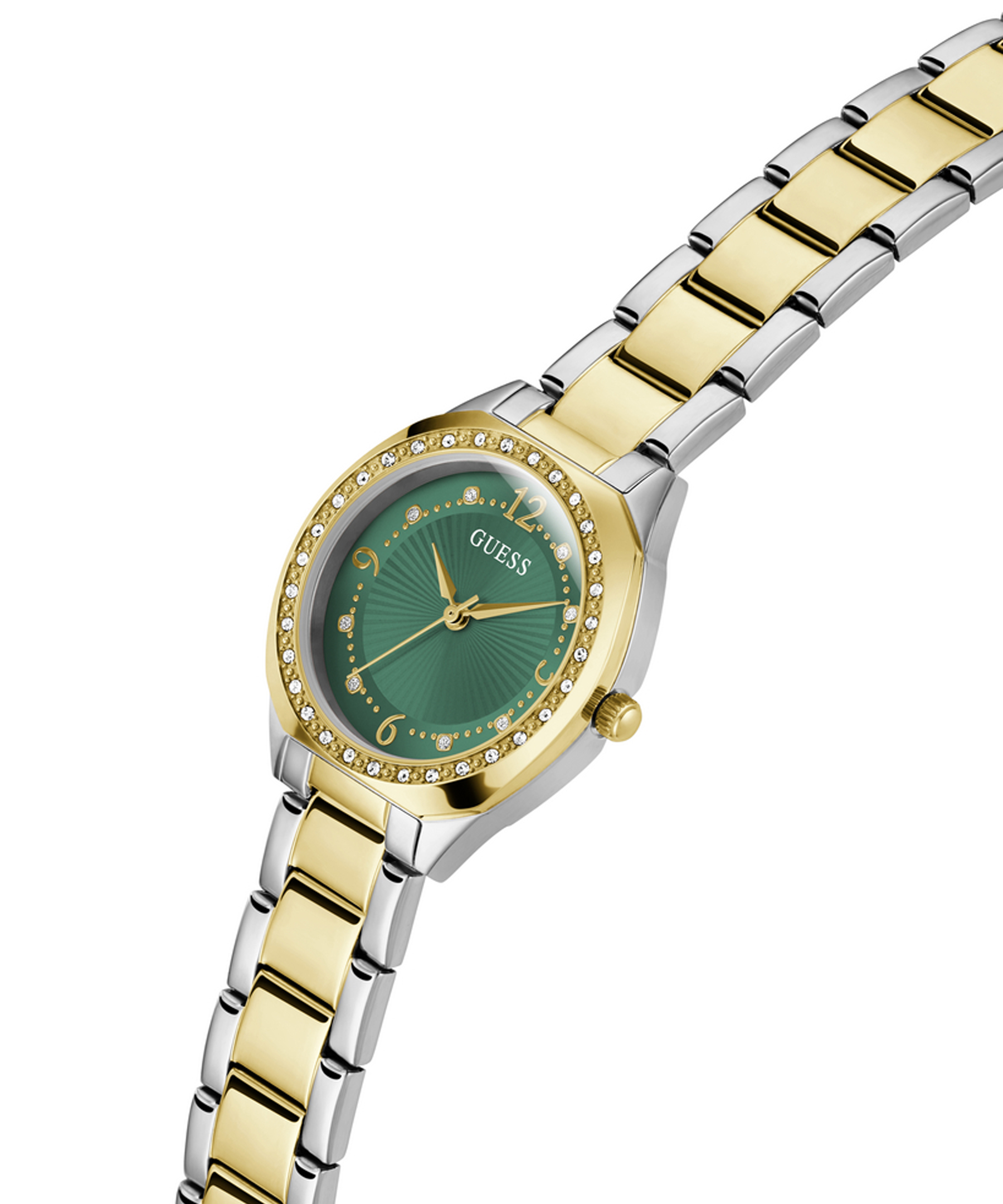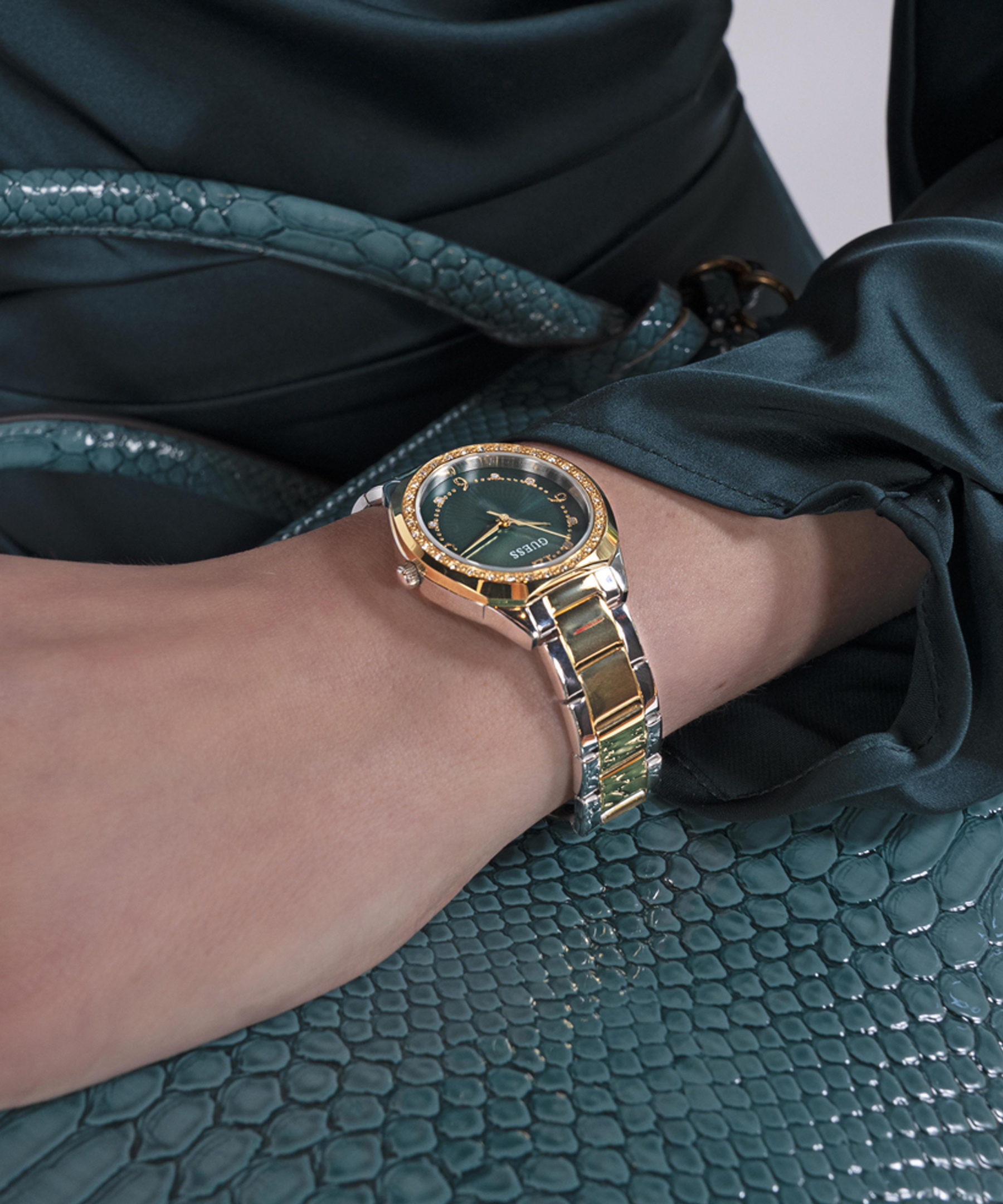 Насыщенный зелёный циферблат гармонично дополняется корпусом из нержавеющей стали с золотисто-серебристым покрытием. Изящные кристаллы на безеле добавляют сияния и делают модель эффектной. Часовые метки оформлены в минималистичном стиле, а тонкие золотистые стрелки подчёркивают утонченность дизайна.