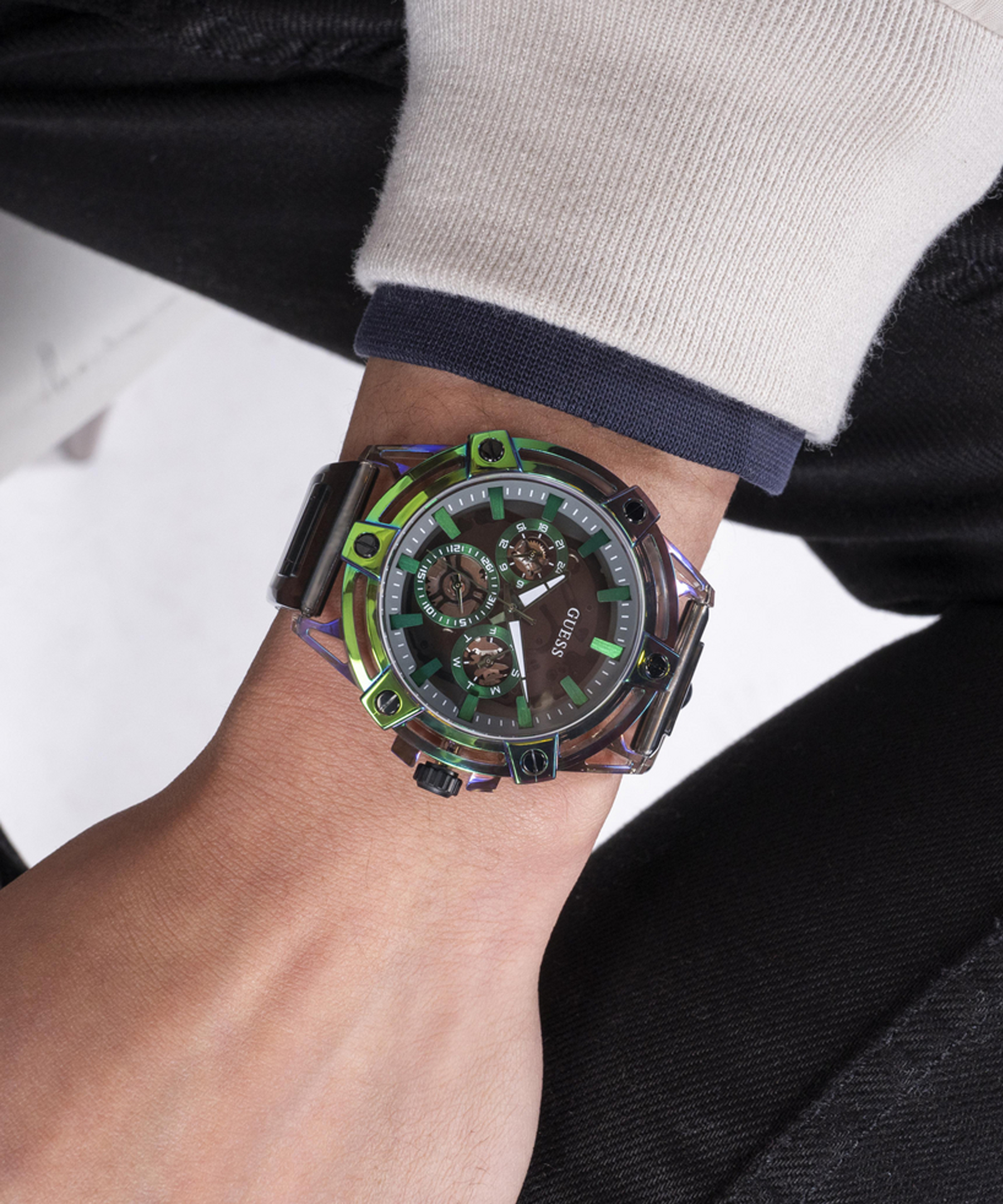 Чёрный циферблат с прозрачными элементами позволяет наблюдать за работой механизма, придавая часам динамичный и технологичный вид. Зелёные люминесцентные метки и стрелки обеспечивают чёткое считывание времени даже в условиях низкой освещённости. Дополнительные индикаторы отображают день недели, дату и 24-часовой формат времени, подчёркивая многофункциональность модели.