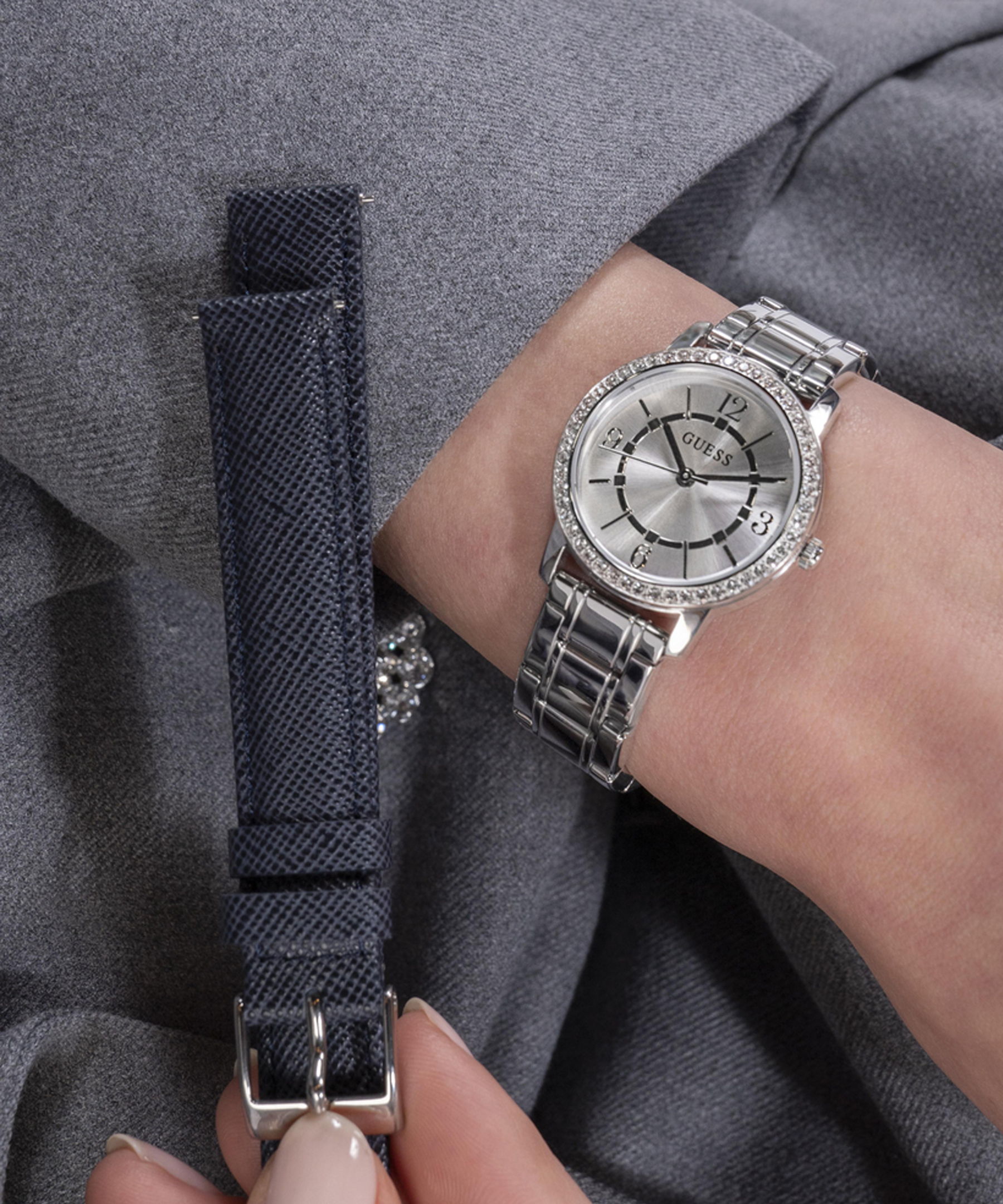 Металлический браслет из нержавеющей стали легко адаптируется к запястью, а в комплекте идёт дополнительный синий кожаный ремешок, который позволяет менять стиль часов под настроение.