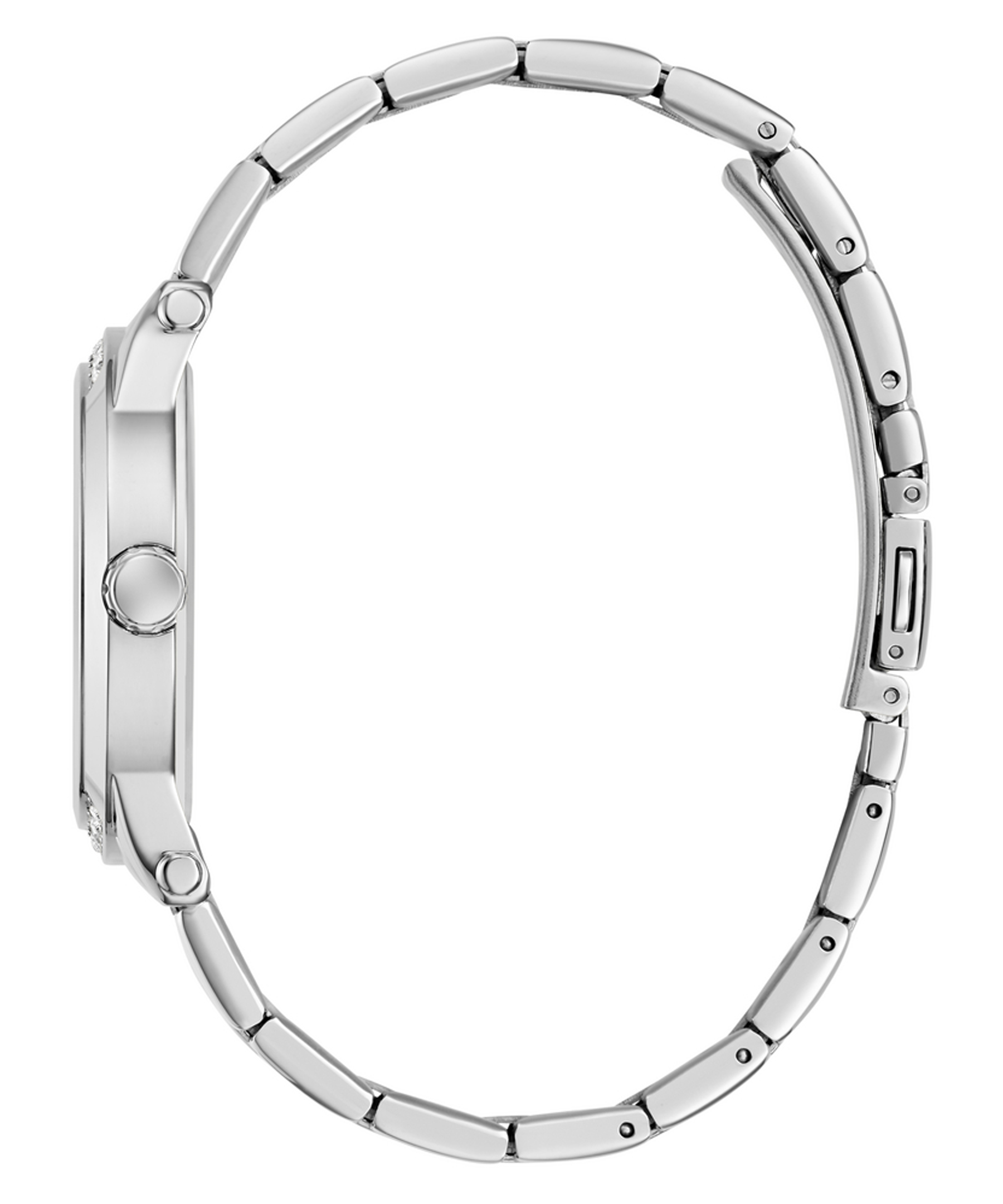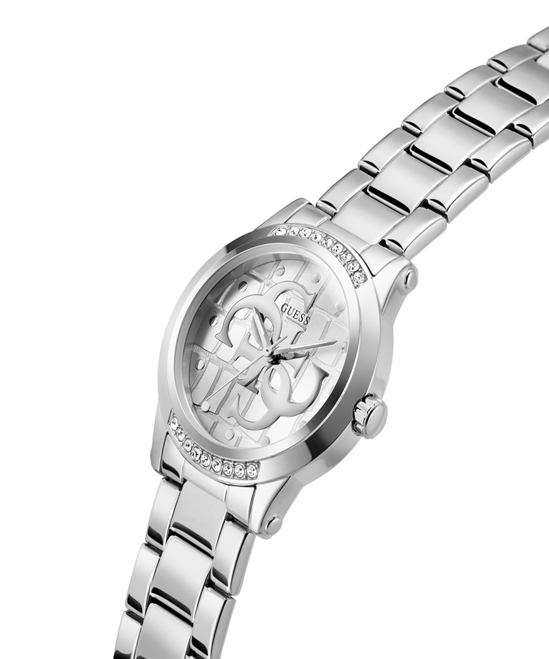 Корпус и браслет часов изготовлены из высококачественной стали. Безель, украшенный кристаллами, подчеркивает роскошный дизайн, а символы бренда на циферблате придают особую уникальность и стиль.