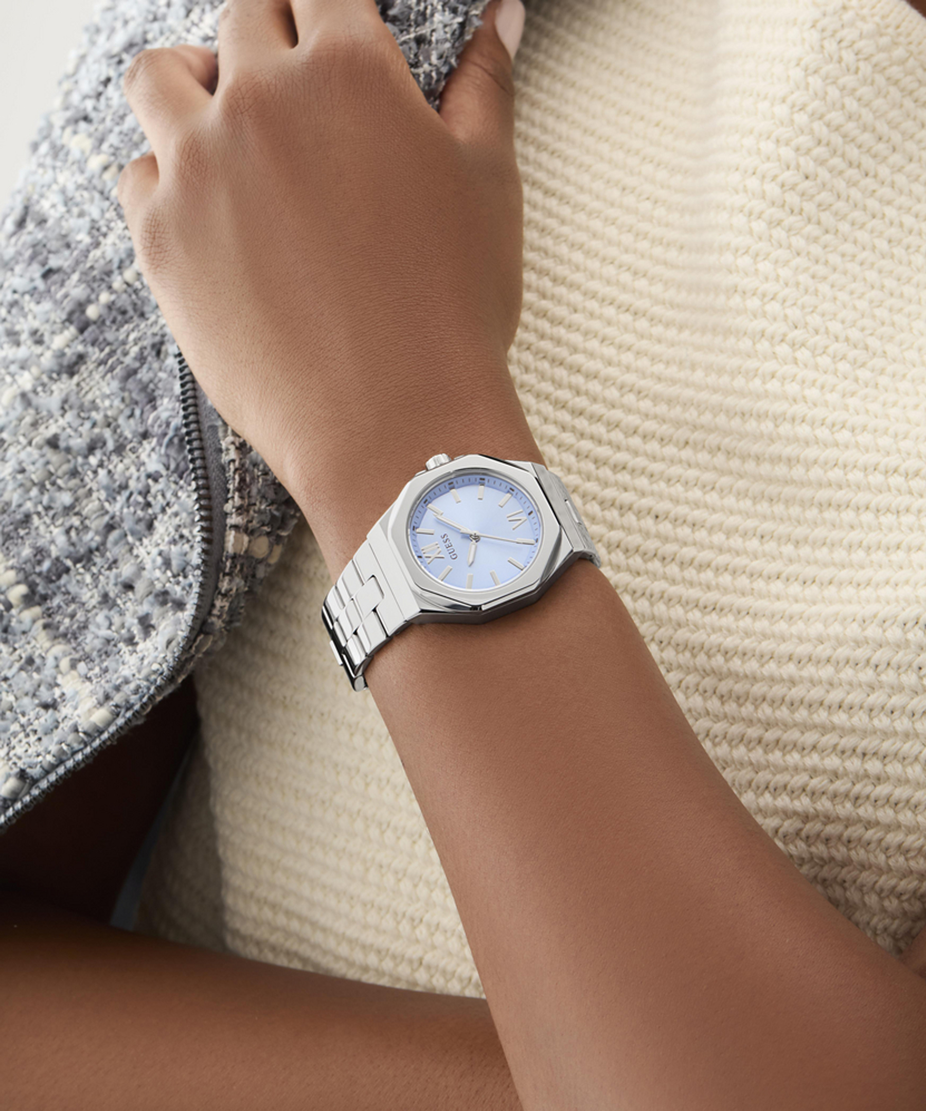 Минеральное стекло надежно защищает циферблат от царапин, сохраняя его безупречный вид, а водозащита 5 АТМ позволяет носить часы в любых условиях. Нежно голубой циферблат с грациозными бликами кристаллов создает неповторимый акцент на вашем запястье.
