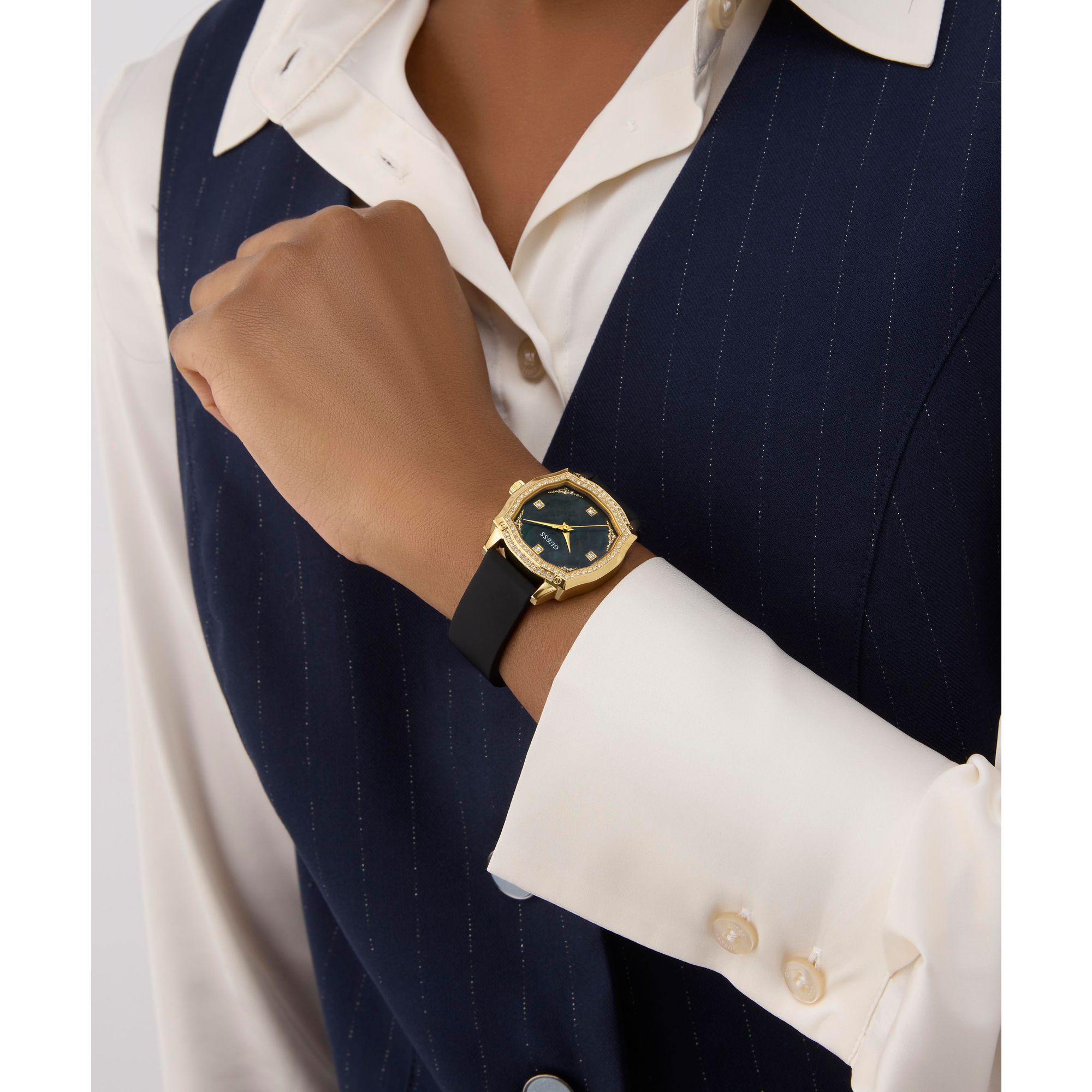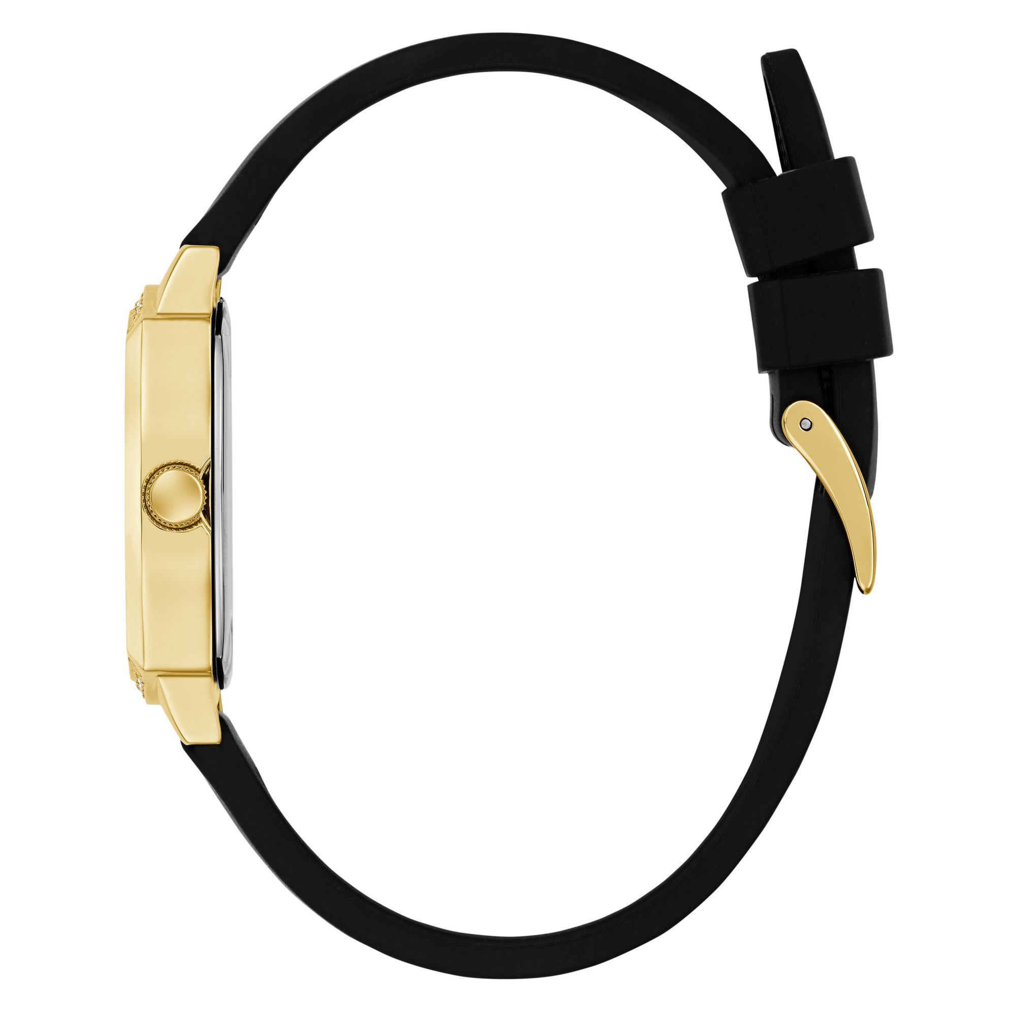 Нестандартний та вражаючий годинник від GUESS, який по-новому визначає вишуканість. Ця модель має унікальний квадратний корпус 32×32 мм із високоякісної сталі в золотистому тоні та поєднується з гладким чорним силіконовим ремінцем, створюючи стильний і сучасний образ. Чорний перламутровий циферблат з кристалами захоплює погляд і додає неповторного шарму, роблячи кожен момент особливим.
