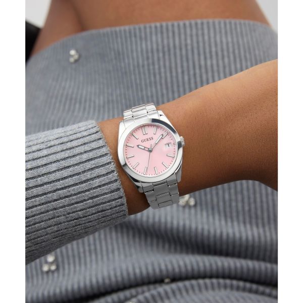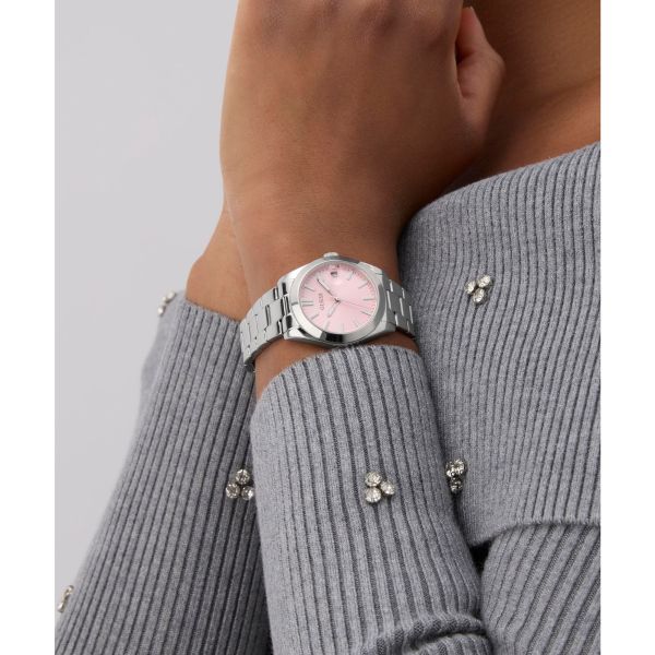 🔹 Циферблат: світло-рожевий із віконцем дати на позначці, що додає свіжий акцент.