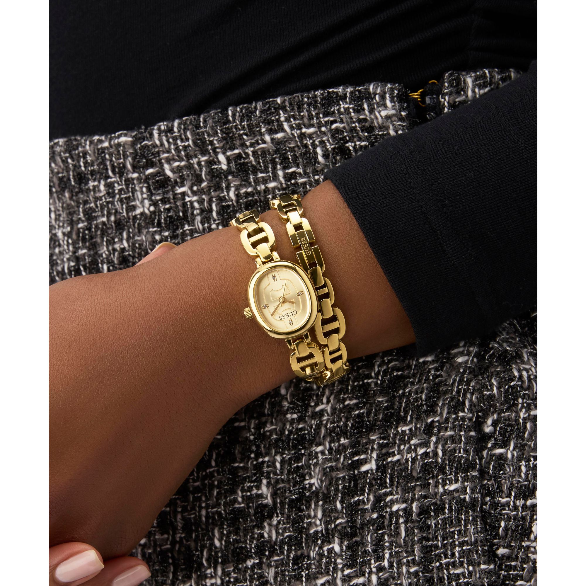 Модель виконана в золотистому тоні та оснащена мініатюрним овальним корпусом 24 × 21 мм. Завдяки саморегульованим ланкам G-links регулювання довжини стає максимально простим, а стилізація-безмежною. Циферблат шампанського кольору із сонячним сяйвом додає класичної елегантності, а подовжений ланцюжок дарує свободу вибору: носіть годинник як подвійний браслет на зап’ясті або як виразний чокер, створюючи сміливий модний акцент.