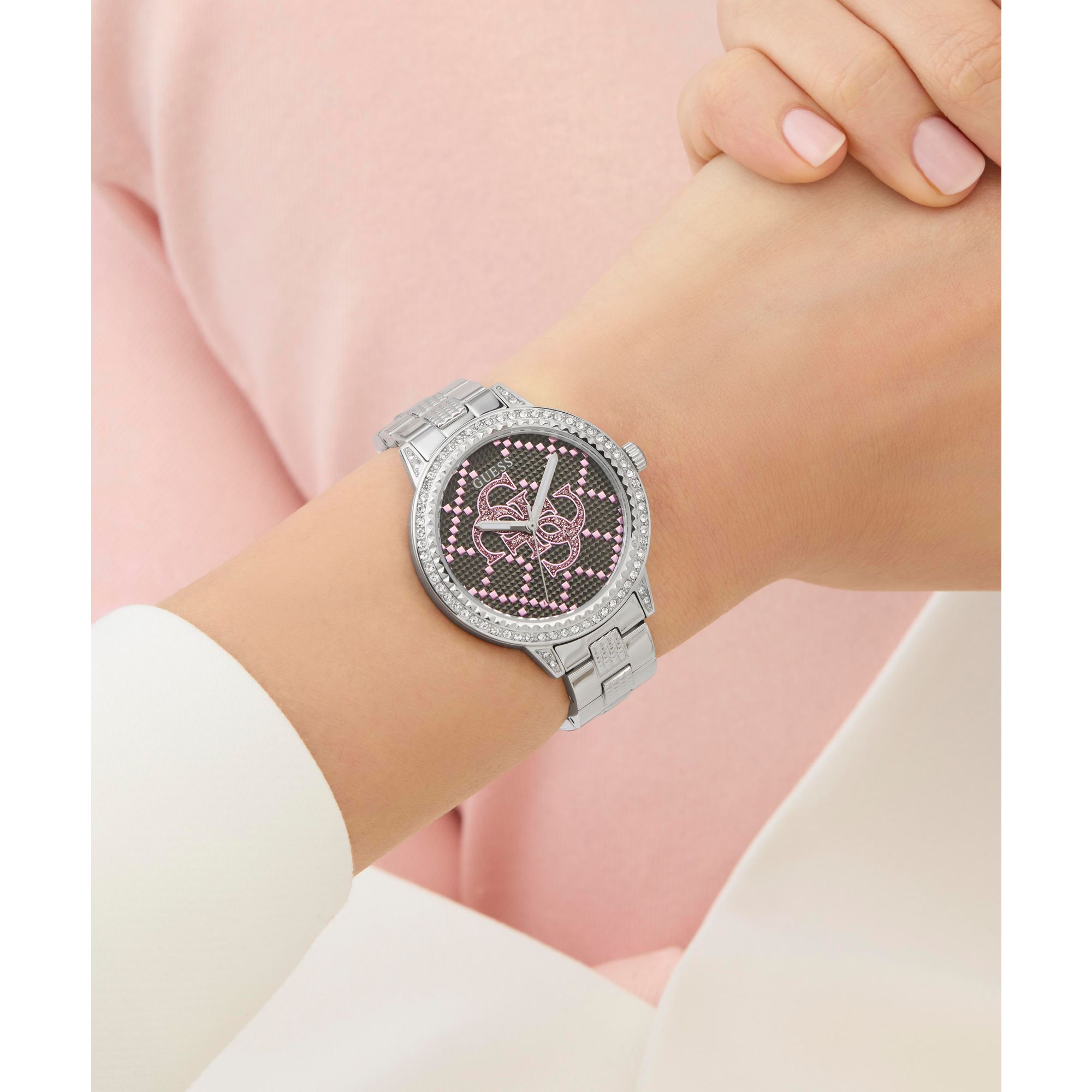 Жіночий годинник GUESS у сріблястому тоні поєднує елегантність і виразність. Круглий корпус 34 мм із кристалами на безелі і полірований браслет зі сталі створюють сяючий та вишуканий образ, а логотип Quattro 'G' у відтінку sorbet pink на циферблаті додає яскравий акцент.
