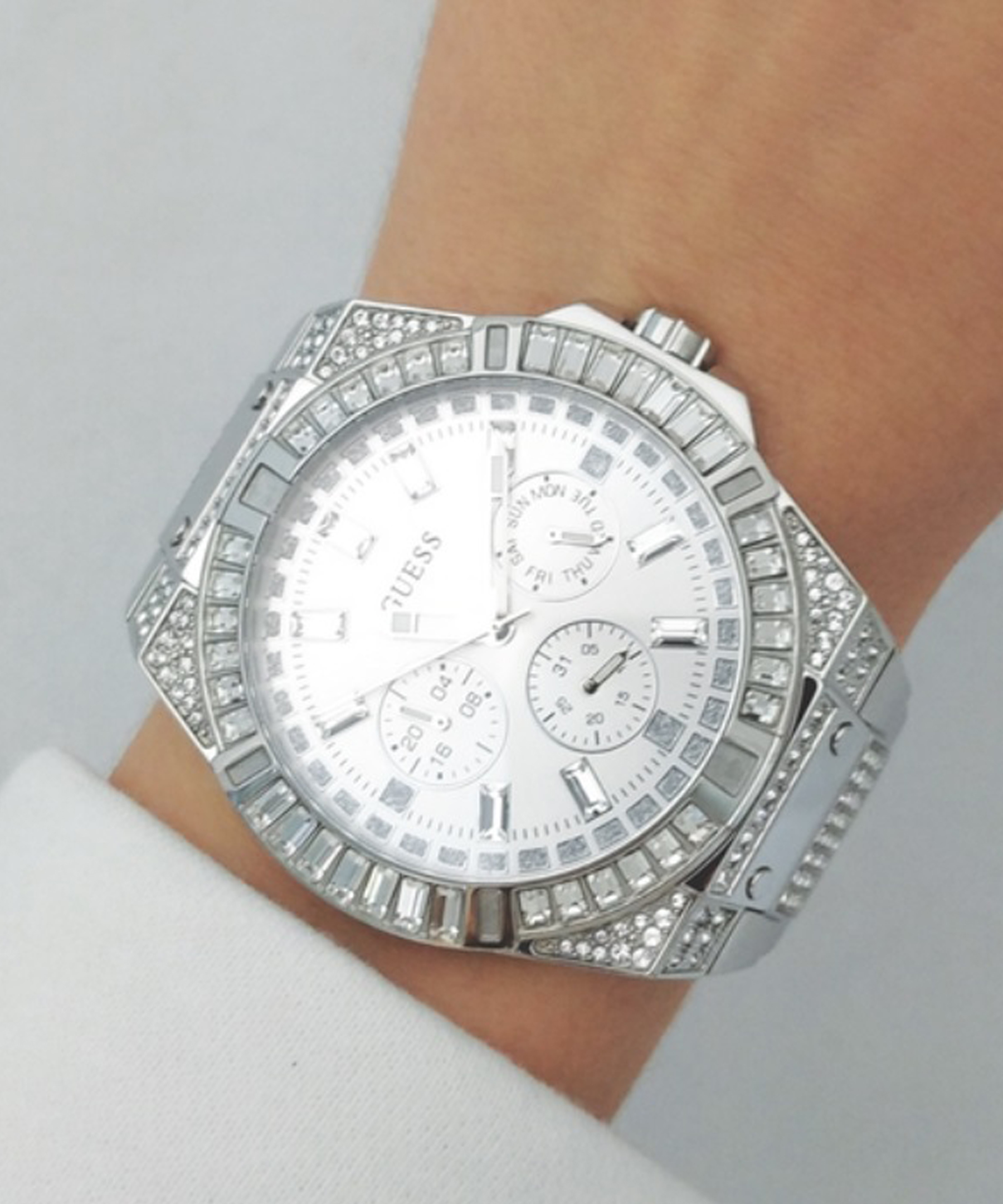 Оригинальные часы известного американского бренда GUESS. В часах установлен надежный кварцевый механизм Miyota. Стальной Silver Tone корпус и браслет. Диаметр корпуса – 47 мм. Застежка – складная клипса. Безель украшен кристаллами. Стрелки и индексы времени с люминесцентным покрытием. Сложный циферблат, показывающий дату и день недели, особенно крепкое минеральное стекло и водозащита в 5 АТМ – все это качественные дополнения к дорогому, романтичному образу.