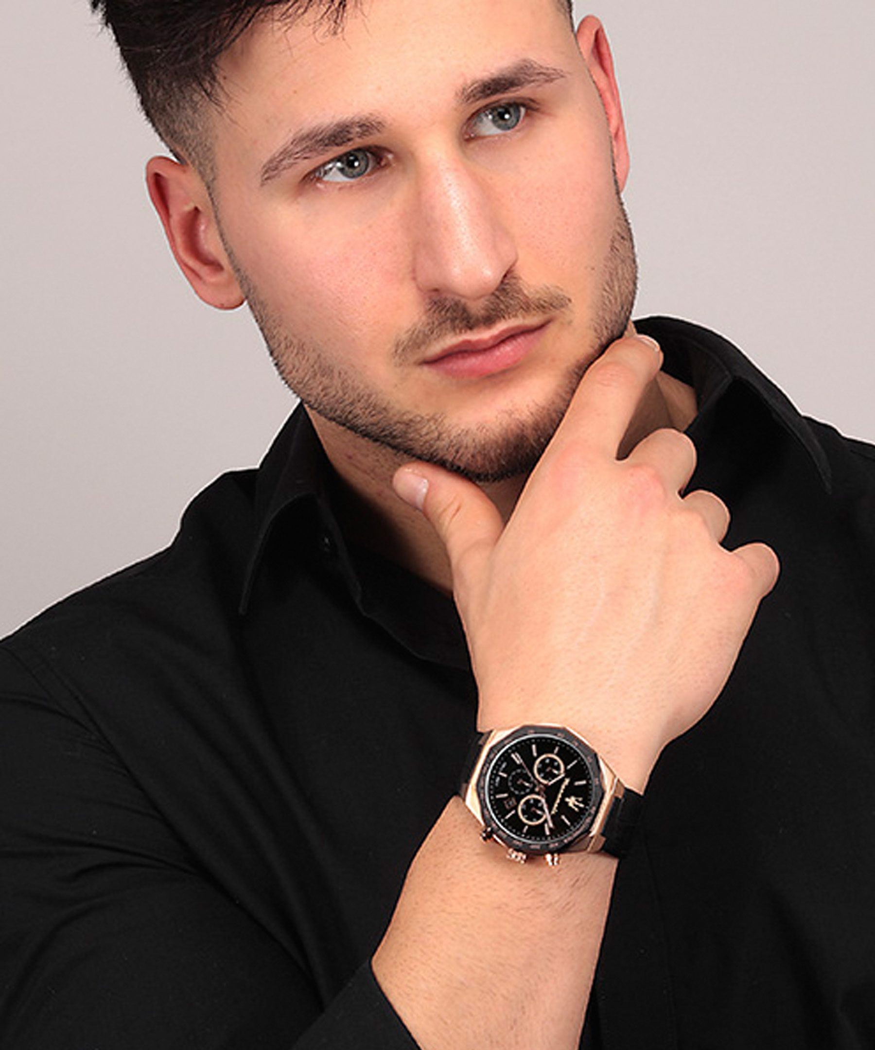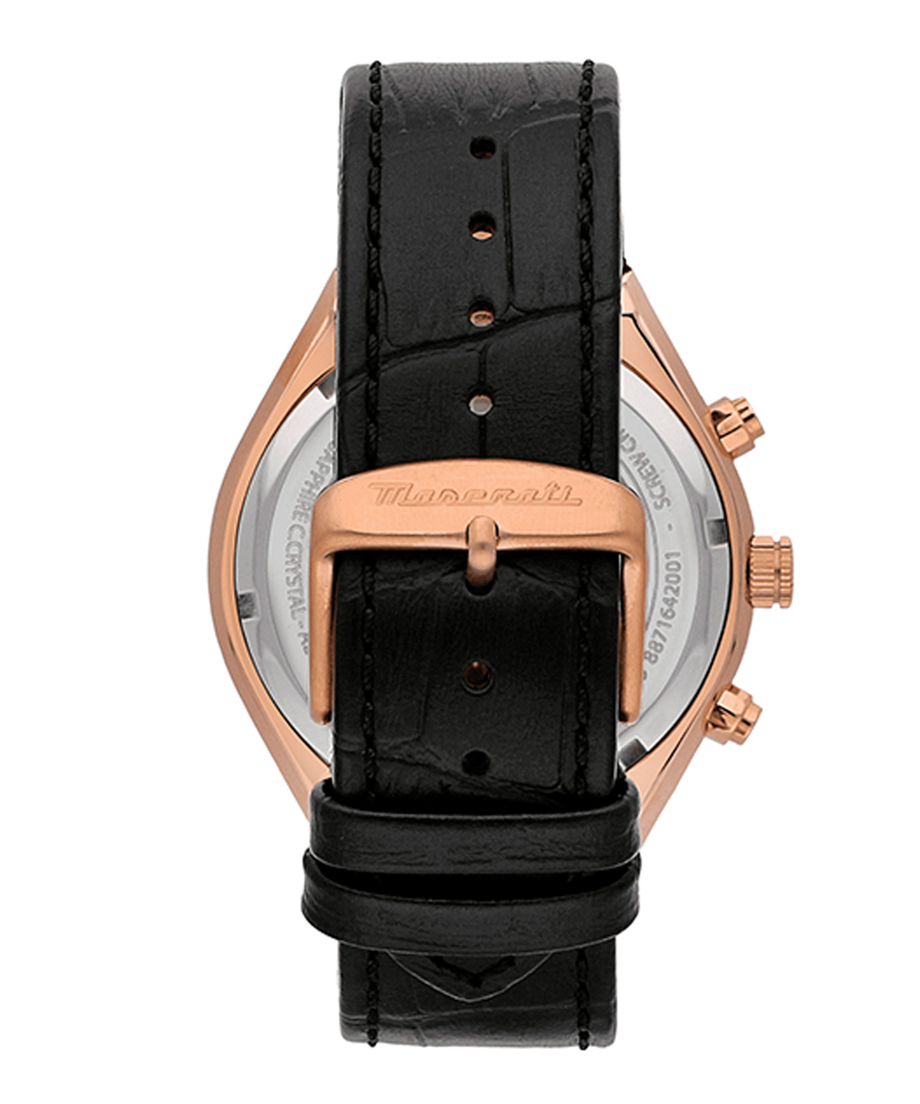 Чёрный циферблат украшен золотистыми стрелками и часовыми метками, обеспечивающими чёткое считывание времени. Три дополнительных циферблата выполняют функции хронографа и 24-часового формата времени, добавляя функциональности и динамичности дизайну. Окошко даты расположено между отметками 4 и 5 часов, что придаёт дополнительное удобство.