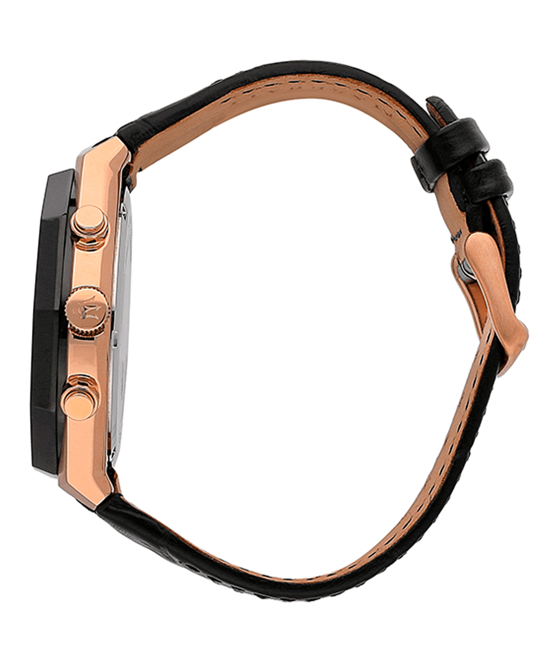 Чёрный кожаный ремешок с раскладывающейся застёжкой обеспечивает надёжную фиксацию на запястье и комфорт при носке.