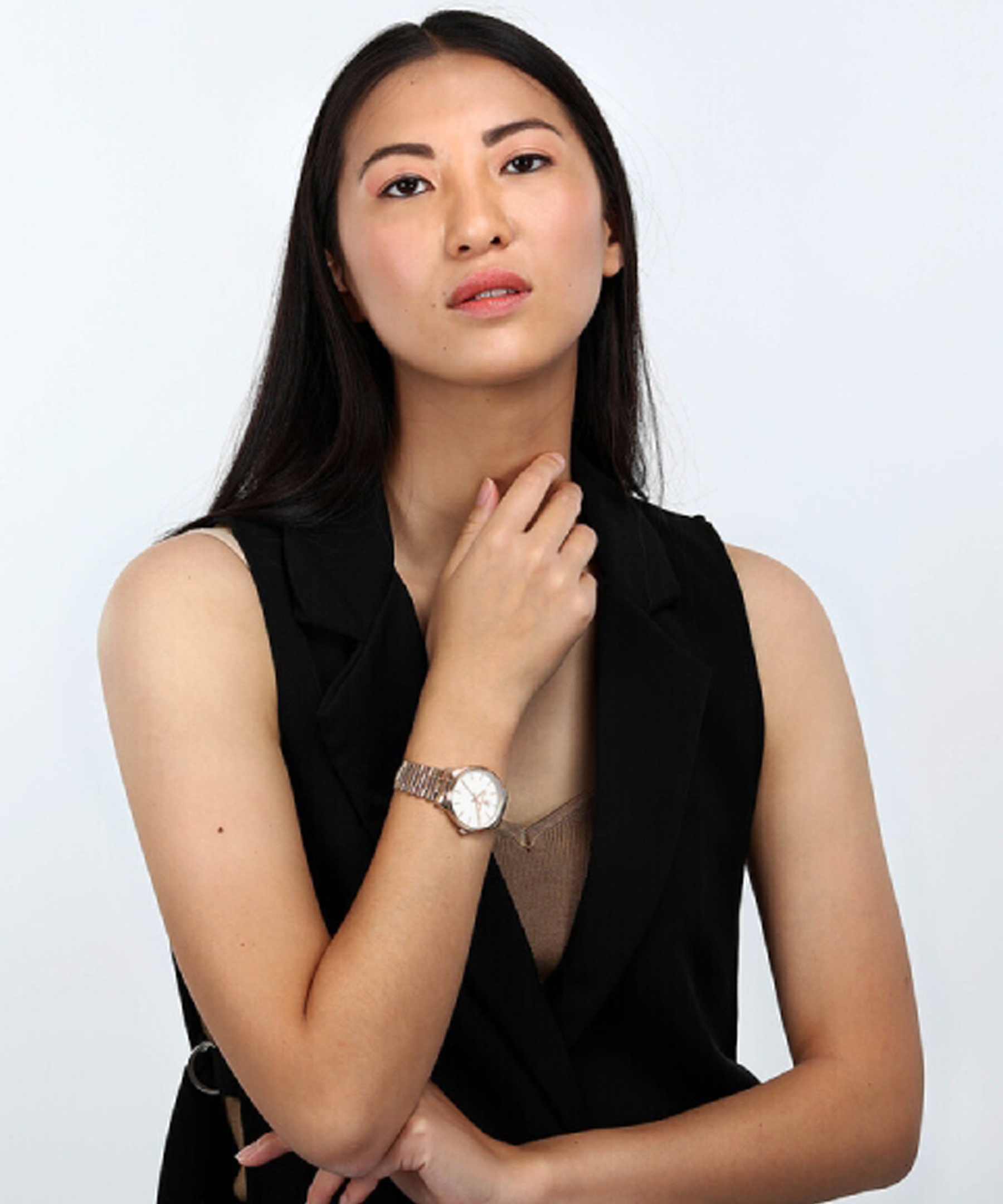 Модель оснащена точным кварцевым механизмом, обеспечивающим безупречную работу часов. Корпус и браслет выполнены из нержавеющей стали с благородным цветовым покрытием розового золота, которое придает образу тепла и роскоши.