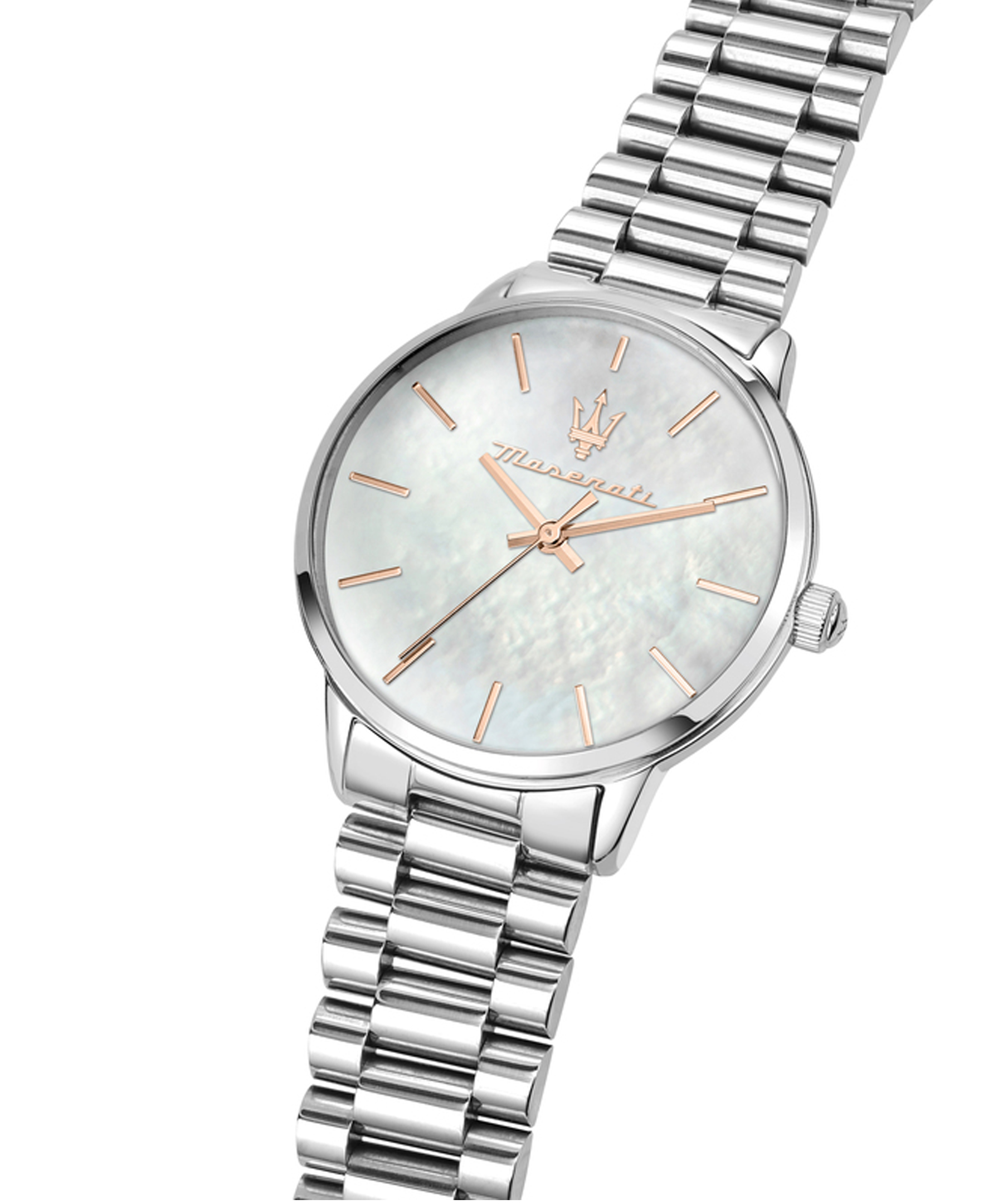 Классические женские часы MASERATI R8853147507 с надежным кварцевым механизмом. Стальной корпус и браслет. Диаметр корпуса 36 мм, толщина – 8 мм. Застежка – сложная клипса. Золотые метки времени и стрелки. Перламутровый аналоговый циферблат защищен минеральным стеклом. Водозащита – 5 АТМ.