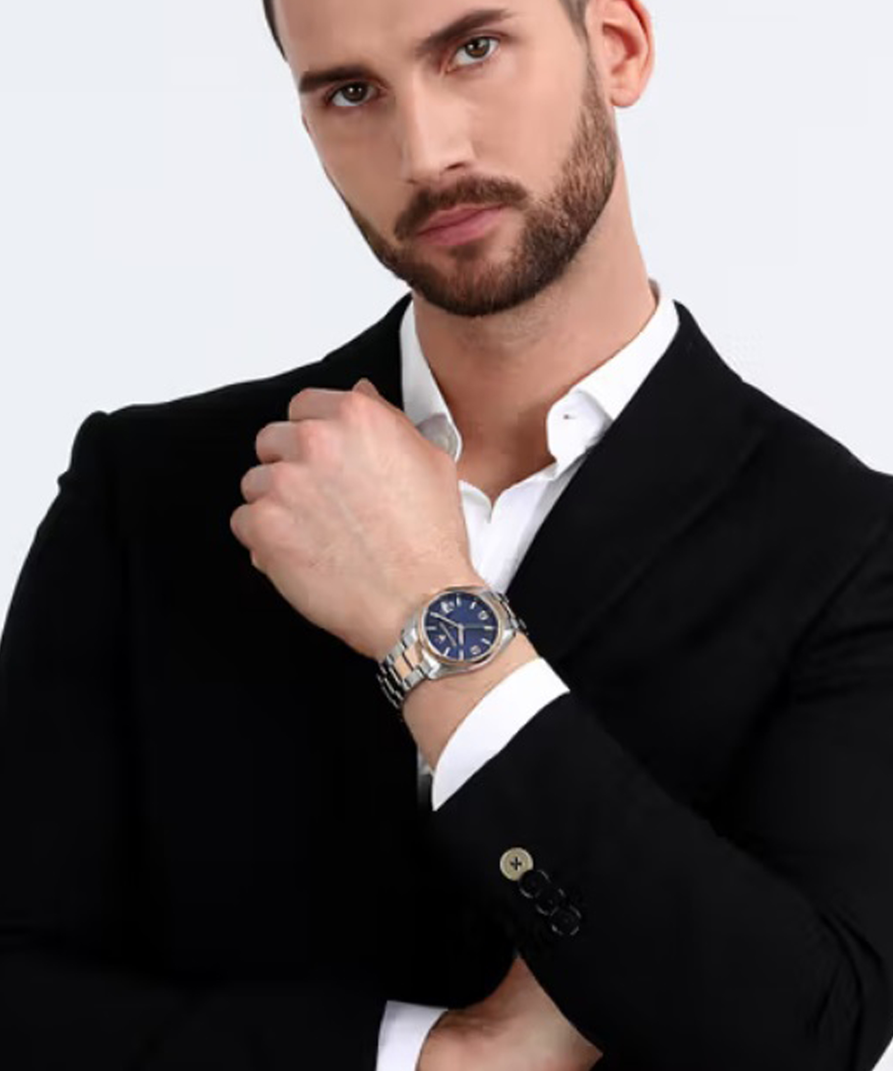 Диаметр корпуса 43 мм придает часам выразительный вид, а аналоговый циферблат темно-синего цвета в сочетании с золотистыми стрелками и метками времени придает ему роскошный шарм. Дополнительное окошко даты увеличивает функциональность, а минеральное стекло надежно защищает циферблат от царапин, сохраняя его безупречный вид.