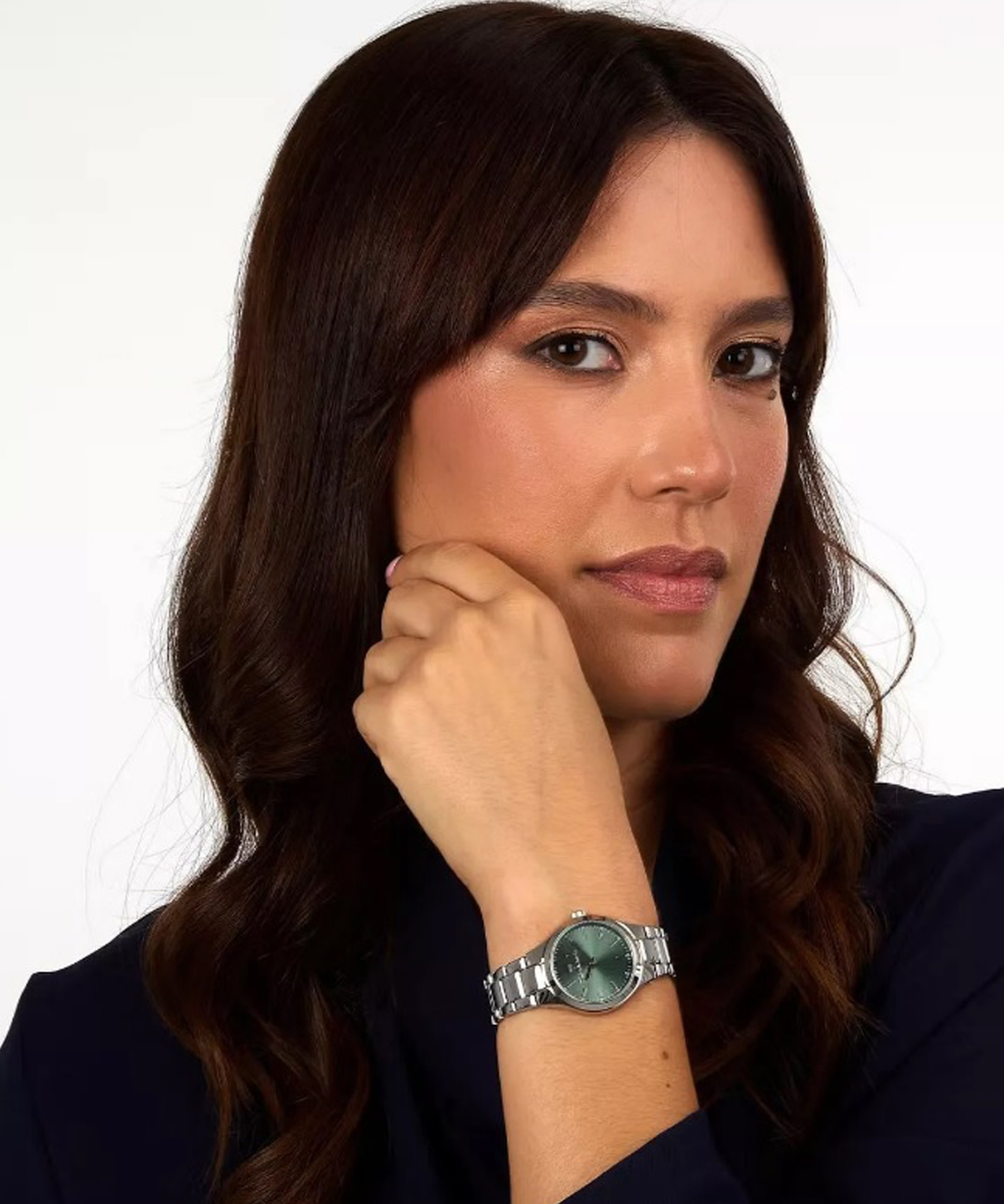Диаметр корпуса 30 мм придает часам изящный вид, а зеленый перламутровый циферблат, который защищен минеральным стеклом, придает особый шарм. Водозащита 5 АТМ позволяет без забот носить часы даже в дождливую погоду или во время водных процедур.