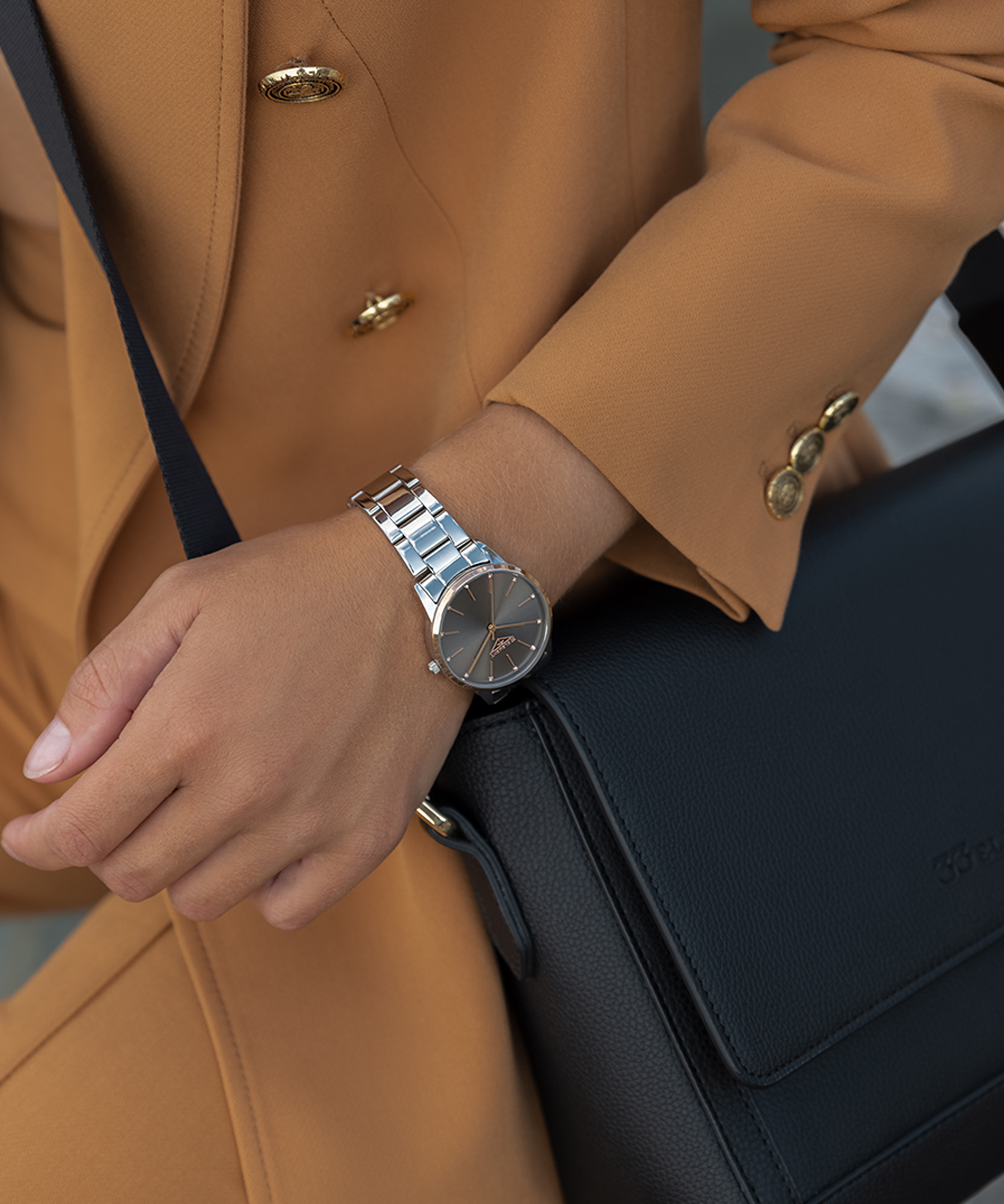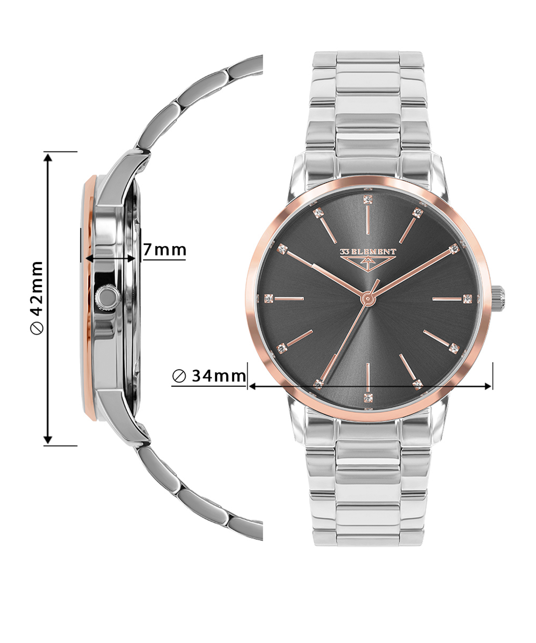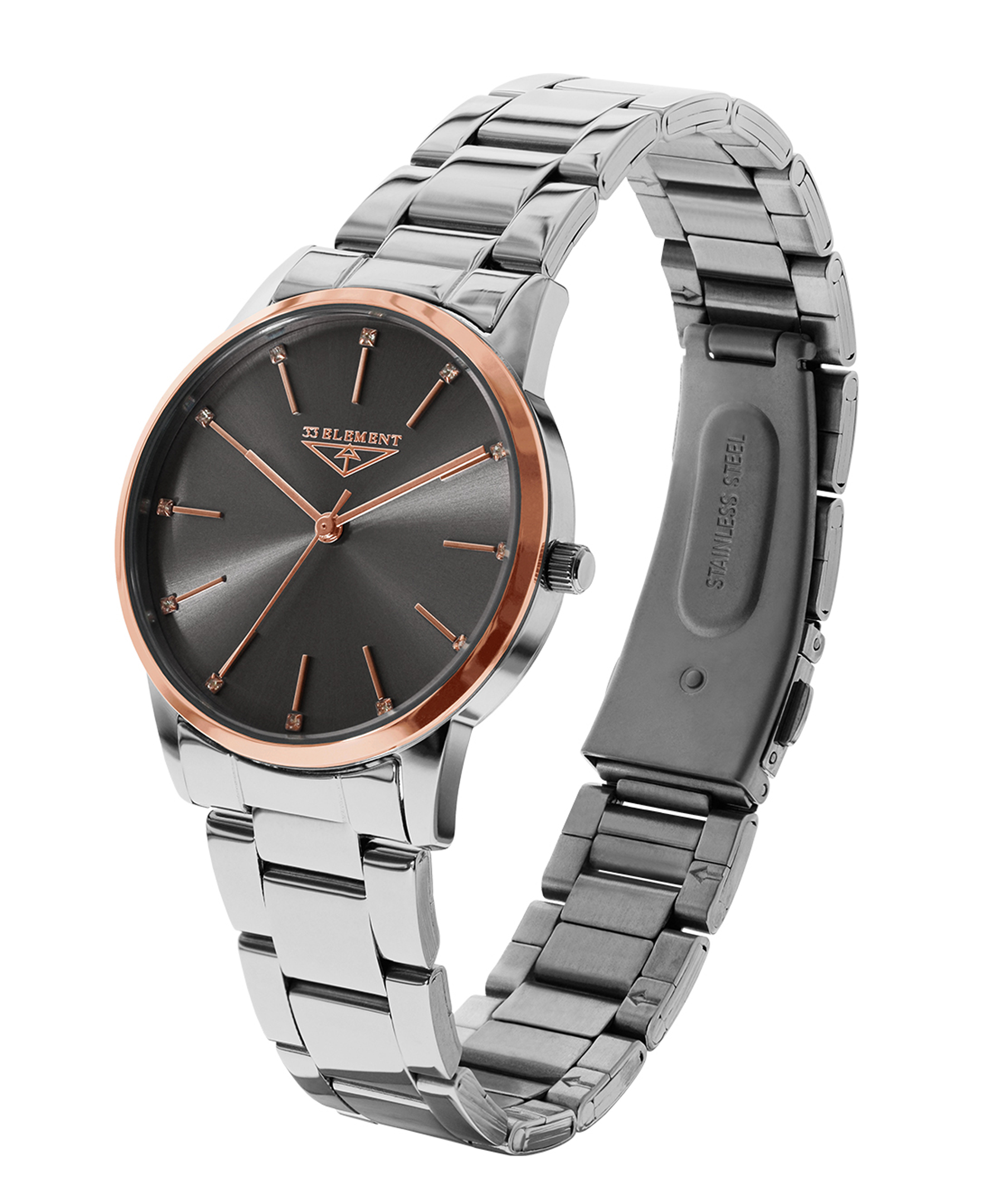 Класичний жіночий годинник литовського бренду 33 Element з високоточним швейцарським механізмом виготовлений з якісної сталі з частковим IP напиленням рожевого золота. На чорному із сатиновим блиском циферблаті золотисті мітки часу, стрілки та логотип бренду, які дуже елегантно поєднуються з кристалами у вигляді міток часу. Мінеральне скло з сапфіровим покриттям дуже надійно захищає механізм від пошкоджень і має ефект антивідблиску. Традиційний металевий браслет контрастує з елегантністю корпусу, посилюючи цим дизайнерські ідеї аксесуара. Вишуканість та строгість моделі роблять її універсальною у створенні Вашого образу.