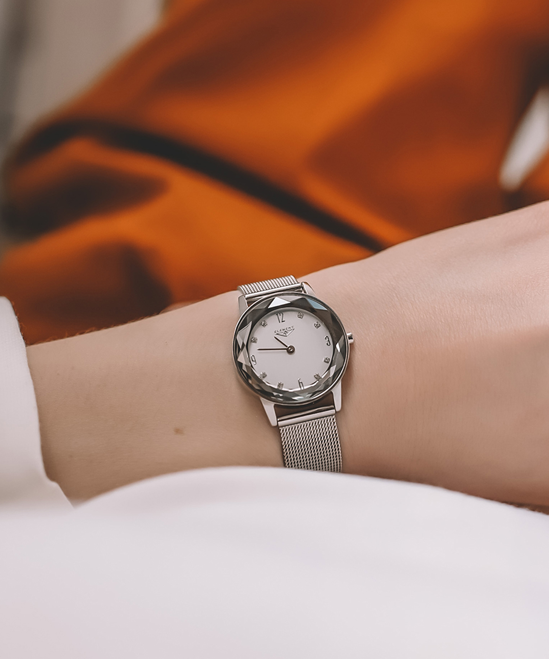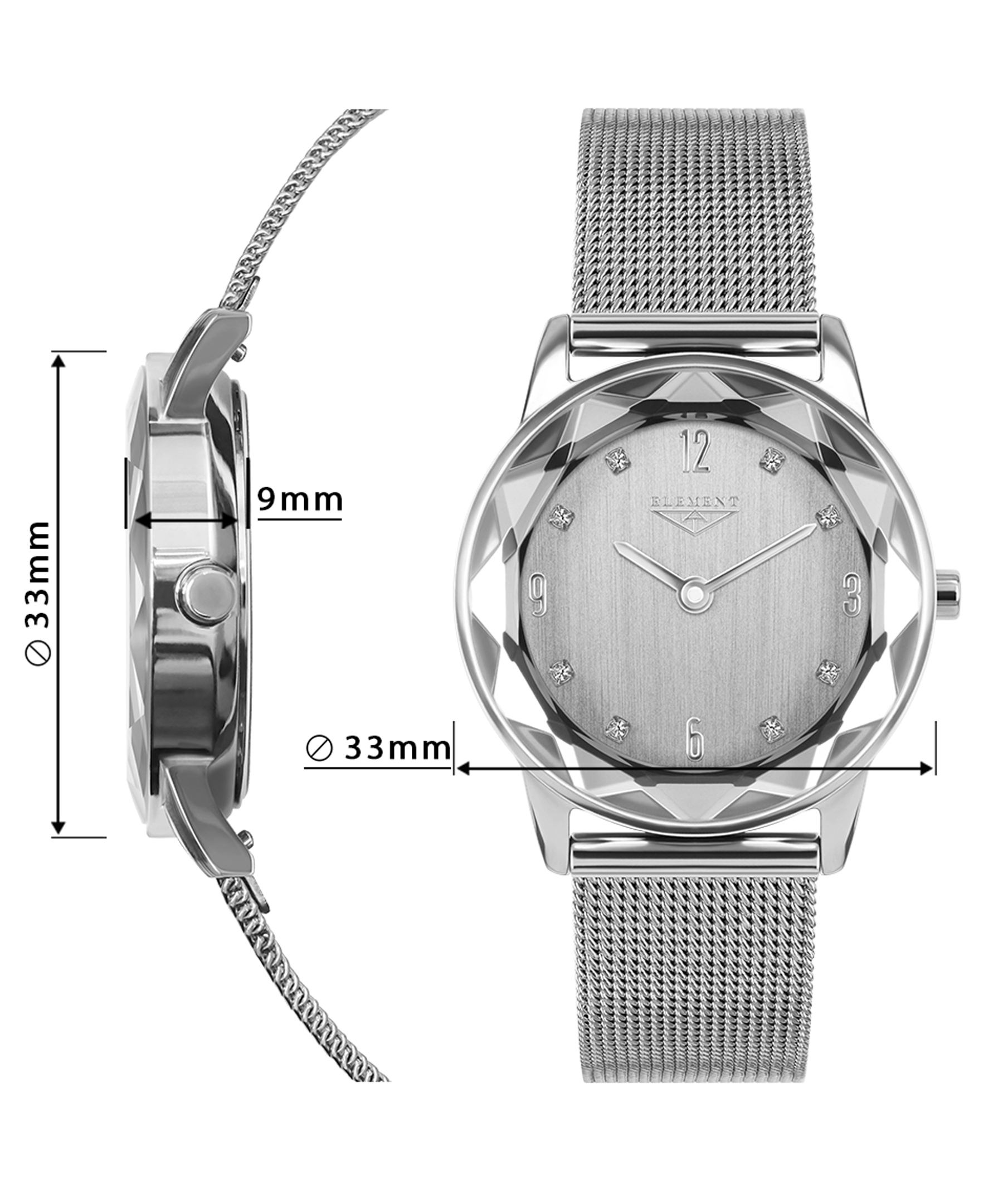 Витончений жіночий годинник 33 Element у класичному стилі з точним швейцарським механізмом Ronda виготовлений з нержавіючої сталі у срібному кольорі. Діаметр корпусу 33 мм. На сріблястому циферблаті з арабськими цифрами сяють кристали Сваровські, виконуючи функції індексів часу. Скляний безель складної гранованої форми, заломлюючи світло, підкреслює блиск каменів та сапфірового скла. Сталевий браслет міланського плетіння у срібному кольорі завершує елегантний образ аксесуара.