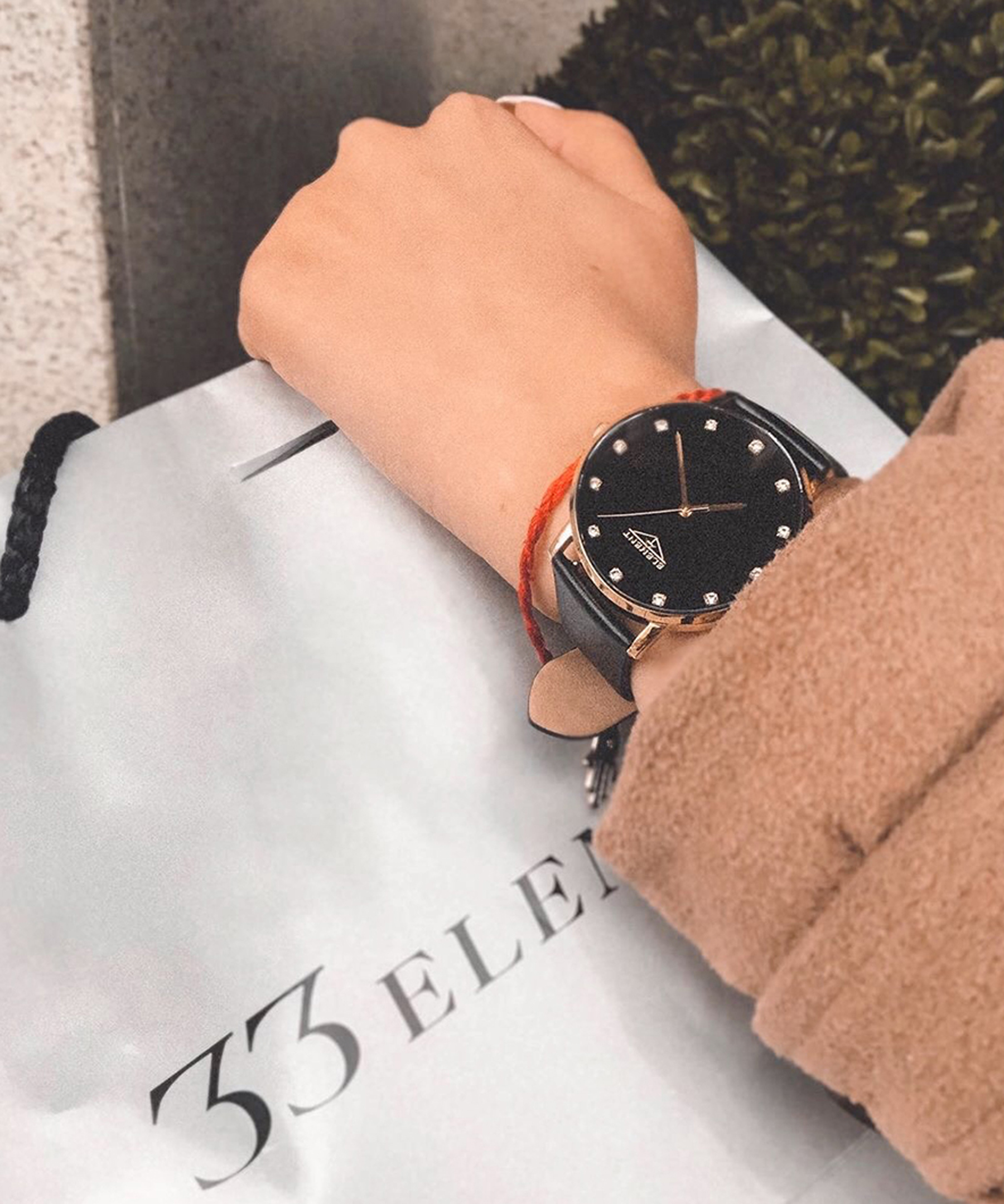 Глибокий чорний циферблат із аналоговою індикацією прикрашений вишуканими кристалами, що виблискують при світлі, додаючи жіночності. Надійний захист забезпечує сапфірове скло, стійке до подряпин і пошкоджень.