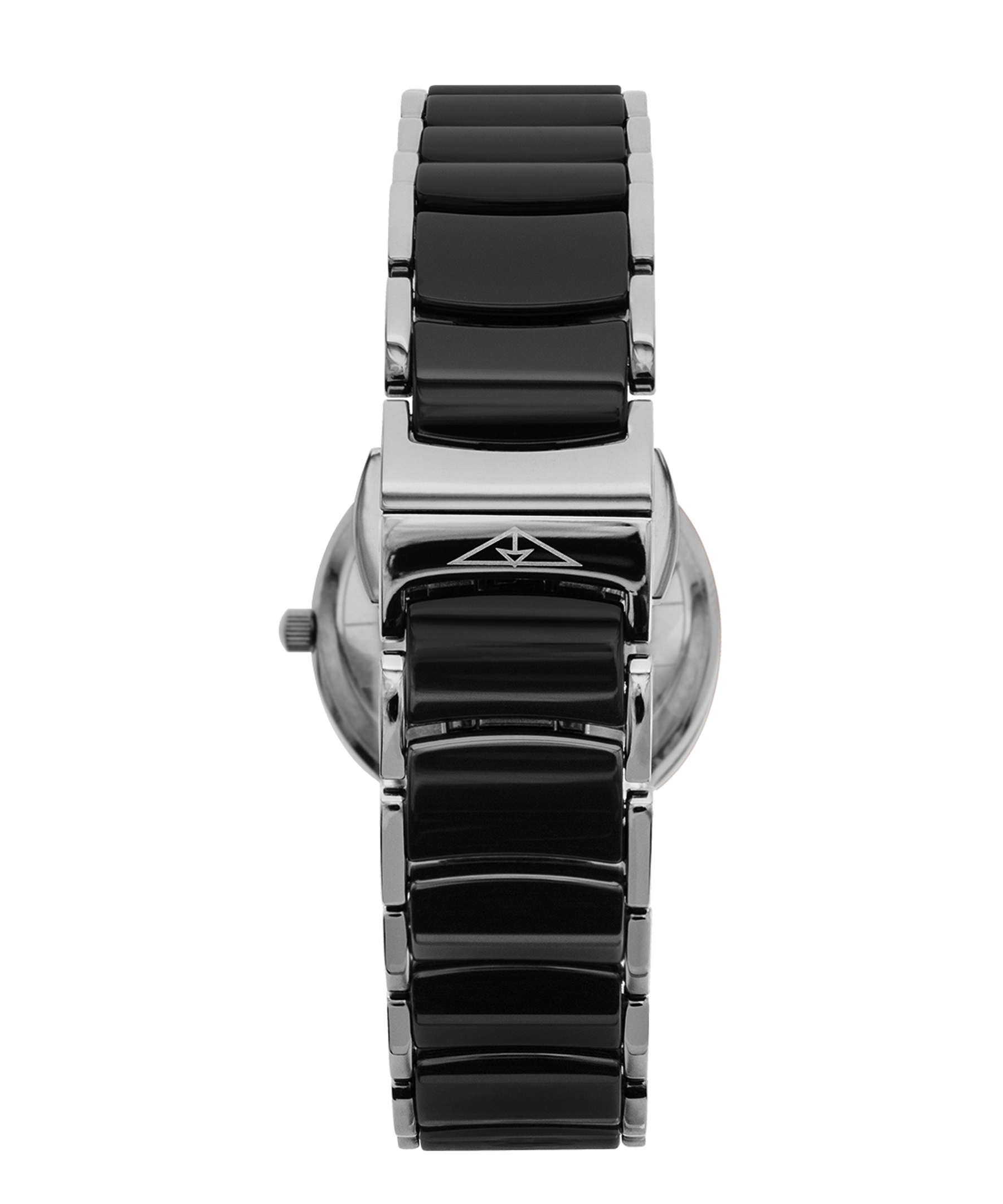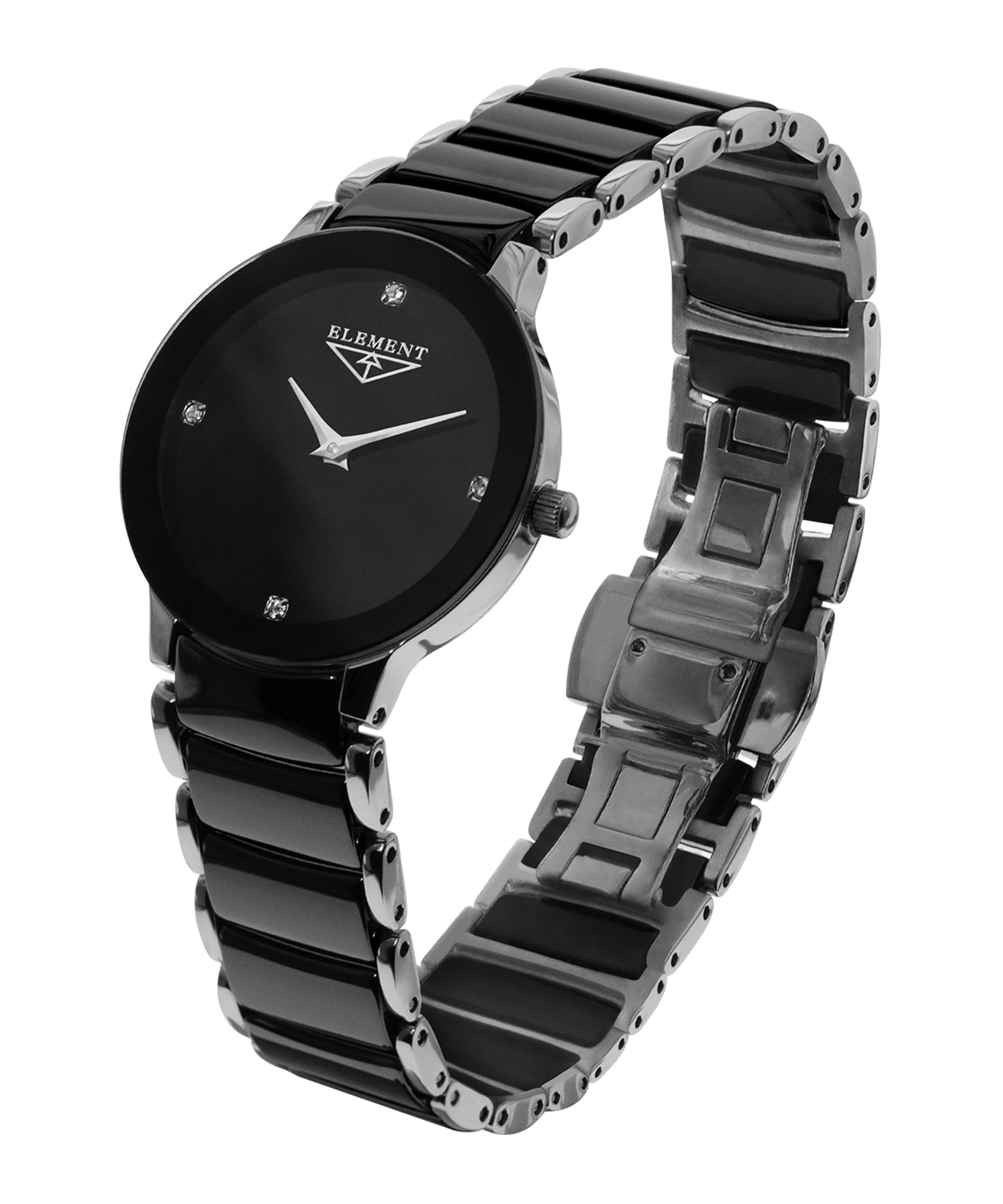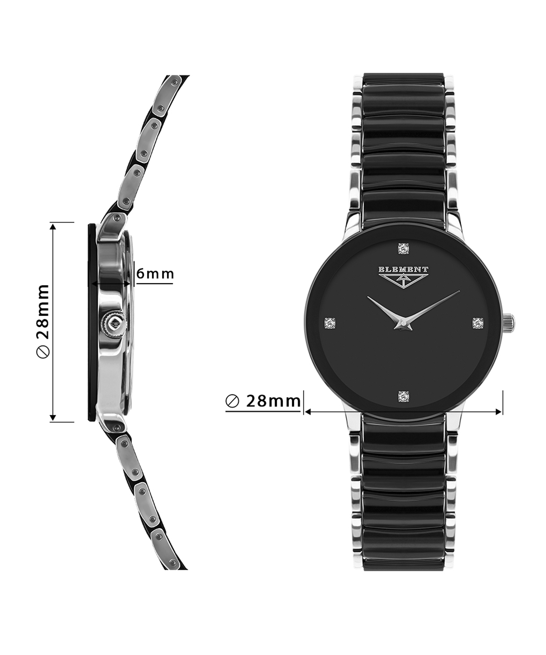 Вишуканий жіночий наручний годинник 33 Element в класичному стилі з точним швейцарським механізмом Ronda. Корпус годинника виготовлений із високоякісної нержавіючої сталі з покриттям Black. Діаметр корпусу 28 мм. На аналоговому циферблаті чорного кольору сяють чотири великі кристали Сваровські у вигляді індексів часу. Сапфірове скло елегантно блищить. Керамічний браслет чорного кольору з срібними металевими вставками надає годинникам особливий шик. Жіночий образ у сріблясто-чорній гамі створює атмосферу таємничості та вечірнього настрою.