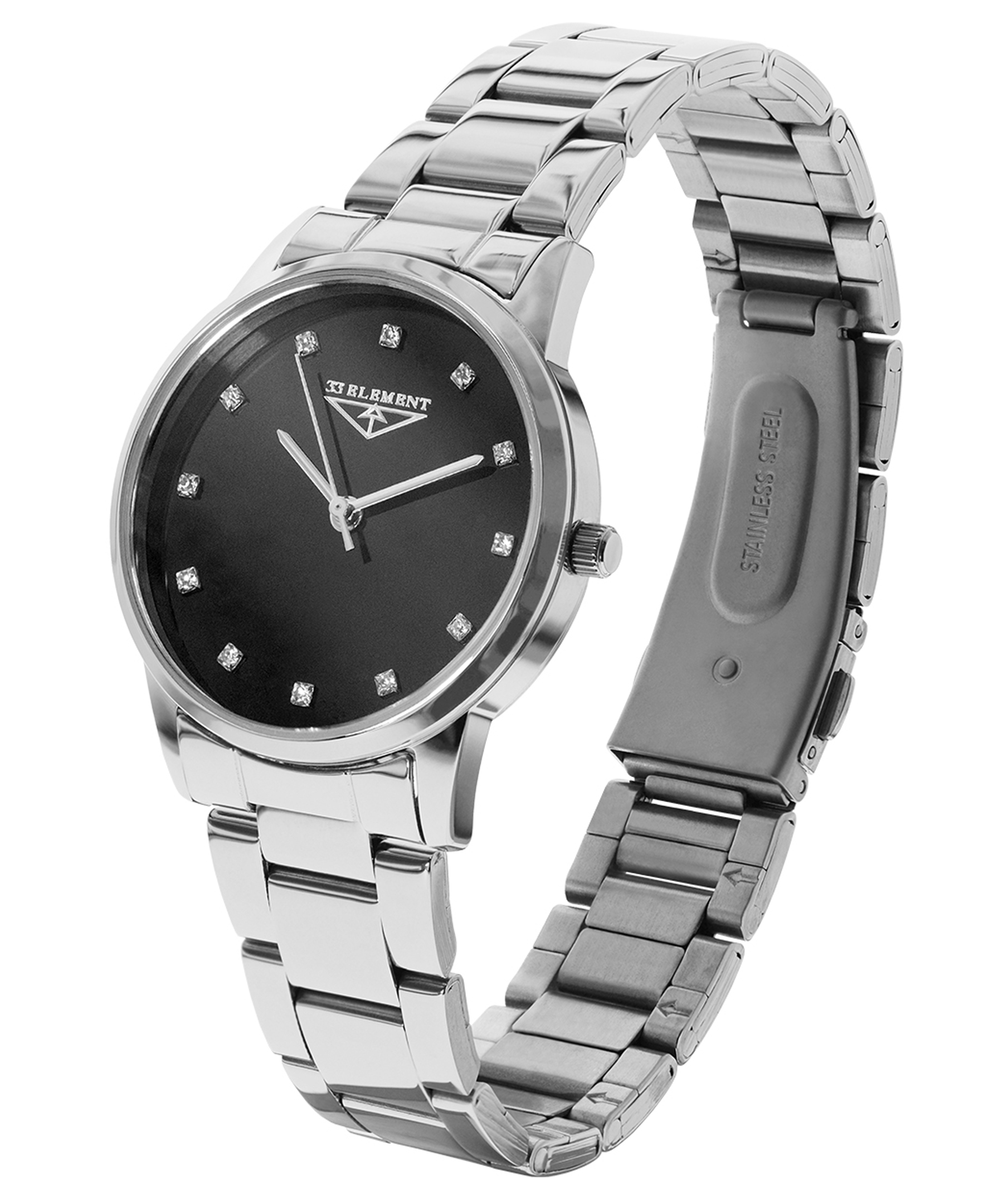 Жіночий годинник 33 Element модель 331833 поєднує стильний мінімалістичний дизайн із класичною елегантністю. Він має круглий сріблястий корпус і металевий браслет, що робить його ідеальним для повсякденного носіння або офіційних подій. Чорний циферблат прикрашений невеликими камінцями замість цифр, додаючи виробу вишуканості. Надійний кварцовий механізм забезпечує точність ходу. Цей годинник стане чудовим аксесуаром для жінок, які цінують простоту і елегантність.
