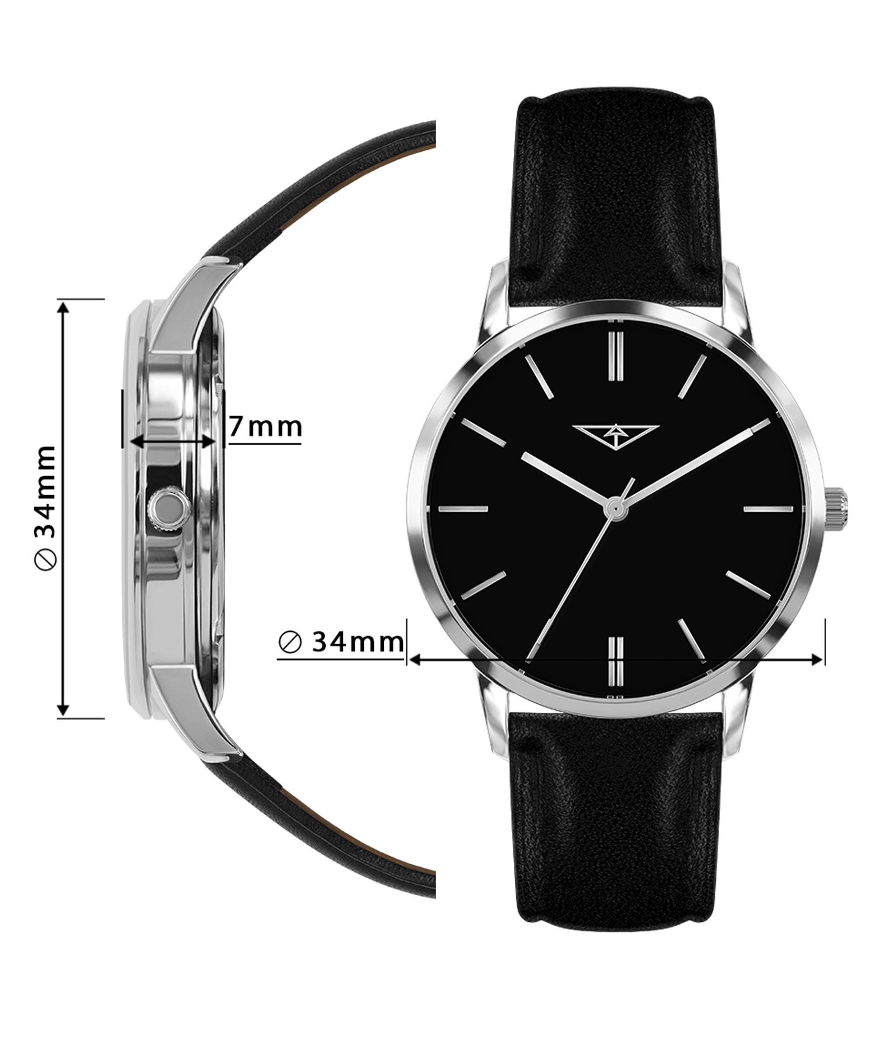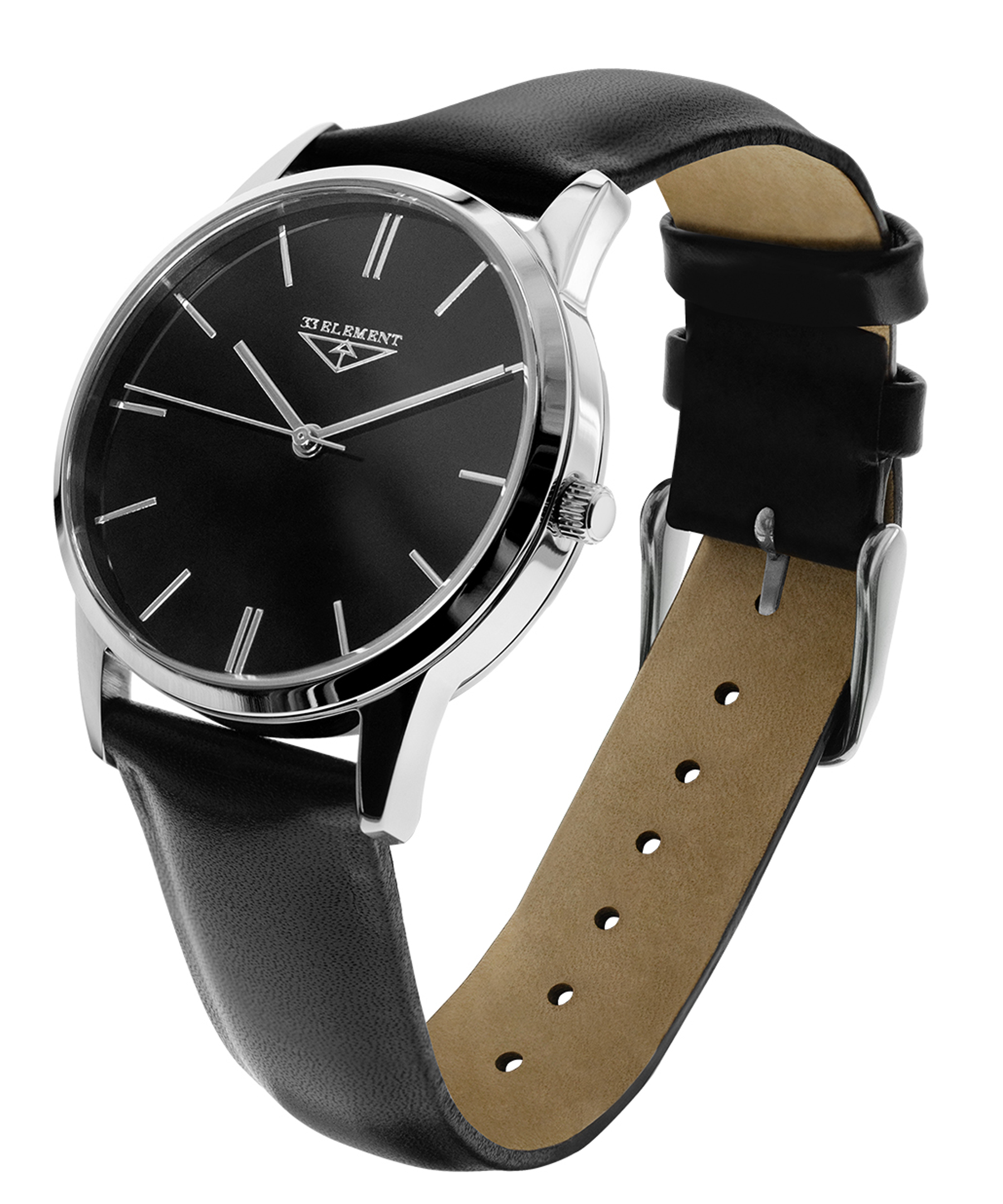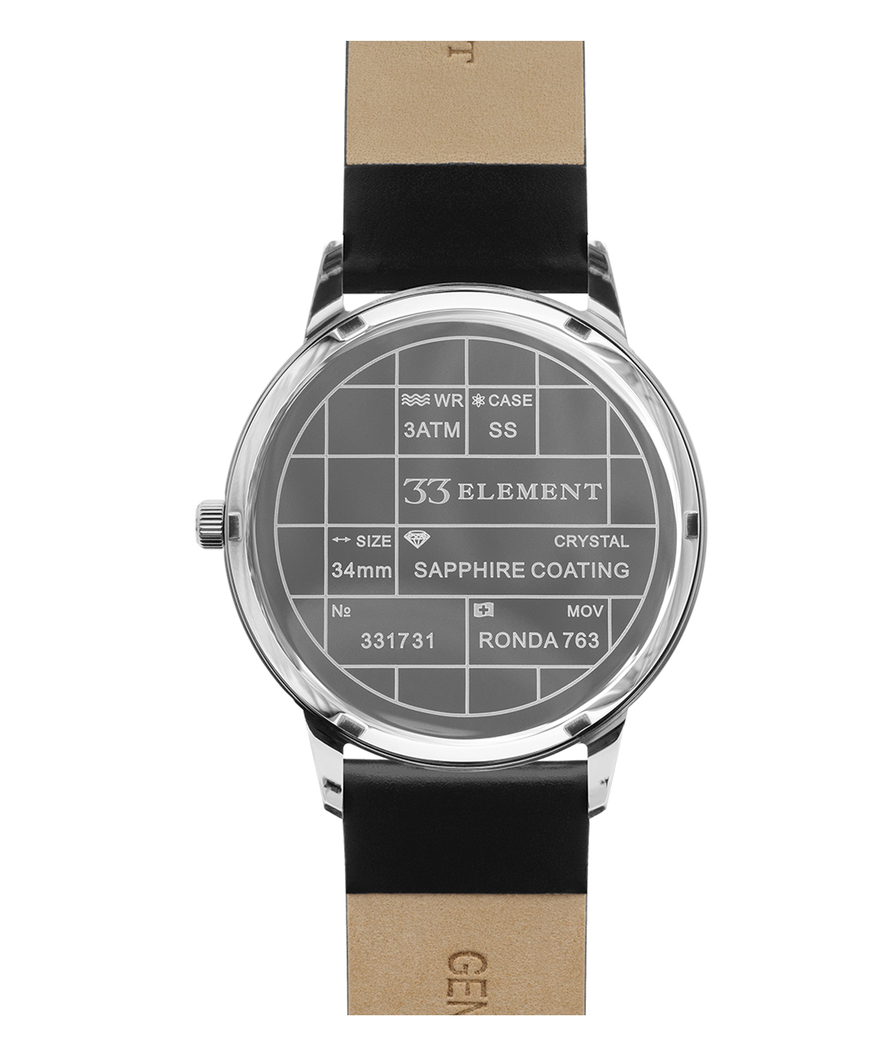 Стильний жіночий наручний годинник 33 Element з високоточним швейцарським механізмом Ronda виготовлений з якісної сталі. Діаметр корпусу - 34 мм. На чорному циферблаті розташовані елегантні, у вигляді тонких сріблястих штрихів, індекси часу. Мінеральне скло з сапфіровим покриттям має властивость антивідблиску та має високий рівень прозорості та міцності. Простота ліній, класичний дизайн, зручний шкіряний ремінець та універсальність кольору роблять цю модель однією з найпопулярніших та підкреслюють вишуканий смак жінки.