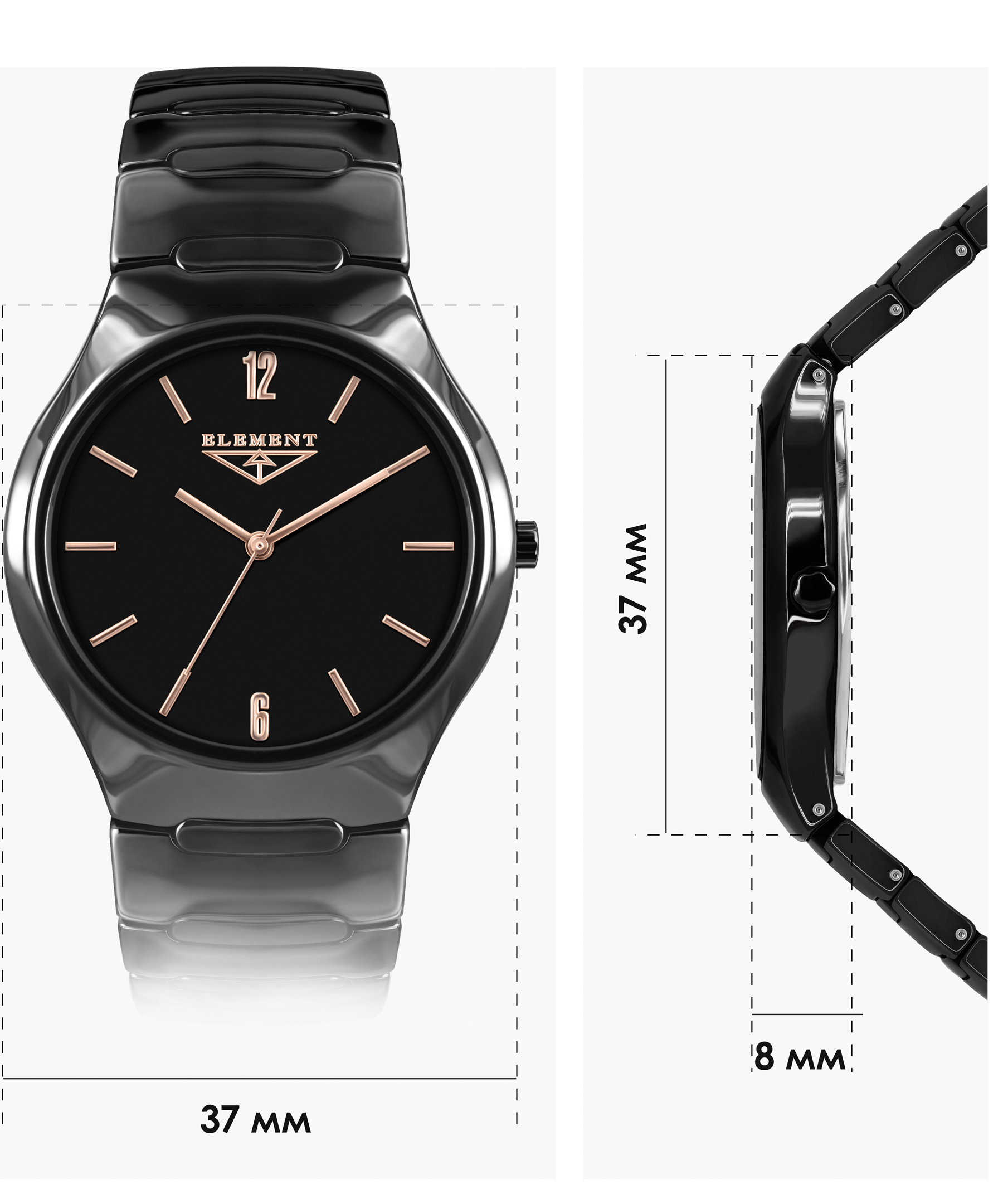 Міцний керамічний корпус діаметром 37 мм виконаний у глибокому чорному кольорі, що додає образу стриманої розкоші.