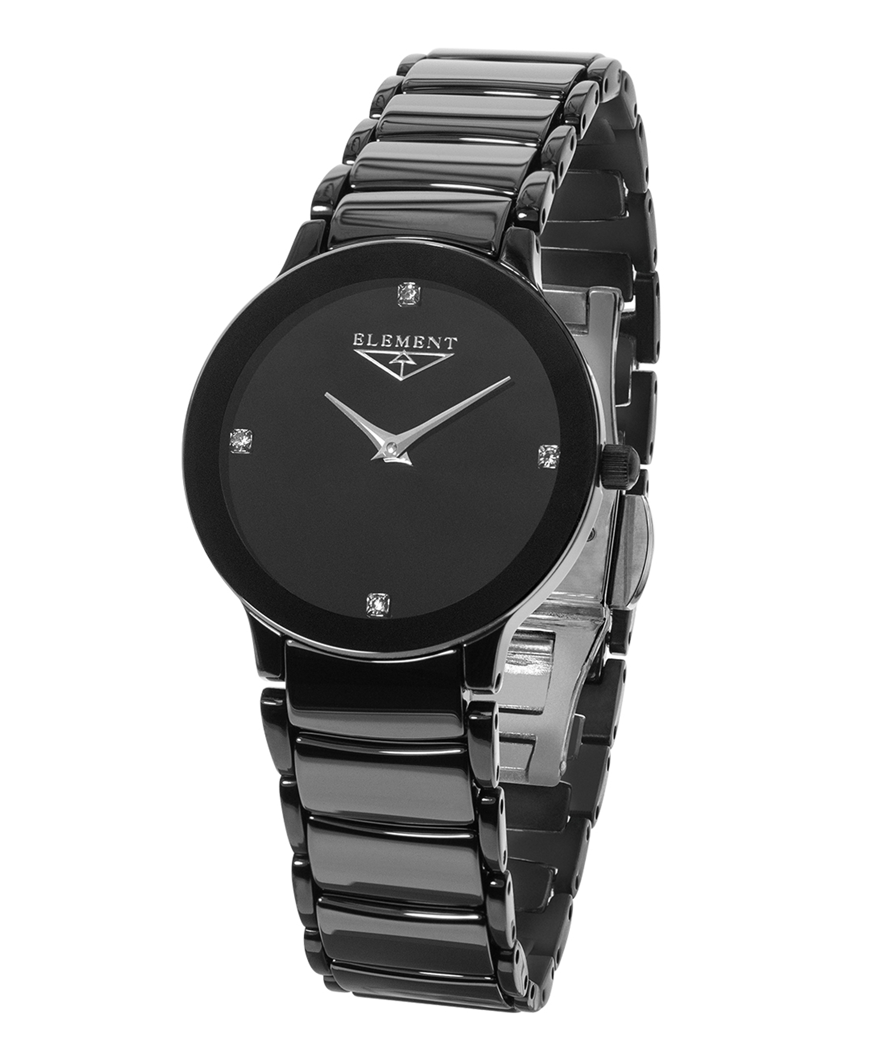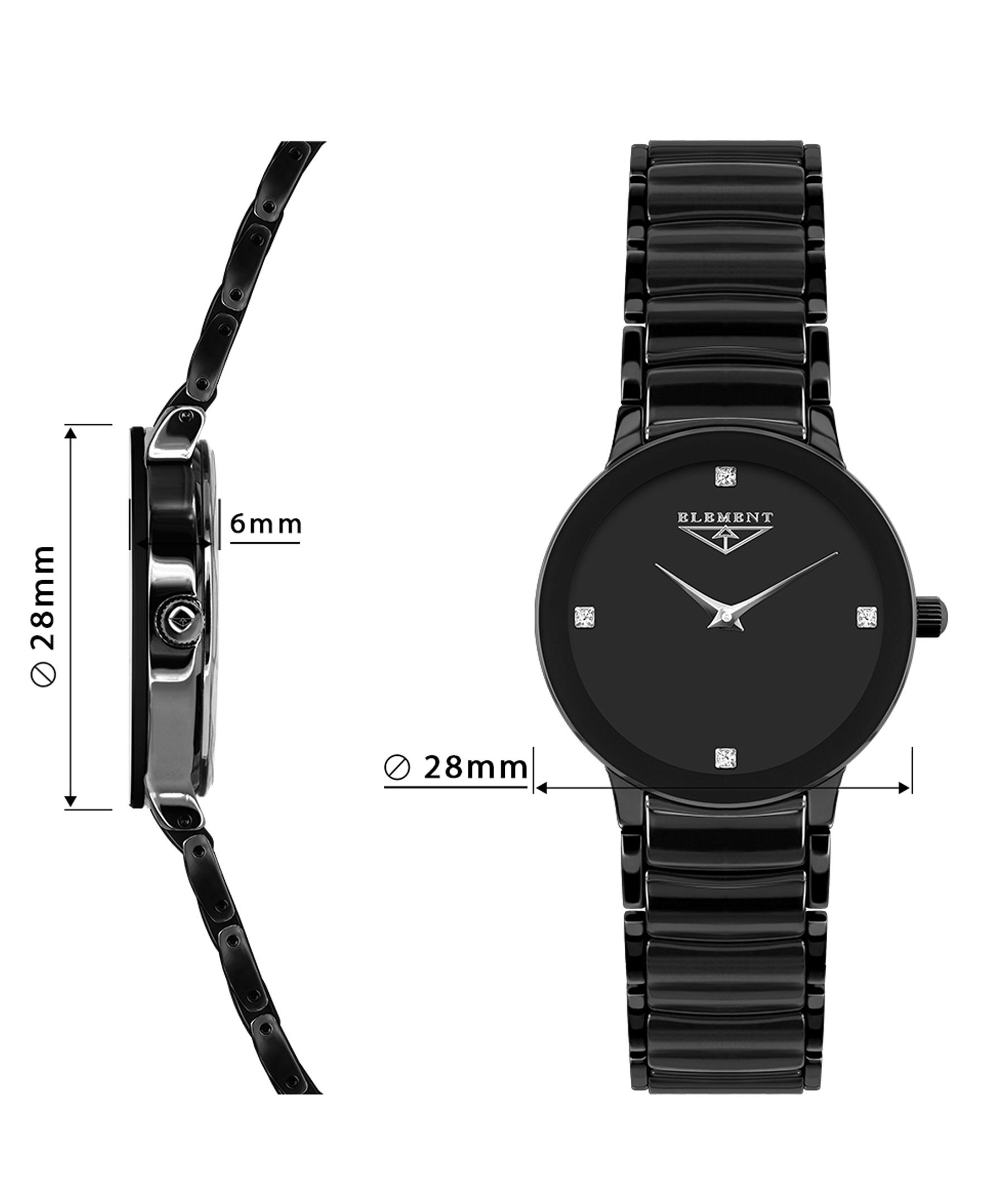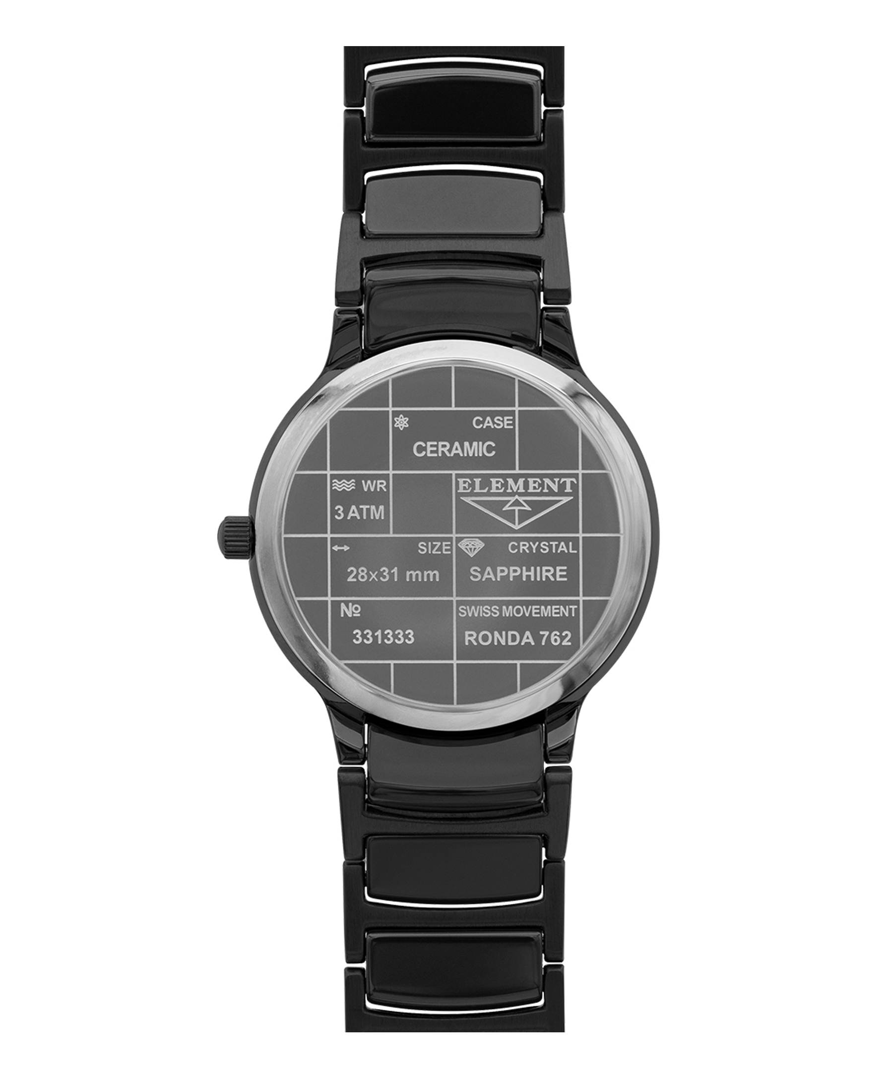 Усередині годинника працює швейцарський кварцовий механізм Ronda, що забезпечує точність і надійність у щоденному користуванні. Корпус діаметром 28 мм, виготовлений із високоякісної нержавіючої сталі, покритий елегантним чорним кольором, що чудово поєднується з будь-яким стилем. Керамічний браслет додає моделі сучасного звучання, забезпечуючи при цьому комфортне носіння. Водозахист рівня 3 ATM дозволяє не турбуватися про дрібні побутові контакти з водою.