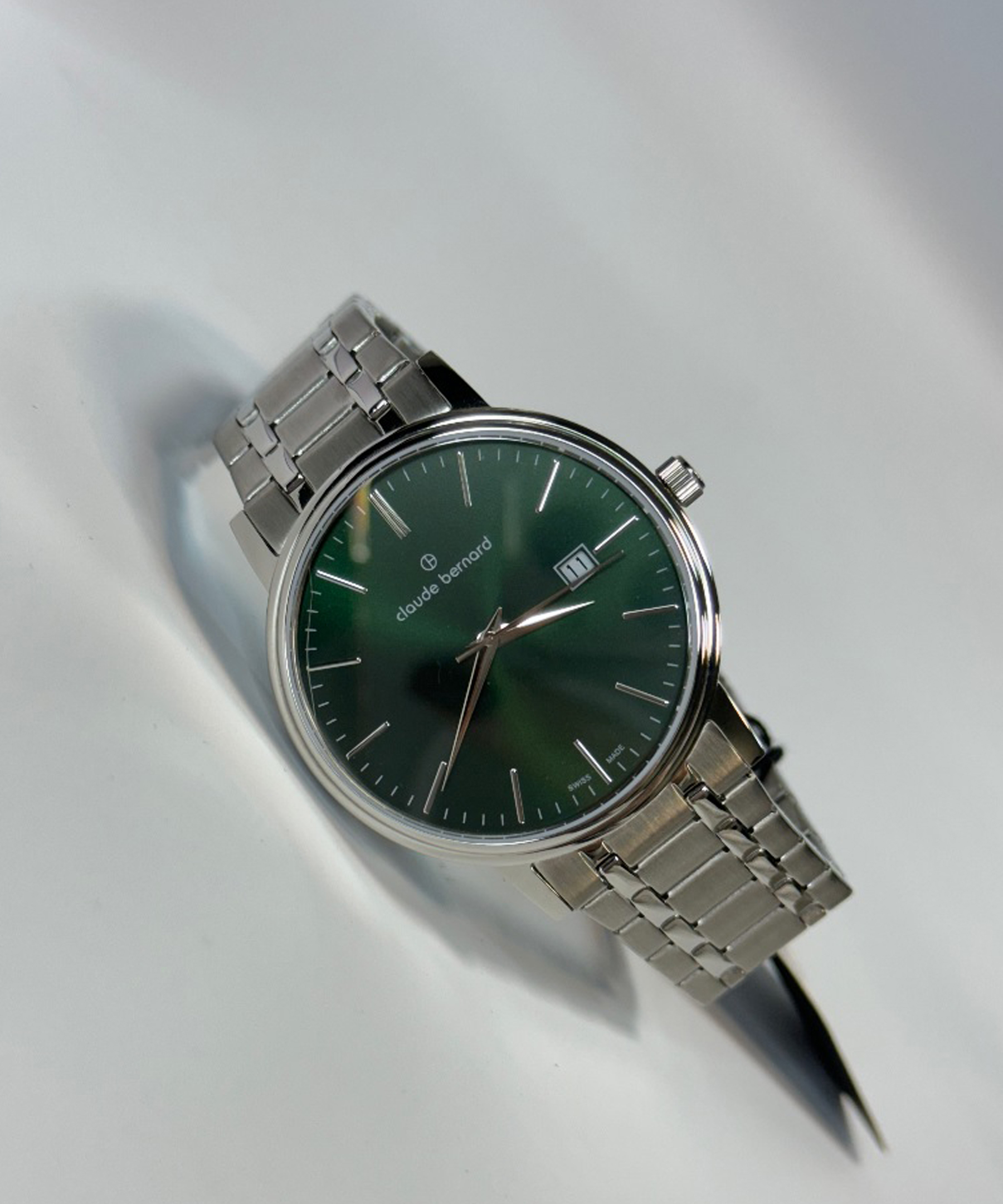 Глибокий зелений циферблат оздоблений тонкими сріблястими стрілками та часовими мітками, надаючи годиннику витончений вигляд. Віконце дати розташоване на позначці 3 години, забезпечуючи додаткову зручність.