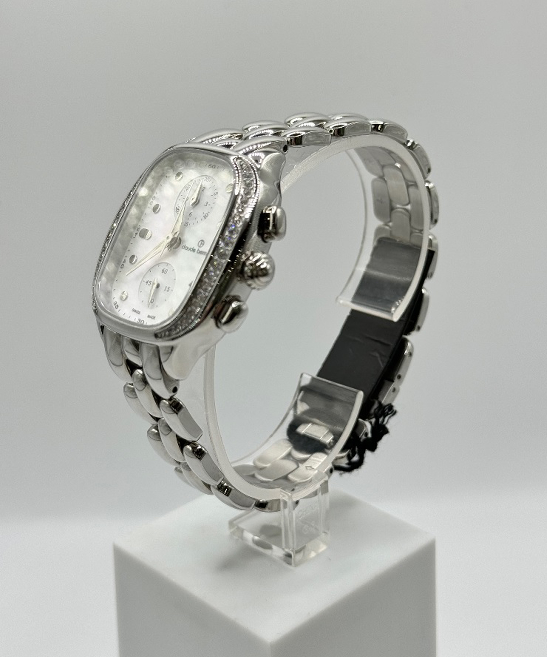 Дизайнерський жіночий годинник-хронограф відомого швейцарського бренду Claude Bernard з колекції Dress code з багатофункціональним кварцовим механізмом Ronda виготовлений зі сталі з PVD покриттям Silver Tone. На білому тлі циферблату мітки часу у вигляді витончених бусинок, прямокутна форма годинника підкреслюється безелем, декорованим кристалами Сваровські. Антивідблискове, особливої міцності та прозорості сапфірове скло надійно захищає механізм від пошкоджень. Браслет із дрібних ланок у вигляді намиста гармонійно вписується в образ аксесуара. Класична елегантність та швейцарська якість – основні акценти моделі, яка універсально поєднується з будь-яким одягом. Аксесуар цілком може використовуватись і як самостійна прикраса.