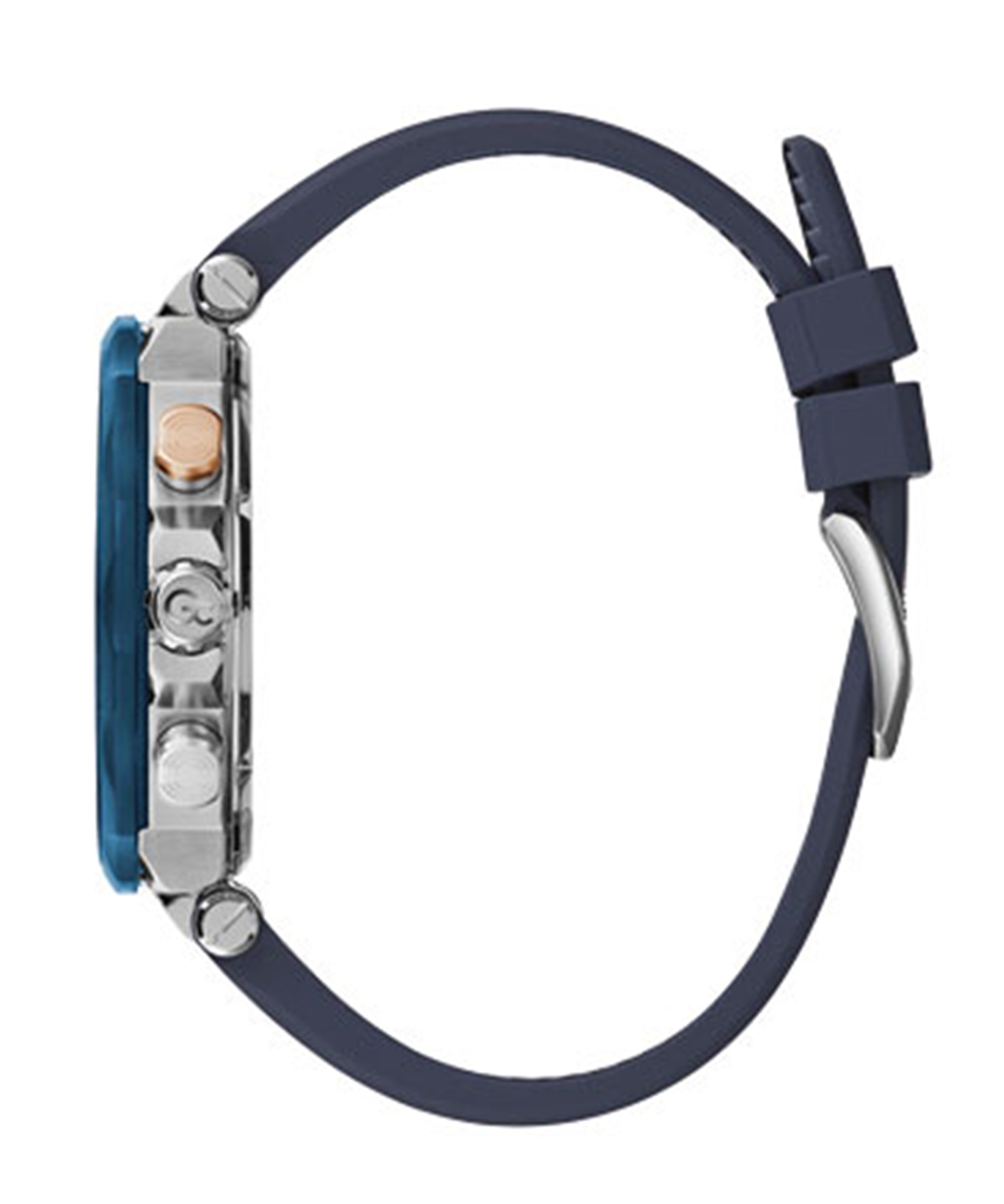 Синій циферблат з елегантним тисненням виглядає глибоко і розкішно, на ньому розташовані мітки часу, три хронографи, логотип і стрілки з люмінесцентним покриттям, що забезпечують відмінну видимість при будь-яких умовах освітлення. Безель, декорований декоративними заклепками, додає годиннику авангардного вигляду, підкреслюючи його унікальний стиль. Гармонійне поєднання трьох відтінків синього в дизайні моделі посилює її об'ємність та геометричну виразність. Легка асиметрія, створена великими рельєфними кнопками управління механізмом, наголошує на оригінальності та індивідуальності цієї моделі.