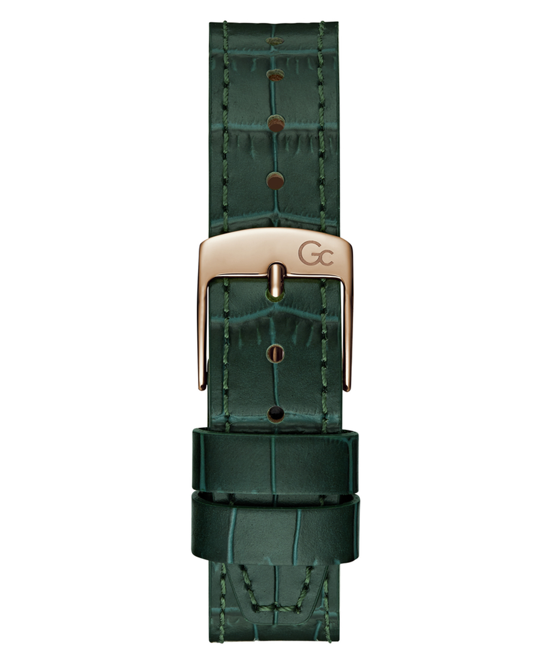 Жіночий наручний годинник GC Z25004L9MF. В годиннику встановлений надійний кварцевий механізм. Сталевий корпус, діаметром 34 мм, з покриттям золотистого кольору. Зелений шкіряний ремінець поєднується з зеленим аналоговим циферблатом. Безель прикрашений кристалами. Мерехтливі камінці виконують роль міток часу. Застібка - класичка пряжка, котра надійно фіксує годинник на руці. Водозахист 10 АТМ.