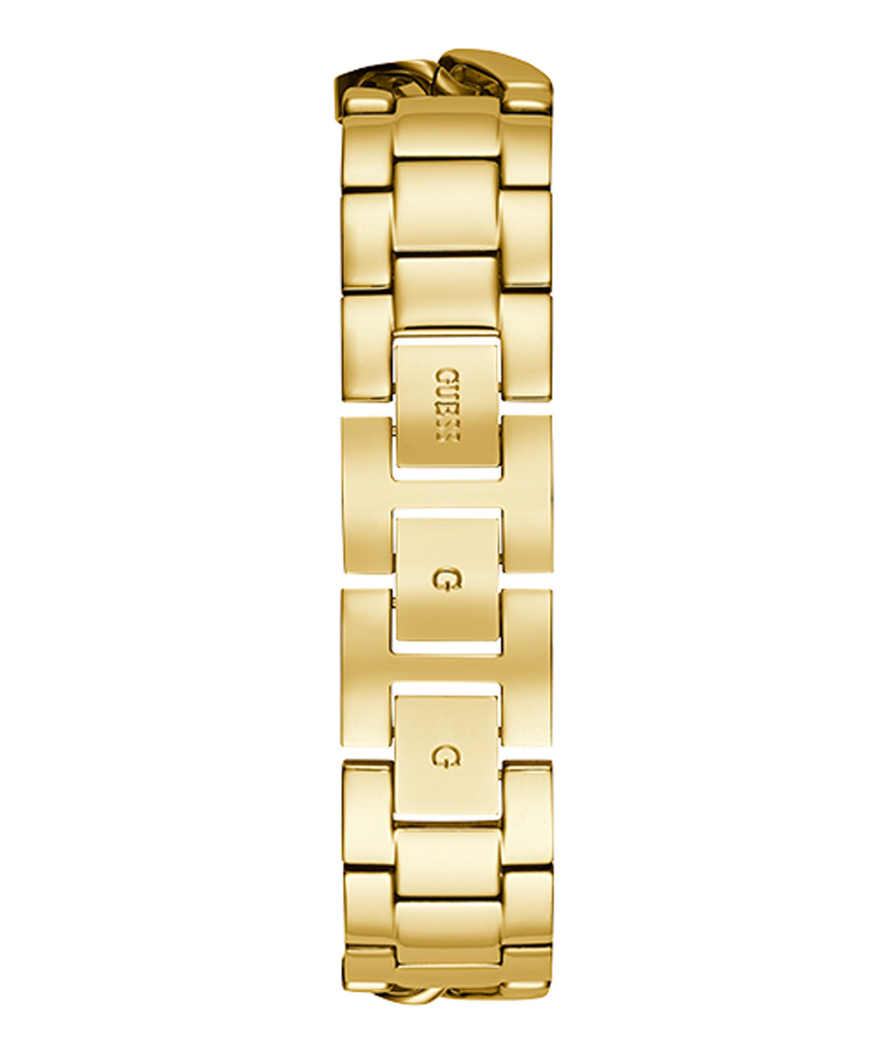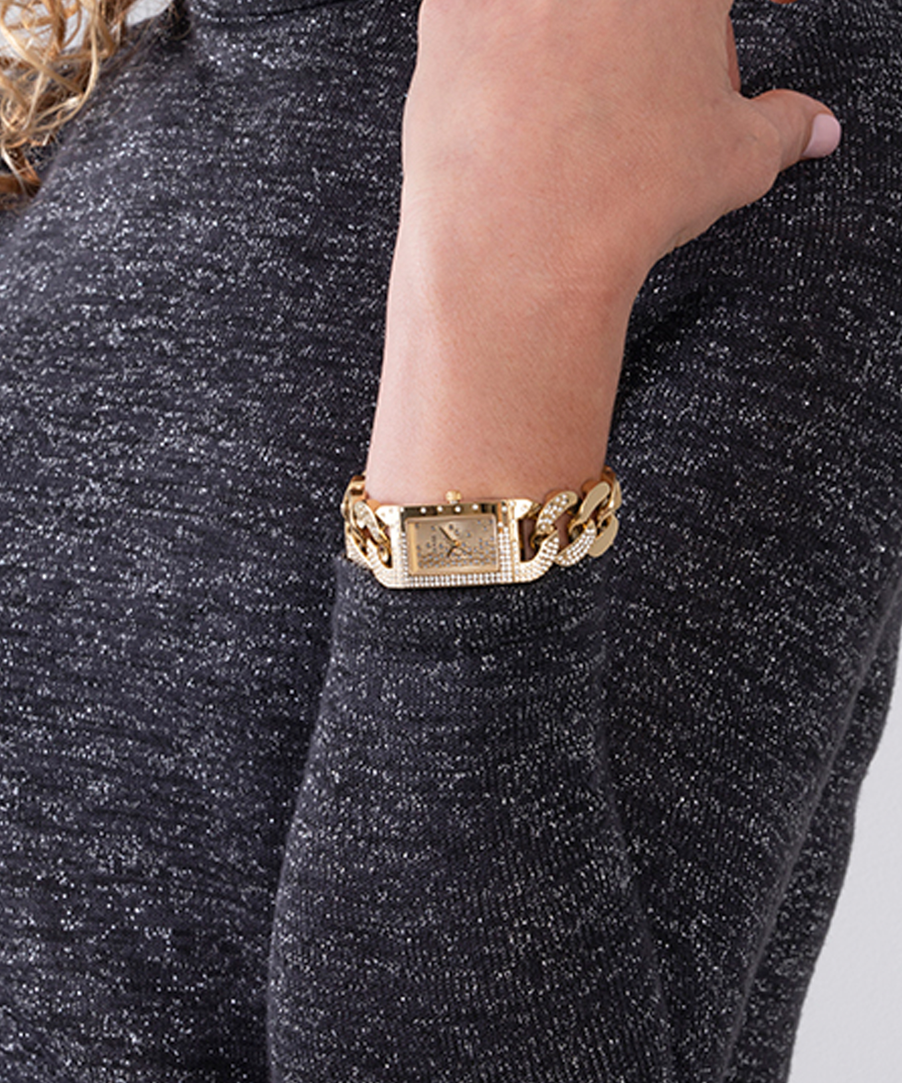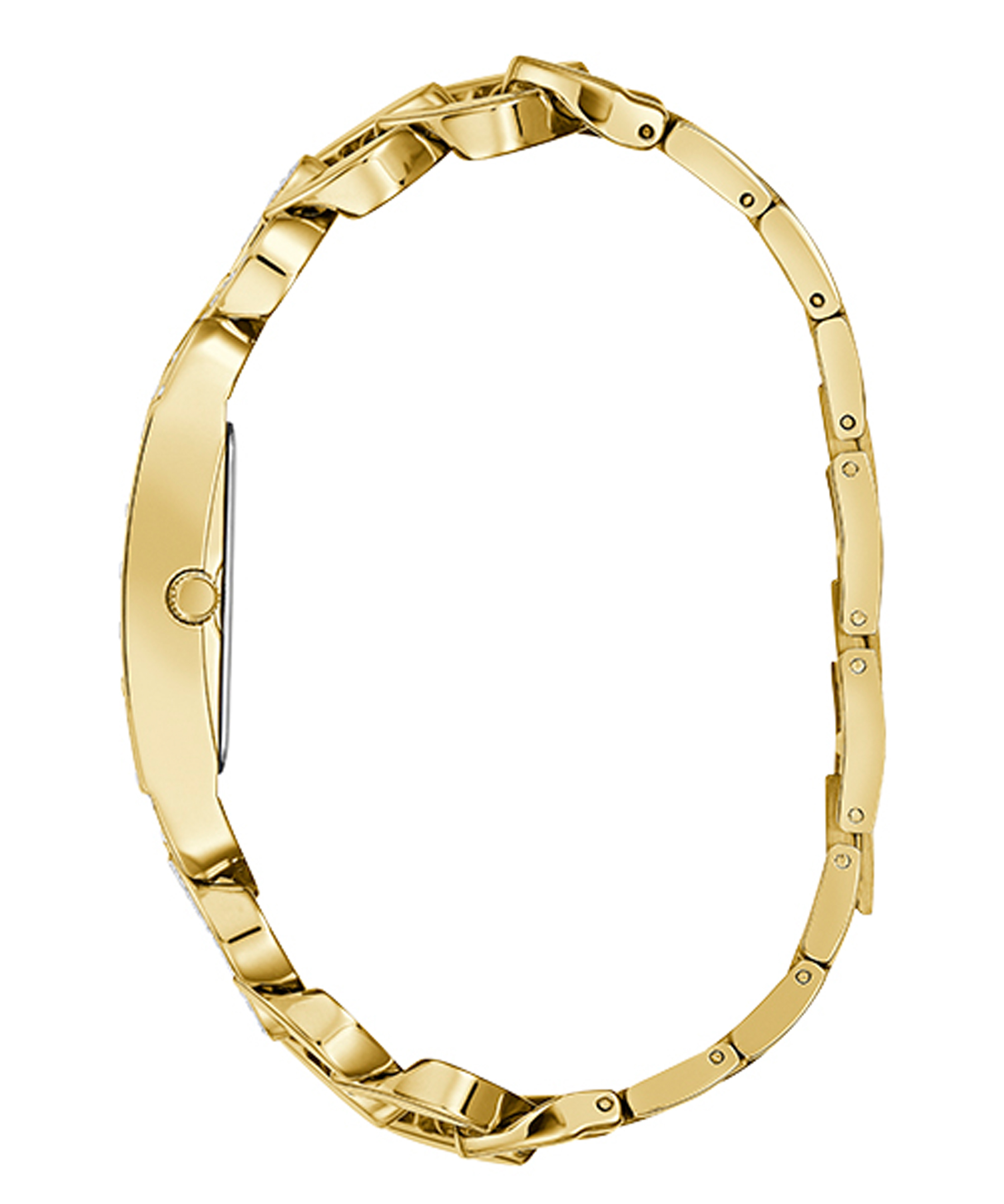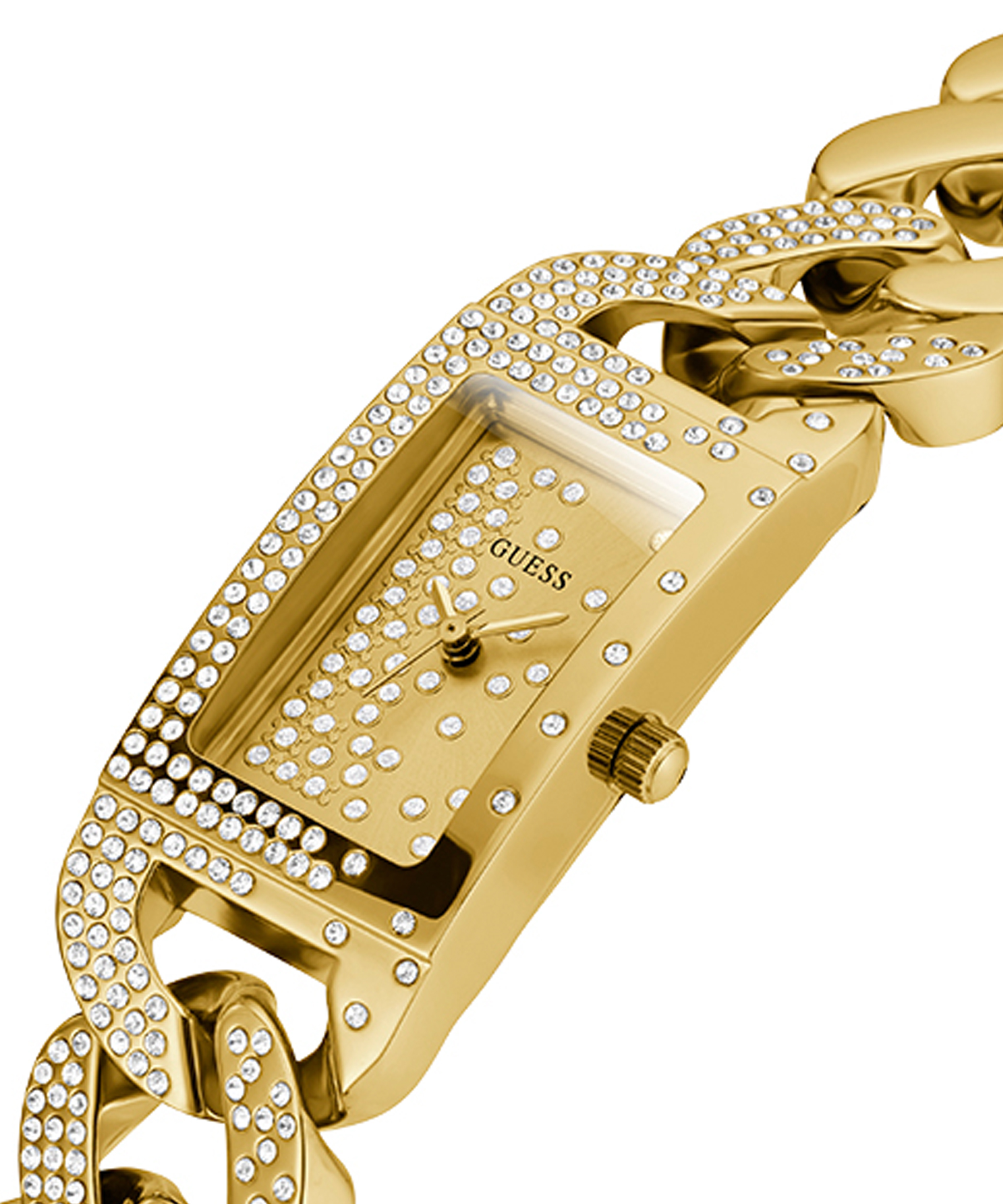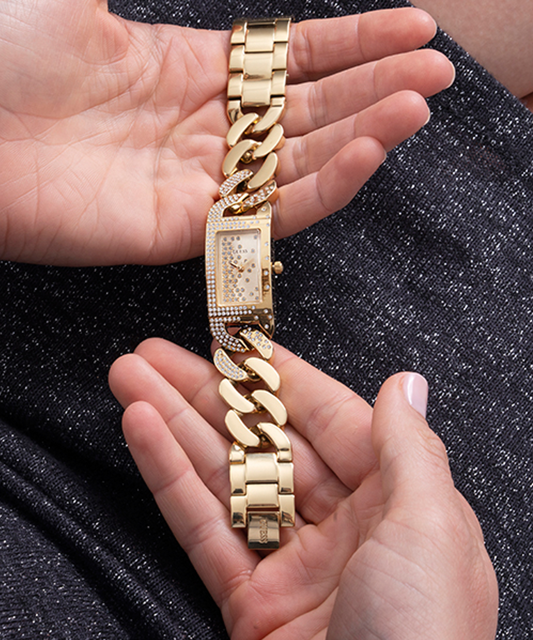 Дизайнерський годинник популярного американського бренду GUESS з колекції LADIES TREND з японським кварцовим механізмом Miyota приваблюють творчим рішенням модельєрів. Виготовлені зі сталі високої якості з PVD покриттям Gold, годинник щедро декорований кристалами, що іскряться, асиметрично розсипаними по циферблату, безелю і браслету. Витончена прямокутна форма корпусу плавно перетворюється на складне плетіння браслета, створюючи образ самостійної ювелірної прикраси. Стійке до механічних пошкоджень мінеральне скло захищає механізм від пошкоджень. Витонченість, естетика та якість аксесуара, перед якими не встоїть жодна стильна жінка.