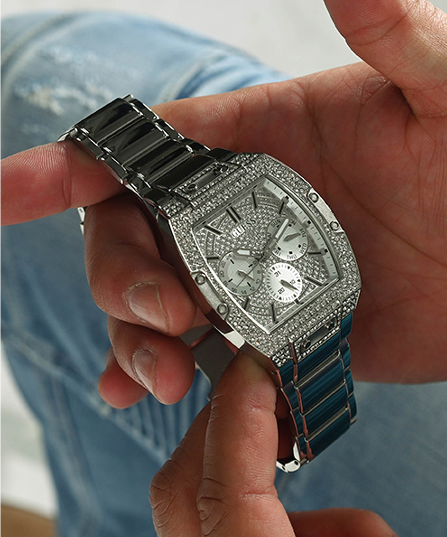 Оригінальний годинник чоловічий GUESS GW0094G1 з колекції MENS TREND. Корпус та браслет виконані зі сталі із покриттям Silver Tone. Розмір корпусу – 43 х 42,5 мм. Товщина корпусу – 10,45 мм. Ширина кріплення – 28 мм. Застібка – складана кліпса. Безель та циферблат декоровані кристалами. Водозахист – 5 АТМ.