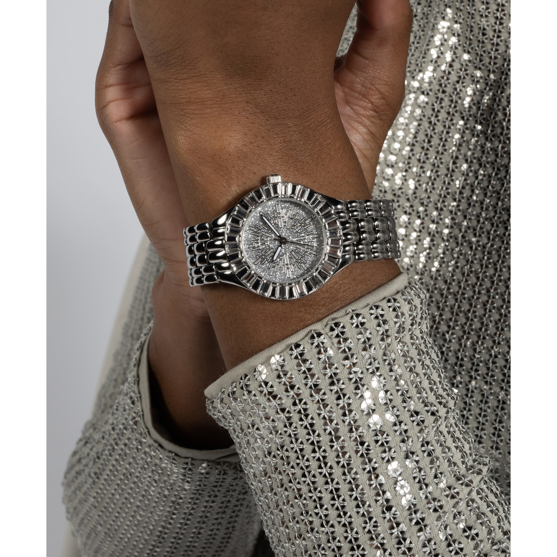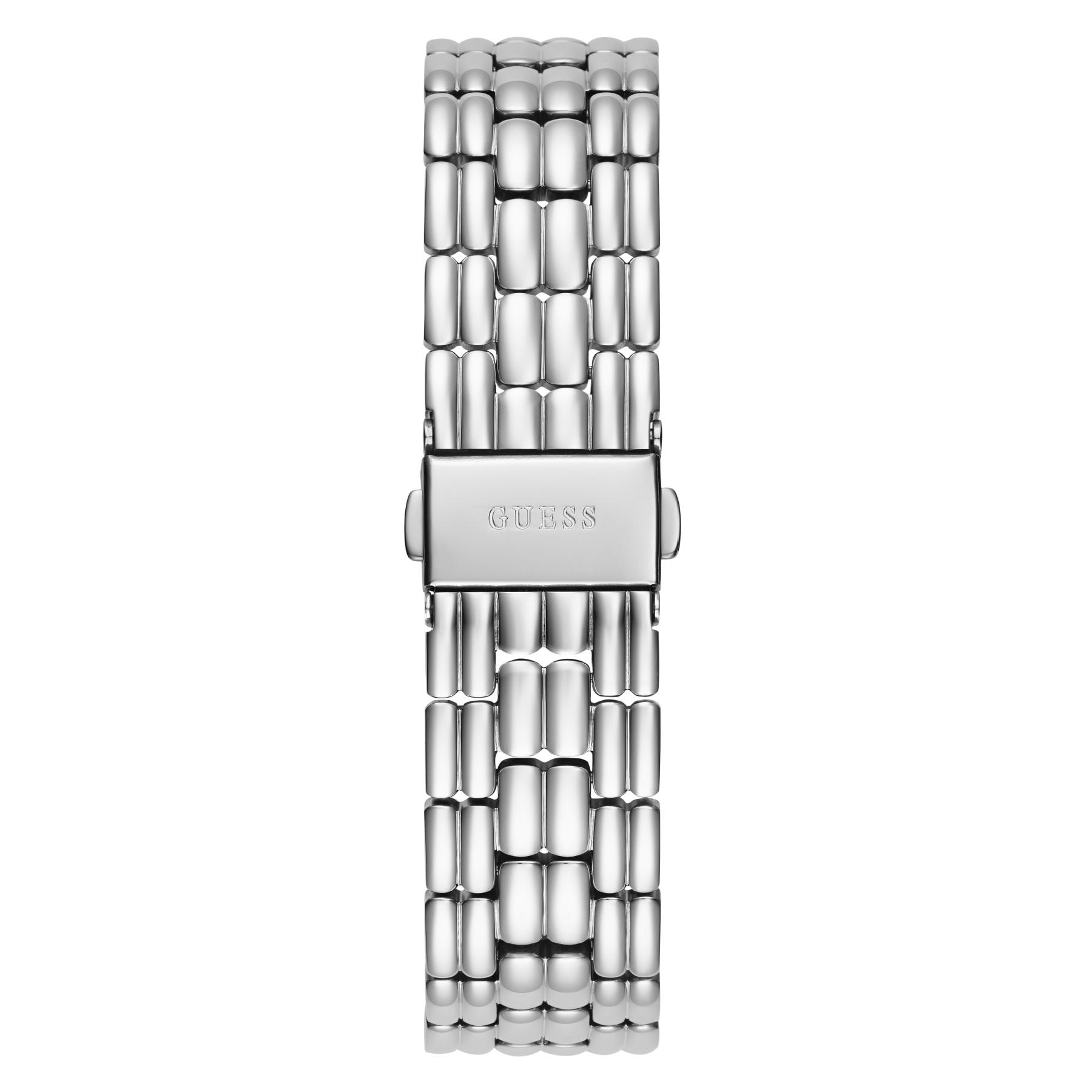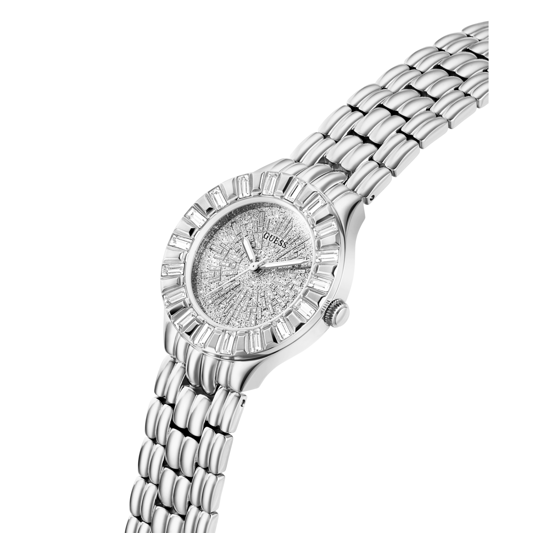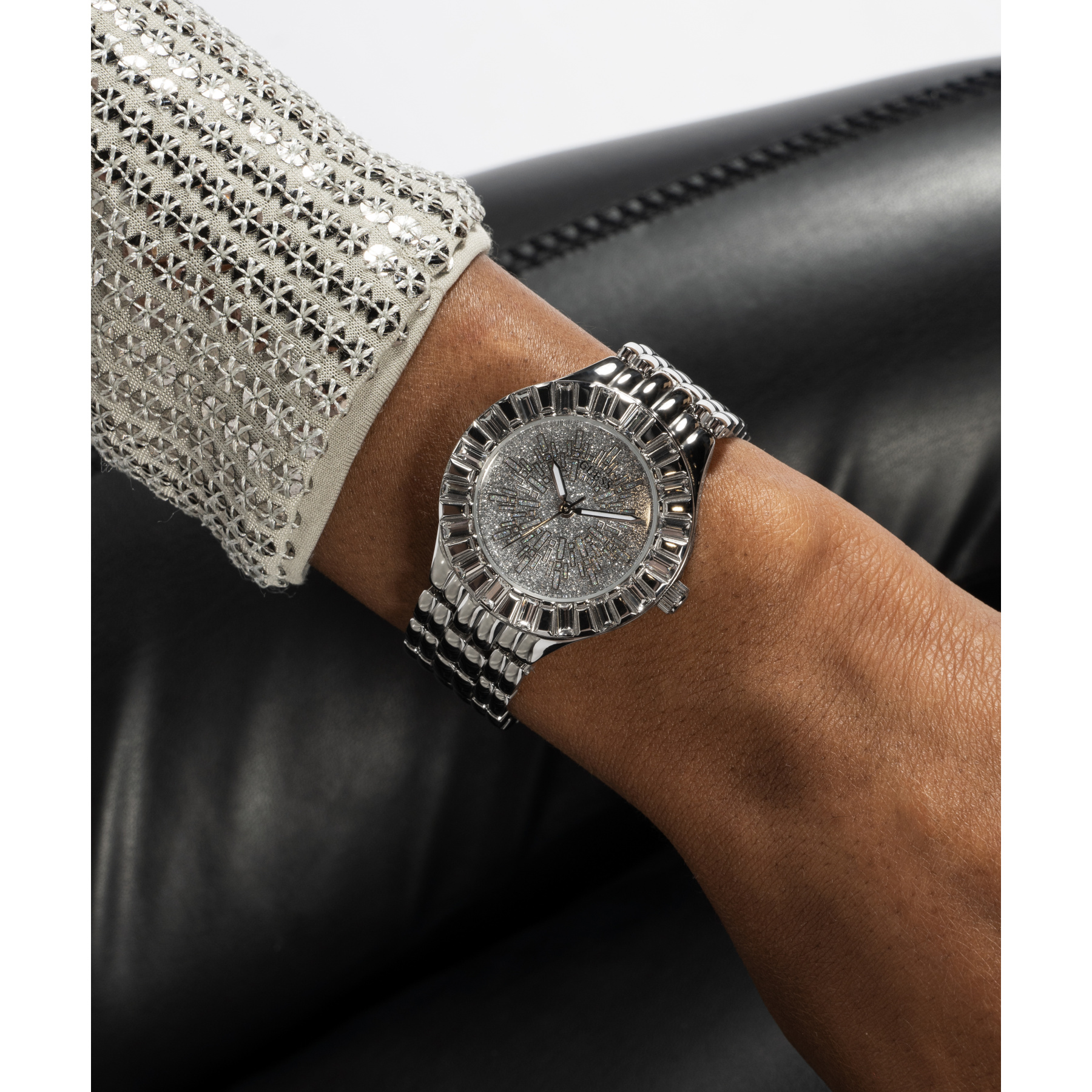 Жіночий наручний годинник GW0602L1 легендарного американського бренду Guess. У годиннику встановлено надійний кварцовий механізм Miyota. Сталеві корпус та браслет. Діаметр корпусу - 34 мм. Безель та аналоговий циферблат рясно прикрашені кристалами. Мінеральне скло захищає аксесуар від подряпин та механічних пошкоджень. Водозахист - 3 АТМ.