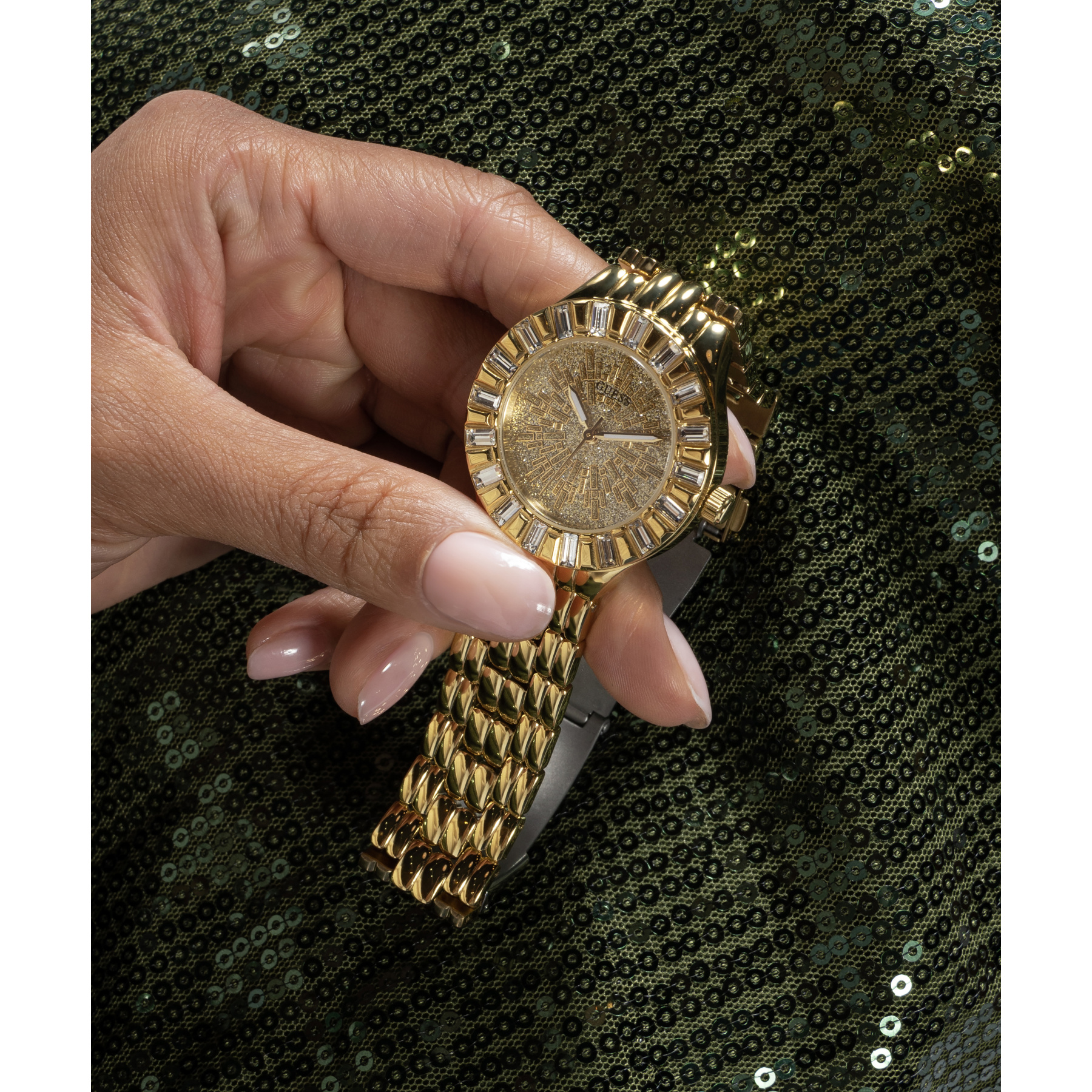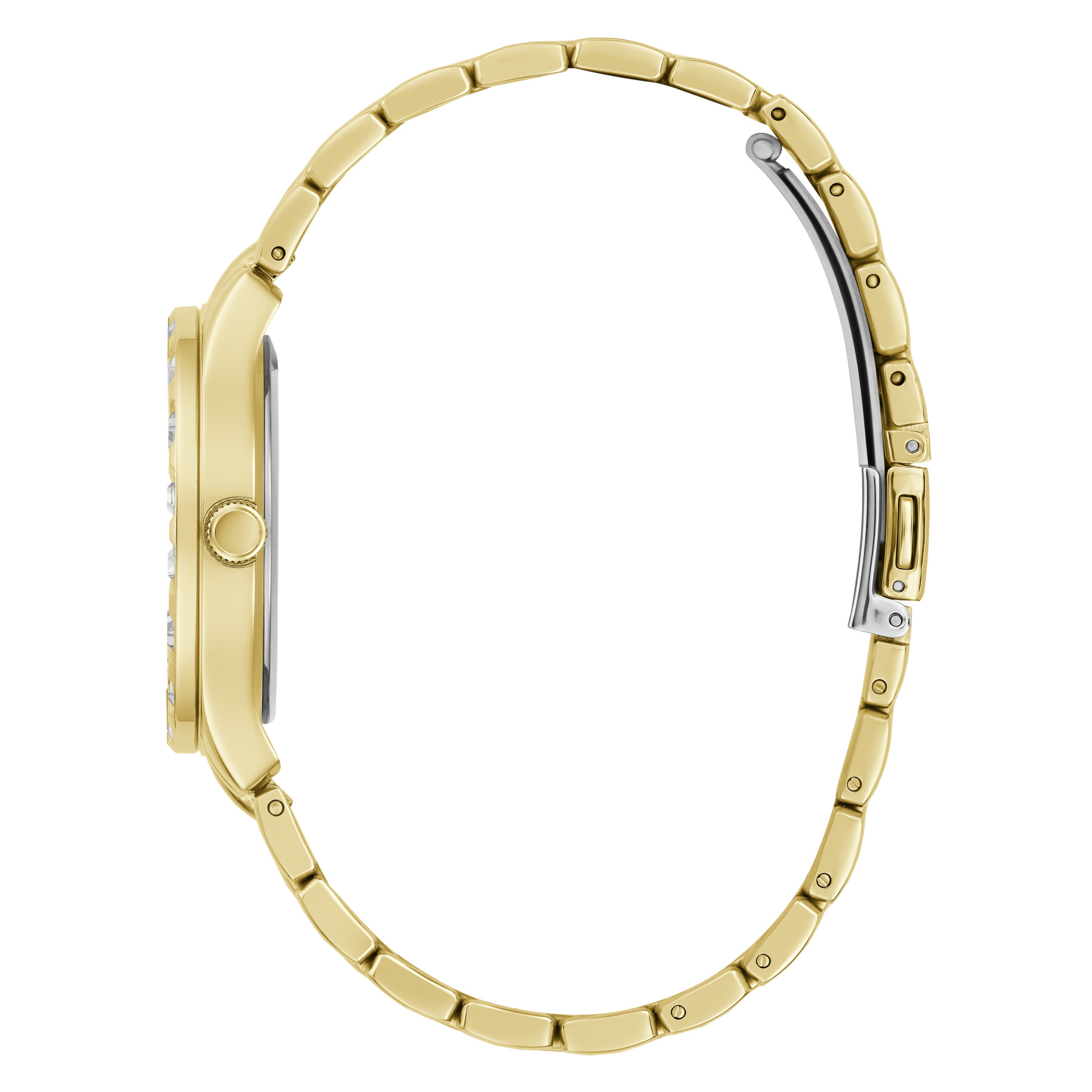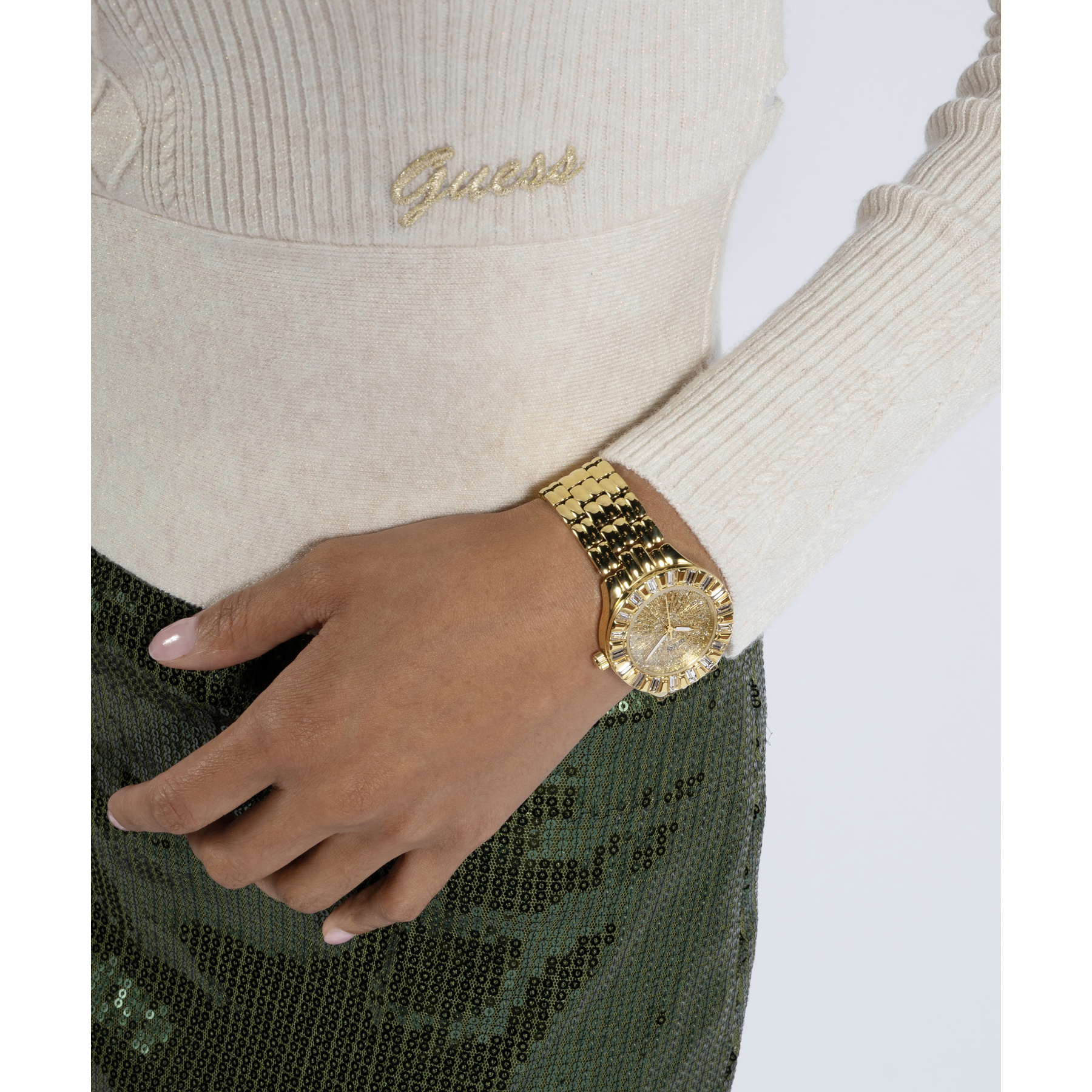 Жіночий наручний годинник GW0602L2 легендарного американського бренду Guess. У годиннику встановлено надійний кварцовий механізм Miyota. Сталеві з золотистим покриттям корпус та браслет. Діаметр корпусу - 34 мм. Безель та аналоговий циферблат рясно прикрашені кристалами. Мінеральне скло захищає аксесуар від подряпин та механічних пошкоджень. Водозахист - 3 АТМ.-