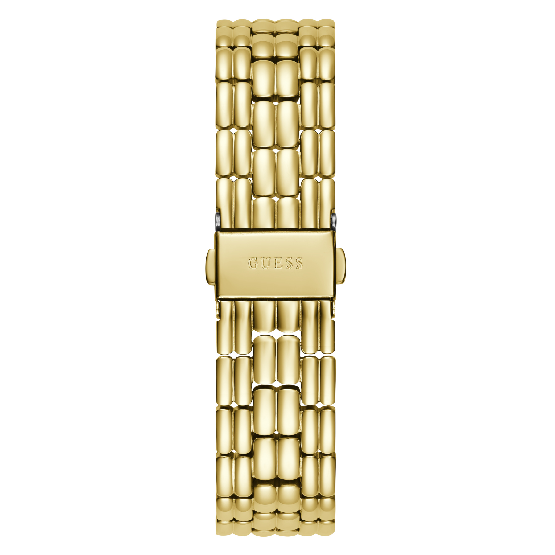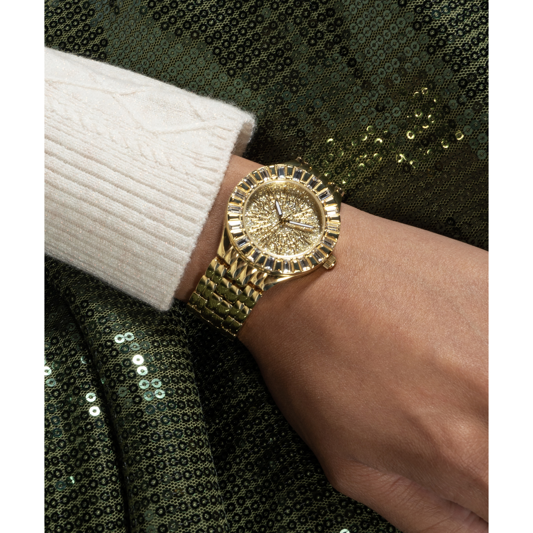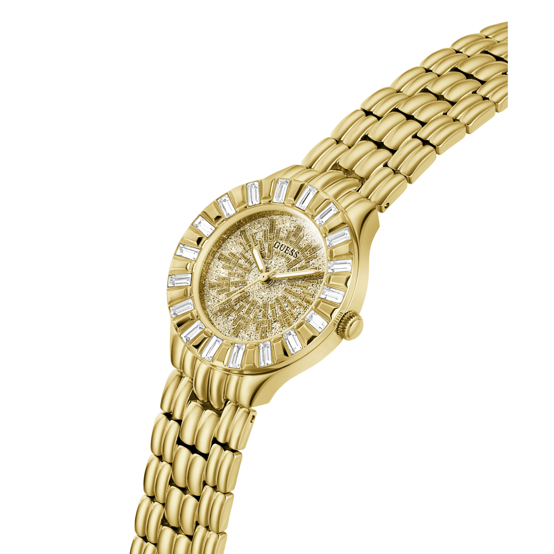 Жіночий наручний годинник GW0602L2 легендарного американського бренду Guess. У годиннику встановлено надійний кварцовий механізм Miyota. Сталеві з золотистим покриттям корпус та браслет. Діаметр корпусу - 34 мм. Безель та аналоговий циферблат рясно прикрашені кристалами. Мінеральне скло захищає аксесуар від подряпин та механічних пошкоджень. Водозахист - 3 АТМ.-